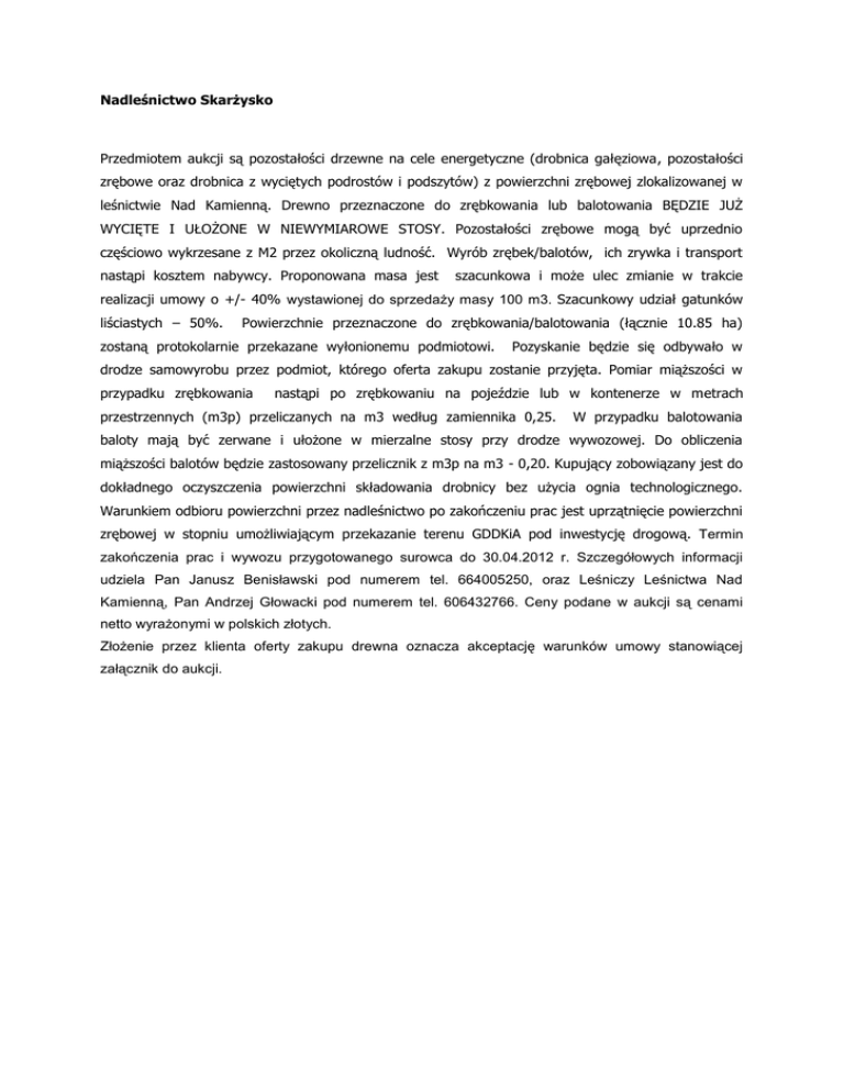 Nadleśnictwo Skarżysko Przedmiotem aukcji są pozostałości drzewne na cele energetyczne (drobnica gałęziowa, pozostałości zrębowe oraz drobnica z wyciętych podrostów i podszytów) z powierzchni zrębowej zlokalizowanej w leśnictwie Nad Kamienną. Drewno przeznaczone do zrębkowania lub balotowania BĘDZIE JUŻ WYCIĘTE I UŁOŻONE W NIEWYMIAROWE STOSY. Pozostałości zrębowe mogą być uprzednio częściowo wykrzesane z M2 przez okoliczną ludność. Wyrób zrębek/balotów, ich zrywka i transport nastąpi kosztem nabywcy. Proponowana masa jest szacunkowa i może ulec zmianie w trakcie realizacji umowy o +/- 40% wystawionej do sprzedaży masy 100 m3. Szacunkowy udział gatunków liściastych – 50%. Powierzchnie przeznaczone do zrębkowania/balotowania (łącznie 10.85 ha) zostaną protokolarnie przekazane wyłonionemu podmiotowi. Pozyskanie będzie się odbywało w drodze samowyrobu przez podmiot, którego oferta zakupu zostanie przyjęta. Pomiar miąższości w przypadku zrębkowania nastąpi po zrębkowaniu na pojeździe lub w kontenerze w metrach przestrzennych (m3p) przeliczanych na m3 według zamiennika 0,25. W przypadku balotowania baloty mają być zerwane i ułożone w mierzalne stosy przy drodze wywozowej. Do obliczenia miąższości balotów będzie zastosowany przelicznik z m3p na m3 - 0,20. Kupujący zobowiązany jest do dokładnego oczyszczenia powierzchni składowania drobnicy bez użycia ognia technologicznego. Warunkiem odbioru powierzchni przez nadleśnictwo po zakończeniu prac jest uprzątnięcie powierzchni zrębowej w stopniu umożliwiającym przekazanie terenu GDDKiA pod inwestycję drogową. Termin zakończenia prac i wywozu przygotowanego surowca do 30.04.2012 r. Szczegółowych informacji udziela Pan Janusz Benisławski pod numerem tel. 664005250, oraz Leśniczy Leśnictwa Nad Kamienną, Pan Andrzej Głowacki pod numerem tel. 606432766. Ceny podane w aukcji są cenami netto wyrażonymi w polskich złotych. Złożenie przez klienta oferty zakupu drewna oznacza akceptację warunków umowy stanowiącej załącznik do aukcji.