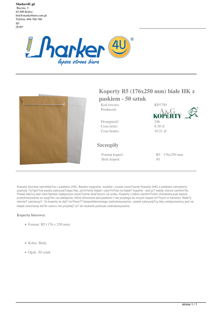 Marker4U.pl Boczna 5 62-800 Kalisz [email protected] Telefon: 884-760-760 gg: skype: Koperty B5 (176x250 mm) białe HK z paskiem - 50 sztuk Kod towaru: Producent: KP1750 Dostępność: Cena netto: Cena brutto: 24h 8.30 zł 10.21 zł Szczegóły Format kopert: Ilość kopert: B5 - 176x250 mm 50 Koperty biurowe samoklej?ce z paskiem (HK). Bardzo wygodne, szybkie i czyste rozwi?zanie Koperty (HK) z paskiem zamykamy poprzez ?ci?gni?cie paska zakrywaj?cego klej, za?o?enie klapki i zaci?ni?cie na klapk? koperty - jest ju? wtedy mocno zamkni?ta. Pasek klej?cy jest niew?tpliwie najlepszym rozwi?zanie dost?pnym na rynku. Koperty z takim zamkni?ciem charakteryzuje lepsze przechowywanie ze wzgl?du na zaklejenie, które chronione jest paskiem i nie przylega do innych kopert le??cych w kartonie. Nale?y równie? zaznaczy?, ?e koperty te daj? mo?liwo?? bezproblemowego zadrukowywania,- pasek zakrywaj?cy klej umiejscowiony jest na klapie otworowej dzi?ki czemu nie przyklej? si? do drukarki podczas zadrukowywania. Koperta biurowa: Format: B5 (176 x 250 mm) Kolor: Biały Opak. 50 sztuk strona 1 / 1 Powered by TCPDF (www.tcpdf.org)