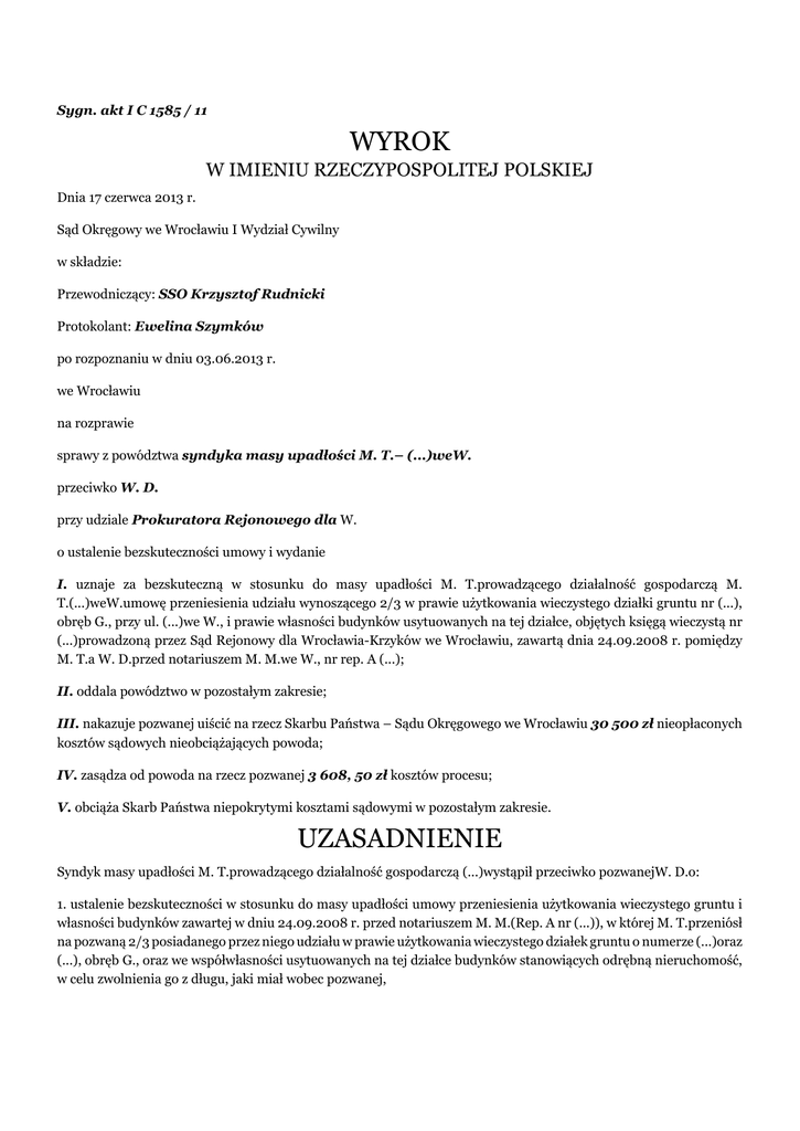Sygn. akt I C 1585 / 11 WYROK W IMIENIU RZECZYPOSPOLITEJ POLSKIEJ Dnia 17 czerwca 2013 r. Sąd Okręgowy we Wrocławiu I Wydział Cywilny w składzie: Przewodniczący: SSO Krzysztof Rudnicki Protokolant: Ewelina Szymków po rozpoznaniu w dniu 03.06.2013 r. we Wrocławiu na rozprawie sprawy z powództwa syndyka masy upadłości M. T.– (...)weW. przeciwko W. D. przy udziale Prokuratora Rejonowego dla W. o ustalenie bezskuteczności umowy i wydanie I. uznaje za bezskuteczną w stosunku do masy upadłości M. T.prowadzącego działalność gospodarczą M. T.(...)weW.umowę przeniesienia udziału wynoszącego 2/3 w prawie użytkowania wieczystego działki gruntu nr (...), obręb G., przy ul. (...)we W., i prawie własności budynków usytuowanych na tej działce, objętych księgą wieczystą nr (...)prowadzoną przez Sąd Rejonowy dla Wrocławia-Krzyków we Wrocławiu, zawartą dnia 24.09.2008 r. pomiędzy M. T.a W. D.przed notariuszem M. M.we W., nr rep. A (...); II. oddala powództwo w pozostałym zakresie; III. nakazuje pozwanej uiścić na rzecz Skarbu Państwa – Sądu Okręgowego we Wrocławiu 30 500 zł nieopłaconych kosztów sądowych nieobciążających powoda; IV. zasądza od powoda na rzecz pozwanej 3 608, 50 zł kosztów procesu; V. obciąża Skarb Państwa niepokrytymi kosztami sądowymi w pozostałym zakresie. UZASADNIENIE Syndyk masy upadłości M. T.prowadzącego działalność gospodarczą (...)wystąpił przeciwko pozwanejW. D.o: 1. ustalenie bezskuteczności w stosunku do masy upadłości umowy przeniesienia użytkowania wieczystego gruntu i własności budynków zawartej w dniu 24.09.2008 r. przed notariuszem M. M.(Rep. A nr (...)), w której M. T.przeniósł na pozwaną 2/3 posiadanego przez niego udziału w prawie użytkowania wieczystego działek gruntu o numerze (...)oraz (...), obręb G., oraz we współwłasności usytuowanych na tej działce budynków stanowiących odrębną nieruchomość, w celu zwolnienia go z długu, jaki miał wobec pozwanej, 2. ewentualnie uznanie za bezskuteczną w stosunku do masy upadłości wyżej opisanej umowy sprzedaży na podstawie art. 527 kc, 3. nakazanie pozwanej wydania mu opisanego wyżej udziału, oraz o zasądzenie na jego rzecz kosztów procesu. W uzasadnieniu pozwu syndyk wskazał, że postanowieniem z dnia 22.12.2009 r., VIII GU 142/09, Sąd Rejonowy dla Wrocławia - Fabrycznej we Wrocławiu ogłosił upadłość M. T.obejmującą likwidację jego majątku. Postanowienie to uprawomocniło się w dniu 19.01.2010 r. Jednocześnie Prokuratura Rejonowa W.prowadzi postępowanie przygotowawcze w sprawie o sygn. akt 1 Ds. 1725/09, w którym m.in. pozwanej W. D.postawiono zarzuty popełnienia przestępstwa przeciwko obrotowi gospodarczemu, a w szczególności działania na szkodę wierzycieli M. T.. Postępowanie kontrolne w zakresie rzetelności deklarowanych podstaw opodatkowania oraz obliczenia i wpłacani należnego podatku prowadzi także Urząd Kontroli Skarbowej we W.. Dalej syndyk wskazał, że w dniu 27.03.2007 r. została zawarta przedwstępna umowa sprzedaży prawa wieczystego użytkowania nieruchomości składającej się z działek o numerach (...)oraz posadowionych na niej budynków, położonej przy ul. (...)we W.. Sprzedającymi byli E.i R. Z. (1), po stronie kupującego występował M. T.reprezentowany przez A. D. (1). Umowa przyrzeczona miała być zawarta do dnia 15.12.2007 r., a cena nabycia działek wynosiła 1 850 000 zł i miała być płatana w czterech ratach. Następnie w dniu 14.12.2007 r. została zawarta umowa rozporządzająca, przy czym nabywcą 1/3 udziału była pozwana W. D., a 2/3 udziału nabył M. T.(w jego imieniu ponownie występował pełnomocnik A. D. (1)). W umowie strony oświadczyły, że z ceny 1 830 000 zł została zapłacona kwota 1 760 000 zł, a pozostałe 70 000 zł miało zostać zapłacone do dnia 18.12.2007 r. Tego samego dnia M. T.i W. D.zawarli przedwstępną umowę sprzedaży 2/3udziału w opisanej nieruchomości na rzecz nabywcy W. D.. Strony ustaliły cenę sprzedaży w wysokości 1 980 000 zł. W dniach 14 i 17.12.2007 r. pozwana przekazała na rachunek R. Z. (1)łącznie kwotę 222 500 zł. Po upływie niespełna roku, w dniu 24.09.2008 r. strony zawarły umowę rozporządzającą. We wstępnej części umowy strony oświadczyły, że W. D.na podstawie umowy z dnia 16.05.2007 r. pożyczyła M. T.1 220 000 zł, która to kwota miała zostać zwrócona pozwanej do dnia 15.05.2008 r. Strony zapisały w umowie także, że M. T.pożyczonej kwoty pozwanej nie zwrócił oraz, że przedmiotowa umowa zawarta została w celu zwolnienia go z długu wobec pozwanej. Dalej powód podał, że M. T.posiadał rachunek bankowy w Banku (...) S.A.oraz rachunek w Banku (...) S.A.W dniu 26.03.2007 r. wpłacił na rachunek w banku (...) S.A.250 000 zł i w tym samym dniu kwotę tę przelał na rachunek w Banku (...), z kolei w dniu 27.03.2007 r. z rachunku w banku (...) S.A.przelał 250 000 zł na rachunek państwa Z.. Następnie w dniu 03.04.2007 r. na rachunek w Banku (...) S.A.M. T.wpłacił 320 000 zł i w tym samym dniu na rachunek R. Z. (1)przelał 300 000 zł w tytule wskazując, że wplata dotyczy II raty za nieruchomość położoną przy ul. (...). W dniu 11.05.2007 r. M. T.wpłacił 900 000 zł na rachunek w Banku (...)i tego samego dnia przelał ją na rachunek małżonków Z.opisując, że dotyczy ona III raty za nieruchomość przy ul. (...). Ogółem na rzecz państwa Z.M. T.przekazał kwotę 1 450 000 zł. Z kolei pozwana W. D.w dniach 14 i 17.12.2007 r. dokonała na rzecz państwa Z.przelewu 222 500 zł. Brakująca kwota w związku z umową między M. T.a małżeństwem Z.w wysokości 157 500 zł została, zdaniem syndyka, rozliczona w ten sposób, że w dniu 13.12.2007 r. małżonkowie Z.zawarli z M. T.przedwstępną umowę sprzedaży lokalu, mieszkalnego na mocy której M. T.zobowiązał się do wybudowania na działce numer (...), obręb I., budynku wielomieszkaniowego, u