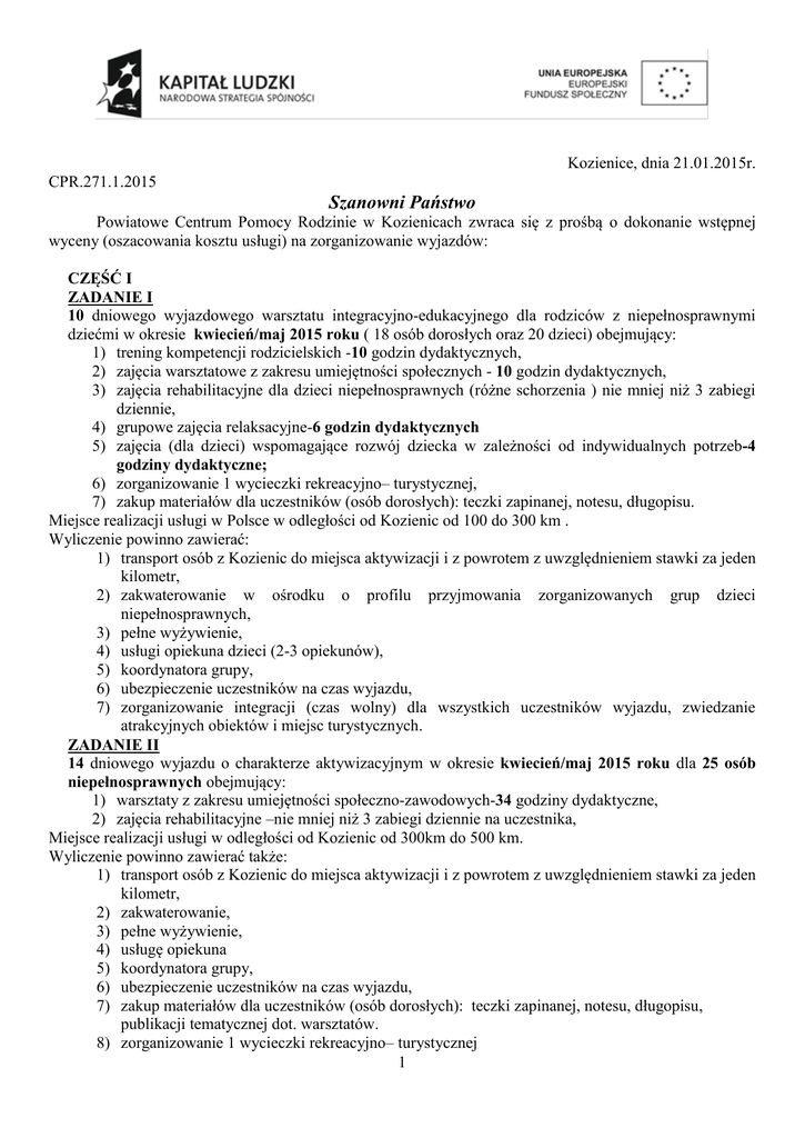 Kozienice, dnia 21.01.2015r. CPR.271.1.2015 Szanowni Państwo Powiatowe Centrum Pomocy Rodzinie w Kozienicach zwraca się z prośbą o dokonanie wstępnej wyceny (oszacowania kosztu usługi) na zorganizowanie wyjazdów: CZĘŚĆ I ZADANIE I 10 dniowego wyjazdowego warsztatu integracyjno-edukacyjnego dla rodziców z niepełnosprawnymi dziećmi w okresie kwiecień/maj 2015 roku ( 18 osób dorosłych oraz 20 dzieci) obejmujący: 1) trening kompetencji rodzicielskich -10 godzin dydaktycznych, 2) zajęcia warsztatowe z zakresu umiejętności społecznych - 10 godzin dydaktycznych, 3) zajęcia rehabilitacyjne dla dzieci niepełnosprawnych (różne schorzenia ) nie mniej niż 3 zabiegi dziennie, 4) grupowe zajęcia relaksacyjne-6 godzin dydaktycznych 5) zajęcia (dla dzieci) wspomagające rozwój dziecka w zależności od indywidualnych potrzeb-4 godziny dydaktyczne; 6) zorganizowanie 1 wycieczki rekreacyjno– turystycznej, 7) zakup materiałów dla uczestników (osób dorosłych): teczki zapinanej, notesu, długopisu. Miejsce realizacji usługi w Polsce w odległości od Kozienic od 100 do 300 km . Wyliczenie powinno zawierać: 1) transport osób z Kozienic do miejsca aktywizacji i z powrotem z uwzględnieniem stawki za jeden kilometr, 2) zakwaterowanie w ośrodku o profilu przyjmowania zorganizowanych grup dzieci niepełnosprawnych, 3) pełne wyżywienie, 4) usługi opiekuna dzieci (2-3 opiekunów), 5) koordynatora grupy, 6) ubezpieczenie uczestników na czas wyjazdu, 7) zorganizowanie integracji (czas wolny) dla wszystkich uczestników wyjazdu, zwiedzanie atrakcyjnych obiektów i miejsc turystycznych. ZADANIE II 14 dniowego wyjazdu o charakterze aktywizacyjnym w okresie kwiecień/maj 2015 roku dla 25 osób niepełnosprawnych obejmujący: 1) warsztaty z zakresu umiejętności społeczno-zawodowych-34 godziny dydaktyczne, 2) zajęcia rehabilitacyjne –nie mniej niż 3 zabiegi dziennie na uczestnika, Miejsce realizacji usługi w odległości od Kozienic od 300km do 500 km. Wyliczenie powinno zawierać także: 1) transport osób z Kozienic do miejsca aktywizacji i z powrotem z uwzględnieniem stawki za jeden kilometr, 2) zakwaterowanie, 3) pełne wyżywienie, 4) usługę opiekuna 5) koordynatora grupy, 6) ubezpieczenie uczestników na czas wyjazdu, 7) zakup materiałów dla uczestników (osób dorosłych): teczki zapinanej, notesu, długopisu, publikacji tematycznej dot. warsztatów. 8) zorganizowanie 1 wycieczki rekreacyjno– turystycznej 1 9) zagospodarowanie czasu wolnego poprzez np. zorganizowanie 1 ogniska, zwiedzanie okolicznych obiektów i miejsc turystycznych. CZĘŚĆ II Zadanie 1 4 dniowy wyjazd o charakterze aktywizacyjno-edukacyjnym w okresie kwiecień/maj 2015 roku dla 6 osób dorosłych i 12 dzieci w wieku od 12 do 17 lat z rodzin zastępczych obejmujący: Dla osób dorosłych 1) warsztaty z zakresu kompetencji rodzicielskich -16 godzin dydaktycznych; 2) grupowe warsztaty integracyjne (wszyscy uczestnicy)-5 godzin dydaktycznych; 3) zakup tematycznych publikacji (książek) dla uczestników wyjazdu oraz teczki zapinanej, zeszytu, długopisu. Dla wychowanków rodzin zastępczych Warsztaty terapeutyczne -8 godzin dydaktycznych, Warsztat integracyjny dla wszystkich uczestników ( gry, zabawy, konkursy ) - 4 godziny dydaktyczne. Miejsce realizacji usługi w odległości od Kozienic od 100 do 300 km. Wyliczenie powinno zawierać także: 1) transport osób z Kozienic do miejsca aktywizacji i z powrotem z uwzględnieniem stawki za jeden kilometr, 2) zakwaterowanie, 3) pełne wyżywienie, 4) usługę opiekuna/ animatora czasu wolnego 5) koordynatora grupy, 6) ubezpieczenie uczestników na czas wyjazdu, 7) zwiedzanie okolicznych obiektów i miejsc turystycznych. Zadanie 2 4 dniowy wyjazd o charakterze edukacyjno-poznawczym w okresie kwiecień/maj 2015 roku dla 8 osób usamodzielnianych wychowanków rodzin zastępczych obejmujący: 1) warsztaty z zakresu umiejętności społecznych -15 godzin dydaktycznych 2) warsztaty w zakresie pozyskiwania funduszy europejskich /zakładanie własnej działalności gospodarczej -12 godzin dydaktycznych, 3) grupowe doradztwo zawodowe-8 godzin dydaktycznych; 4) zakup przez Wykonawcę dla uczestnika podręcznika tematycznego, teczki zapinanej, zeszytu, długopisu. Miejsce realizacji usługi od Kozienic od 100km do 300 km. Wyliczenie powinno zawierać także: 1) transport osób z Kozienic do miejsca aktywizacji i z powrotem z uwzględnieniem stawki za jeden kilometr, 2) zakwaterowanie, 3) pełne wyżywienie, 4) usługę opiekuna/animatora czasu wolnego 5) koordynatora grupy; 6) ubezpieczenie uczestników na czas wyjazdu, 7) zwiedzanie okolicznych obiektów i miejsc turystycznych. Przy wyliczaniu kosztów usługi proszę o podanie ceny jednostkowej (osobo/dzień) przypadającej na jednego uczestnika usługi dziecko oraz na osobę dorosłą danego zadania. Informację prosimy przesłać na adres email: [email protected] lub drogą listowną na adres Powiatowe Centrum Pomocy Rodzinie w Kozienicach, ul. Kochanowskiego 15, 26-900 Kozienice do dnia 02.02.2015r. Dziękujemy za odpowiedź. Z poważaniem Dyrektor PCPR 2