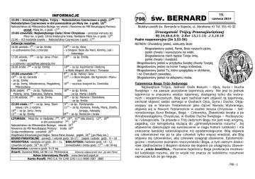 INFORMACJE 30 15.06 – Uroczystość Najśw. Trójcy - Nabożeństwo Czerwcowe o godz. 17 Nabożeństwo Czerwcowe w dni powszednie po Mszy św. o godz. 1830 Nabożeństwa do Miłosierdzia Bożego we wtorki i Nowenna do MB Nieustającej Pomocy przed Mszą św. o godz. 1745 19.06 czwartek: Najświętszego Ciała i Krwi Chrystusa – procesja wyruszy po Mszy św. o godz. 10-tej tradycyjna trasą. Następna Msza św. o godz. 1230 22.06 – XII niedziela zwykła - Nabożeństwo Czerwcowe o godz. 1730 Intencje mszalne: 16.06 poniedz. 730 – za śp. Emilię 1800 – za śp. Alinę - o uzdrowienie Ewy z choroby - o błogosł. Boże dla Marii, Kimmo, Julii i Antoniego 17.06 wtorek.: 700 – za śp. Jana i Fran1800 – za śp. Emilię ciszkę - o zdrowie i szczęśliwą operację Ani 18.06 środa: 700 – za śp. Emilię 1800 – za śp. Kazimierza i Rodzinę - o Boże błogosł. dla Anny i Tomasza 19.06 czwartek: 730 --900 – za śp. Halinę i Jana 1000 – za śp. Gerarda 1230 – o Boże błogosł. dla Agnieszki i Mariu- za śp. Emilię sza - za śp. Irenę, Włodzimierza, Magdalenę, 1800 – rocznica święceń ks. Dominika Mieczysława 20.06 piątek: 700 - za śp. Tadeusza, 1800 – za śp. Emilię Helenę, Jana, Tadeusza, Stefana, Anielę - za śp. Martę i Adolfa 21.06 sobota: 700 - za śp. Emilię 1800 – za śp. Mariana i Stanisławę - za śp. Emilię 22.06 niedz.: 730 – za śp. Jana, Stani900 – za śp.. Ferdynanda sławę i zm. z rodziny 1115 – za śp. Romana, Anielę, Marię, Józefa, 1000 – za śp. Jana i Annę Jerzego, Adelajdę 1230 – za śp. Emilię 1800 – za śp. Rodziców i brata LITURGIA: Msze św. w niedzielę: 730, 900, 10oo, 1115 (dla dzieci), 1230, 1800 w dni powszednie: 700, 1800 Nabożeństwo do Miłosierdzia Bożego: wtorek 1830 Nowenna do MB Nieustającej Pomocy: środa 1830 Grupa modlitewna: czwartek 2000 Wspólnota Intronizacyjna Najśw. Serca Pana Jezusa: piątek 18 30 (po Mszy św.) BIURO PARAFIALNE: poniedz. i wtorek godz. 16-17; piątek i sobota godz. 9 – 10 WIDEOTEKA: niedziela od godz. 10 – 11, BIBLIOTEKA: niedziela godz. 10 - 12 czwartek od godz. 1830 do 1900. poniedziałek i środa godz. 1730 – do 18-tej Kawiarenka: czynna w godz. 9-13-tej Zmarli: Zuzanna Biblis, lat 86 z ul. Mickiewicza Wieczny odpoczynek racz jej dać Panie Adres internetowy Parafii: www.bernard.sopot.pl Konto Parafii: PKO S.A. 54 1240 1242 1111 0000 1587 2885 708 św. BERNARD 15. czerwca 2014 Biuletyn parafii św. Bernarda w Sopocie, ul. Abrahama 41 Tel. 551-41-32 Uroczystość Trójcy Przenajświętszej Wj 34,4b-6,8-9; 2 Kor 13,11-13; J 3,16-18 Psalm responsoryjny (Dn 3,52-56) REFREN: Chwalebny jesteś, wiekuisty Boże Błogosławiony jesteś, Panie, Boże naszych ojców, pełen chwały i wywyższony na wieki. Błogosławione niech będzie Twoje imię, pełne chwały i świętości. Błogosławiony jesteś w przybytku świętej chwały Twojej, Błogosławiony jesteś na tronie Twego królestwa. Błogosławiony jesteś Ty, który spoglądasz w otchłanie, i na Cherubach zasiadasz, Błogosławiony jesteś na sklepieniu nieba. Tajemnica Boga Trój-Jedynego Najświętsza Trójca, Jedność Osób Bożych – Ojca, Syna i Ducha Świętego – na zawsze pozostanie tajemnicą wiary. Nie jest to jednak tajemnica w znaczeniu wiedzy tajemnej, dostępnej tylko dla wybranych i wtajemniczonych. Bóg sam zechciał nam objawić tę tajemnicę, zechciał objawić siebie samego w Osobach Ojca, Syna i Ducha. Objawiający się w Starym Testamencie jako Ojciec Narodu Wybranego, objawia się w Nowym Testamencie w osobie Jezusa Chrystusa – Jednorodzonego Syna Bożego, Boga – Człowieka, Zbawiciela świata a po Wniebowstąpieniu Chrystusa, w Osobie Ducha Świętego – Pocieszyciela i Uświęciciela. Ta prawda o Trój-Jedynym Bogu nie jest więc enigmą, zagadką, czy łamigłówką służącą do „gimnastykowania rozumu”. Jej objawienie dokonujące się sukcesywnie w ciągu historii ludzkości i ma znaczenie bardziej soteriologiczne niż epistemologiczne. Bóg objawia się człowiekowi nie po to aby człowiek tylko więcej wiedział, ale Bóg objawia się człowiekowi, aby człowiek osiągnął zbawienie. Epistemologiczne i mistyczne poznanie rzeczywistości Boga, a tym samym doskonałe zjednoczenie z Bogiem dokona się dopiero po osiągnięciu zbawienia w „visio beatifica„. Poznanie tajemnicy Boga przekracza możliwości ludzkiego rozumu, ale to wcale nie znaczy że ludzkiemu rozumowi zaprzecza lub że go neguje. 708 - 1 Bóg objawia się człowiekowi, jako kochający Ojciec Stwórca, jako zbawiający Syn Boży, Bóg Człowiek i jako uświęcający Duch Święty Pocieszyciel. I nie to jest dla nas ważne, jakie są wewnętrzne relacje w Trójcy Świętej, ale to, że Bóg nas kocha, że pragnie nas zbawić i uświęcić, że pragnie nam siebie udzielić. Nie traćmy może czasu na próby pojęcia naszym rozumem tej tajemnicy ….. i poświęćmy go raczej na szukanie sposobów zbawienia, a nie zrozumienia tego co i tak zostanie nam w pełni objawione w życiu przyszłym … o ile tam dotrzemy? Wierzę w Jednego Boga; - Boga Ojca – Wszechmogącego, - Jezusa Chrystusa – Syna Jego Jedynego - i Ducha Św. – Pocieszyciela i Uświęciciela http://kazania.wordpress.com Procesja Bożego Ciała W bieli sukien, ubranek, w komeżkach, wstążkach, w wypchanych poduszkach z Sercem Jezusowym, w figurkach, łopocie chorągwi, świecami, habitach, pod niebieskim baldachimem, w złotej monstrancji, w uśmiechu Po ulicach idzie Pan i błogosławi każdy narożnik, okno, twarz. Niektórzy wracają od ołtarzy z zielonymi gałązkami, inni zbierają zdeptane kwiatki z asfaltu i zakurzonymi, przepoconymi pięściami biją się w piersi tak, że w spokojnych wieżach grają dzwony i niesie się echo od serca do serca... Andrzej Sikorski Myśl na każdy dzień DATA Patron dnia 16.06 pn Słyszeliście, że powiedziano: Oko za oko i ząb za ząb! A Ja wam powia- dam: Nie stawiajcie oporu złemu.