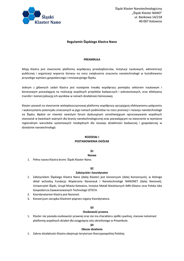 Regulaminem Klastra - Śląski Klaster NANO