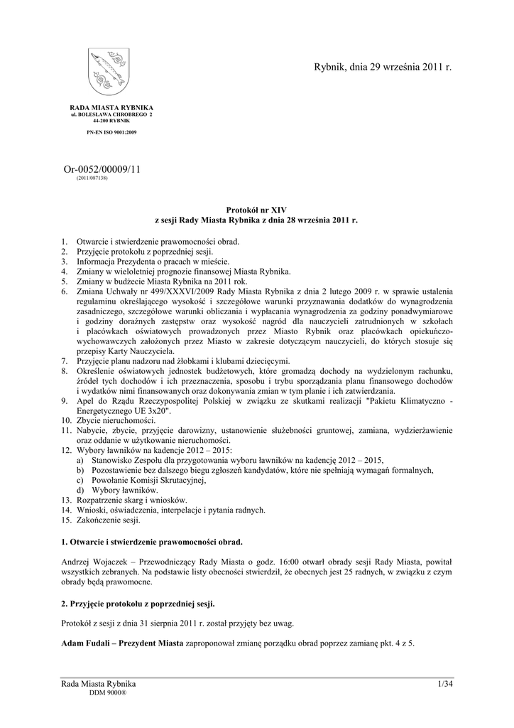 Rybnik, dnia 29 września 2011 r. RADA MIASTA RYBNIKA ul. BOLESŁAWA CHROBREGO 2 44-200 RYBNIK PN-EN ISO 9001:2009 Or-0052/00009/11 (2011/087138) Protokół nr XIV z sesji Rady Miasta Rybnika z dnia 28 września 2011 r. 1. 2. 3. 4. 5. 6. 7. 8. 9. 10. 11. 12. 13. 14. 15. Otwarcie i stwierdzenie prawomocności obrad. Przyjęcie protokołu z poprzedniej sesji. Informacja Prezydenta o pracach w mieście. Zmiany w wieloletniej prognozie finansowej Miasta Rybnika. Zmiany w budżecie Miasta Rybnika na 2011 rok. Zmiana Uchwały nr 499/XXXVI/2009 Rady Miasta Rybnika z dnia 2 lutego 2009 r. w sprawie ustalenia regulaminu określającego wysokość i szczegółowe warunki przyznawania dodatków do wynagrodzenia zasadniczego, szczegółowe warunki obliczania i wypłacania wynagrodzenia za godziny ponadwymiarowe i godziny doraźnych zastępstw oraz wysokość nagród dla nauczycieli zatrudnionych w szkołach i placówkach oświatowych prowadzonych przez Miasto Rybnik oraz placówkach opiekuńczowychowawczych założonych przez Miasto w zakresie dotyczącym nauczycieli, do których stosuje się przepisy Karty Nauczyciela. Przyjęcie planu nadzoru nad żłobkami i klubami dziecięcymi. Określenie oświatowych jednostek budżetowych, które gromadzą dochody na wydzielonym rachunku, źródeł tych dochodów i ich przeznaczenia, sposobu i trybu sporządzania planu finansowego dochodów i wydatków nimi finansowanych oraz dokonywania zmian w tym planie i ich zatwierdzania. Apel do Rządu Rzeczypospolitej Polskiej w związku ze skutkami realizacji "Pakietu Klimatyczno Energetycznego UE 3x20". Zbycie nieruchomości. Nabycie, zbycie, przyjęcie darowizny, ustanowienie służebności gruntowej, zamiana, wydzierżawienie oraz oddanie w użytkowanie nieruchomości. Wybory ławników na kadencje 2012 – 2015: a) Stanowisko Zespołu dla przygotowania wyboru ławników na kadencję 2012 – 2015, b) Pozostawienie bez dalszego biegu zgłoszeń kandydatów, które nie spełniają wymagań formalnych, c) Powołanie Komisji Skrutacyjnej, d) Wybory ławników. Rozpatrzenie skarg i wniosków. Wnioski, oświadczenia, interpelacje i pytania radnych. Zakończenie sesji. 1. Otwarcie i stwierdzenie prawomocności obrad. Andrzej Wojaczek – Przewodniczący Rady Miasta o godz. 16:00 otwarł obrady sesji Rady Miasta, powitał wszystkich zebranych. Na podstawie listy obecności stwierdził, że obecnych jest 25 radnych, w związku z czym obrady będą prawomocne. 2. Przyjęcie protokołu z poprzedniej sesji. Protokół z sesji z dnia 31 sierpnia 2011 r. został przyjęty bez uwag. Adam Fudali – Prezydent Miasta zaproponował zmianę porządku obrad poprzez zamianę pkt. 4 z 5. Rada Miasta Rybnika DDM 9000® 1/34 Przystąpiono do głosowania za zmianą porządku obrad: /Głosowanie 1/ Za – 25 radnych Przeciw – 0 Wstrzymał się – 0 W związku z tym porządek obrad przedstawiał się następująco: 1. Otwarcie i stwierdzenie prawomocności obrad. 2. Przyjęcie protokołu z poprzedniej sesji. 3. Informacja Prezydenta o pracach w mieście. 4. Zmiany w budżecie Miasta Rybnika na 2011 rok. /Głosowanie 2/ 5. Zmiany w wieloletniej prognozie finansowej Miasta Rybnika. /Głosowanie 3/ 6. Zmiana Uchwały nr 499/XXXVI/2009 Rady Miasta Rybnika z dnia 2 lutego 2009 r. w sprawie ustalenia regulaminu określającego wysokość i szczegółowe warunki przyznawania dodatków do wynagrodzenia zasadniczego, szczegółowe warunki obliczania i wypłacania wynagrodzenia za godziny ponadwymiarowe i godziny doraźnych zastępstw oraz wysokość nagród dla nauczycieli zatrudnionych w szkołach i placówkach oświatowych prowadzonych przez Miasto Rybnik oraz placówkach opiekuńczowychowawczych założonych przez Miasto w zakresie dotyczącym nauczycieli, do których stosuje się przepisy Karty Nauczyciela. /Głosowanie 4/ 7. Przyjęcie planu nadzoru nad żłobkami i klubami dziecięcymi. /Głosowanie 5/ 8. Określenie oświatowych jednostek budżetowych, które gromadzą dochody na wydzielonym rachunku, źródeł tych dochodów i ich przeznaczenia, sposobu i trybu sporządzania planu finansowego dochodów i wydatków nimi finansowanych oraz dokonywania zmian w tym planie i ich zatwierdzania. /Głosowanie 6/ 9. Apel do Rządu Rzeczypospolitej Polskiej w związku ze skutkami realizacji "Pakietu Klimatyczno Energetycznego UE 3x20". /Głosowanie 7/ 10. Zbycie nieruchomości. /Głosowanie 8/ 11. Nabycie, zbycie, przyjęcie darowizny, ustanowienie służebności gruntowej, zamiana, wydzierżawienie oraz oddanie w użytkowanie nieruchomości. /Głosowanie 9/ 12. Wybory ławników na kadencje 2012 – 2015: /Głosowanie 10-11/ e) Stanowisko Zespołu dla przygotowania wyboru ławników na kadencję 2012 – 2015, f) Pozostawienie bez dalszego biegu zgłoszeń kandydatów, które nie spełniają wymagań formalnych, g) Powołanie Komisji Skrutacyjnej, h) Wybory ławników. 13. Rozpatrzenie skarg i wniosków. /Głosowanie 12-13/ 14. Wnioski, oświadczenia, interpelacje i pytania radnych. 15. Zakończenie sesji. 3. Informacja Prezydenta o pracach w mieście. Adam Fudali – Prezydent Miasta: „ Zacznę od informacji, którą jestem Państwu zobowiązany podać w wyniku stosowanych ustaw: na podstawie ustawy o samorządzie gminnym, przyjęto 161 oświadczeń majątkowych za rok 2010 wraz z kopiami zeznań podatkowych. Ilość przyjętych oświadczeń majątkowych na rok 2011 podzieliłem na grupy: Zastępcy Prezydenta Miasta; Sekretarz Miasta; Skarbnik Miasta; osoby wydające decyzje w imieniu Prezydenta Miasta – 48 osób; kierownicy jednostek organizacyjnych miasta: placówek oświatowych i pedagogicznych w przedszkolach - 32 osoby, w szkołach podstawowych – 25 osób, w szkołach ponadpodstawowych i innych jednostkach oświatowych – 27 osób, kierownicy pozostałych jednostek – 27 osób; osoby zarządzające i członkowie organu zarządzającego gminna osobą prawną (PWiK, Hossa, Spółka Obrotu Energią) – 4 osoby. Oświadczenia zostały 