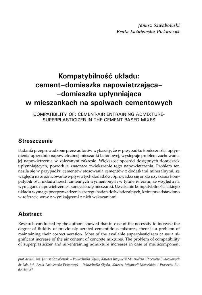 Janusz Szwabowski Beata Łaźniewska-Piekarczyk Kompatybilność układu: cement–domieszka napowietrzająca– –domieszka upłynniająca w mieszankach na spoiwach cementowych COMPATIBILITY OF: CEMENT-AIR ENTRAINING ADMIXTURESUPERPLASTICIZER IN THE CEMENT BASED MIXES Streszczenie Badania przeprowadzone przez autorów wykazały, że w przypadku konieczności upłynnienia uprzednio napowietrzonej mieszanki betonowej, występuje problem zachowania jej napowietrzenia w zalecanym zakresie. Większość spośród dostępnych domieszek upłynniających, powoduje znaczące zwiększenie tego napowietrzenia. Problem ten nasila się w przypadku cementów stosowania cementów z dodatkami mineralnymi, ze względu na zróżnicowanie wpływu tych dodatków. Sprowadza się on do uzyskania kompatybilności układu trzech zmiennych wymienionych w tytule referatu, ze względu na wymagane napowietrzenie i konsystencję mieszanki. Uzyskanie kompatybilności takiego układu wymaga przeprowadzenia szeregu badań doświadczalnych, które przedstawiono w referacie wraz z wynikającymi z nich wskazaniami. Abstract Research conducted by the authors showed that in case of the necessity to increase the degree of fluidity of previously aerated cementitious mixtures, there is a problem of maintaining their correct aeration. Most of the available superplasticizers cause a significant increase of the air content of concrete mixtures. The problem of compatibility of superplasticizer and air-entraining admixture increases in case of multicomponent prof. dr hab. inż. Janusz Szwabowski – Politechnika Śląska, Katedra Inżynierii Materiałów i Procesów Budowlanych dr hab. inż. Beata Łaźniewska-Piekarczyk – Politechnika Śląska, Katedra Inżynierii Materiałów i Procesów Budowlanych Janusz Szwabowski, Beata Łaźniewska-Piekarczyk Portland cement, due to different effects of these additives. It comes down to achieving a compatibility of the three variables mentioned in the title of paper, due to the required air entrainment and consistency of mixture. Achieving compatibility of such a system requires a series of experimental studies that were presented in the paper together with their resulting indications. 2 DNI BETONU 2014