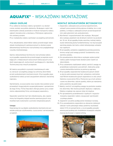 T I E FB AU GA L A B AU AQ UAB AU S P O R TB AU AQUAFIX® – WSKAZÓWKI MONTAŻOWE UWAGI OGÓLNE Przy odbiorze dostawy należy sprawdzić czy dostar- MONTAŻ SEPARATORÓW BETONOWYCH 1. Separator, zabezpieczony przed przepełnieniem, czone zostały wszystkie elementy. Brakujące części lub ustawić poza powierzchnią spływu ścieków, lecz w jej ewentualne szkody powstałe w trakcie transportu należy pobliżu, w miejscu zabezpieczonym przed bezpośred- zgłosić niezwłocznie u dostawcy. Późniejsze zgłoszenia nim zabrudzeniem lub uszkodzeniem. nie zostaną uznane. Przy rozładunku należy zachować szczególną ostrożność. 2. Wyrównać i wypoziomować dno wykopu. Wysypać dno wykopu piaskiem lub drobnym żwirem na grubość ok. 10 cm. W przypadku braku warstwy nośnej należy Przy wbudowaniu zbiorników należy przestrzegać wska- wylać betonową płytę fundamentową i na nią wysypać zówek montażowych zamieszczonych w dostarczanej warstwę piasku lub żwiru celem łatwiejszego ustawia- dokumentacji techniczno rozruchowej oraz poglądowego rysunku montażowego. nia rzędnych. 3. W przypadku ustalania zagłębienia poniżej poziomu terenu wziąć pod uwagę grubość fundamentu oraz Oprócz dokumentacji techniczno rozruchowej należy warstwy piasku. w przypadku separatorów przestrzegać przepisów wyni- 4. Do posadowienia zbiornika w wykopie wykorzystać kających z miejscowych wytycznych dotyczących urzą- należy pętle transportowe dostarczane razem ze dzeń separujących, wytycznych wynikających z Aprobaty Technicznej oraz innych przepisów. zbiornikiem. 5. Przy ustawianiu nadstawek należy zwrócić uwagę na prawidłowe wykonanie uszczelnień. Zalecamy połą- W trakcie wszystkich czynności montażowych należy zwracać szczególną uwagę na ochronę zbiorników czenie elementów komina za pomocą zaprawy. 6. W przypadku separatorów koalescencyjnych otwór przed uszkodzeniami mechanicznymi. W przypadku jego w płycie pokrywowej musi być ustawiony centralnie uszkodzenia należy przed zasypaniem dokonać starannej nad filtrem koalescencyjnym separatora w celu umoż- naprawy. liwienia czyszczenia filtra. Pomocne są w tym umieszczone na zbiorniku i płycie punkty, które po nałożeniu Opróżnianie, oczyszczanie oraz wywóz nieczystości prze- płyty powinny się pokrywać. prowadzać mogą jedynie wyspecjalizowane i uprawnione 7. Należy zwrócić szczególną uwagę na poziome osadze- do tego firmy. Firma Hauraton oferuje pomoc przy znale- nie zbiornika. Nie można pomylić dopływu i odpływu. zieniu odpowiedniej firmy serwisującej separatory. Odpływ znajduje się zawsze niżej niż dopływ. 8. Po sprawdzeniu prawidłowości rzędnych i wypozio- Separator powinien być tak zlokalizowany, aby zapew- mowaniu separator należy zasypywać warstwami niony był dogodny dojazd wozów asenizacyjnych oraz czystego piasku. możliwe było wykonanie czynności eksploatacyjnych. 9. Zapewnić szczelne podłączenie instalacji rurowej. 10. Przy posadowieniu separatora w obszarze zielonym 84 Uwaga: (obszar ruchu pieszego) włazy powinny wystawać Gwarancją nie są objęte uszkodzenia mechaniczne po- około 5-10 cm ponad teren, a w przypadku posado- wstałe podczas użytkowania, czyszczenia i serwisowania wienia pod jezdnią lub chodnikiem krawędzie włazów urządzeń. muszą się licować z nawierzchnią. ży również sprawdzić stan powłoki wewnętrznej i w razie Przed uruchomieniem należy starannie oczyścić całe jej uszkodzenia dokonać starannej naprawy. Po każdym urządzenie z kurzu, usunąć resztki zaprawy, ziemi, itp. opróżnieniu i oczyszczeniu należy urządzenie napełnić Pracownicy znajdujący się w środku separatora muszą czystą wodą, przy czym należy przytrzymać pływak. posiadać obuwie na gumowych podeszwach. Po oczysz- Kontrolę pracy urządzenia należy wykonywać co miesiąc czeniu zbiornik należy napełnić czystą wodą. W przypad- i po każdorazowym wystąpieniu awaryjnego dopływu. ku separatorów koalescencyjnych należy po napełnieniu Kontrola dotyczy grubości warstwy oleju i osadu. S E PA R AT O RY W Ę G L OW D O R ÓW ROZRUCH bodnie. Górna część pływaka powinna wystawać ponad Separatory tłuszczów i skrobi: poziom wody. Należy również sprawdzić szczelność Do separatora nie należy wprowadzać ścieków zawierają- połączeń i spoin. Założyć pokrywy włazowe. cych fekalia, ścieków opadowych oraz ścieków zawierają- W dostarczonym separatorze oraz instalacjach nie należy cych oleje i tłuszcze pochodzenia mineralnego. Ścieki do- dokonywać żadnych zmian. pływające do separatora nie powinny zawierać substancji S E PA R AT O RY TŁ U S ZC ZÓW I SKROBI wodą unieść pływak i sprawdzić czy porusza się swo- myjących, które mogą powodować korozję separatora. EKSPLOATACJA I KONSERWACJA Przed separatorem wskazane jest zamontowanie sita lub Separatory koalescencyjne: innego urządzenia odcedzającego, zatrzymującego duże Bezpośrednio do separatora nie należy wprowadzać ole- odpady, które szybko opadają i zagniwają. Separator jów mineralnych. W myjniach samochodowych, z których musi być wentylowany, aby nie dopuścić do powstawania ścieki oczyszcza się w separatorze, nie należy stoso- odorów w wyniku procesów gnilnych. paratora można doprowadzać tylko takie ścieki, które nie czać w miarę potrzeb co dwa tygodnie, lecz nie rzadziej wpływają negatywnie na jego funkcjonowanie. Emulsje niż raz na miesiąc. Oczyszczenie powinno następować oraz rozpuszczalniki (oczyszczacze wapna, oleje wiertar- częściej w przypadku przekroczenie pojemności zbiorni- skie i chłodząco-smarujące, węglowodory rozpuszczalne ka i przerwania jego prawidłowego funkcjonowania. w wodzie itp.) nie mogą stykać się z separatorem. Należy Prace konserwacyjne obejmują opróżnienie separatora usuwać je jako tzw. odpady o charakterze szczególnym. oraz jego wyczyszczenie. Do separatora nie wolno r