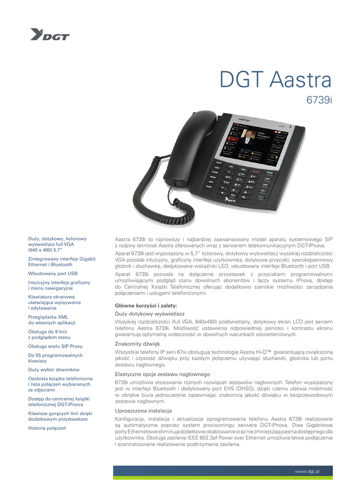DGT Aastra 6739i Duży, dotykowy, kolorowy wyświetlacz full VGA (640 x 480) 5.7” Zintegrowany interfejs Gigabit Ethernet i Bluetooth Wbudowany port USB Intuicyjny interfejs graficzny i menu nawigacyjne Klawiatura ekranowa ułatwiająca wpisywanie i edytowanie Przeglądarka XML do własnych aplikacji Obsługa do 9 linii z podglądem stanu Obsługa wielu SIP Proxy Do 55 programowalnych klawiszy Duży wybór dzwonków Osobista książka telefoniczna i lista połączeń wybieranych ze zdjęciami Dostęp do centralnej książki telefonicznej DGT-IPnova Klawisze gorących linii dzięki dodatkowym przystawkom Historia połączeń Aastra 6739i to najnowszy i najbardziej zaawansowany model aparatu systemowego SIP z rodziny terminali Aastra oferowanych wraz z serwerem telekomunikacyjnym DGT-IPnova. Aparat 6739i jest wyposażony w 5,7” kolorowy, dotykowy wyświetlacz wysokiej rozdzielczości VGA posiada intuicyjny, graficzny interfejs użytkownika, dotykowe przyciski, szerokopasmowy głośnik i słuchawkę, dedykowane wskaźniki LED, wbudowany interfejs Bluetooth i port USB. Aparat 6739i pozwala na dołączenie przystawek z przyciskami programowalnymi umożliwiającymi podgląd stanu dowolnych abonentów i łączy systemu IPnova, dostęp do Centralnej Książki Telefonicznej oferując dodatkowo szerokie możliwości zarządzania połączeniami i usługami telefonicznymi. Główne korzyści i zalety: Duży dotykowy wyświetlacz Wysokiej rozdzielczości (full VGA, 640x480) podświetlany, dotykowy ekran LCD jest sercem telefonu Aastra 6739i. Możliwość ustawienia odpowiedniej jasności i kontrastu ekranu gwarantują optymalną widoczność w dowolnych warunkach oświetleniowych. Znakomity dźwięk Wszystkie telefony IP serii 67xi obsługują technologię Aastra Hi-Q™ gwarantującą zwiększoną jakość i czystość dźwięku przy każdym połączeniu używając słuchawki, głośnika lub portu zestawu nagłownego. Elastyczne opcje zestawu nagłownego 6739i umożliwia stosowanie różnych rozwiązań zestawów nagłownych. Telefon wyposażony jest w interfejs Bluetooth i dedykowany port EHS (DHSG), dzięki czemu ułatwia mobilność w obrębie biura jednocześnie zapewniając znakomitą jakość dźwięku w bezprzewodowym zestawie nagłownym. Uproszczona instalacja Konfiguracja, instalacja i aktualizacje oprogramowania telefonu Aastra 6739i realizowane są automatycznie poprzez system provisioningu serwera DGT-IPnova. Dwa Gigabitowe porty Ethernetowe eliminują dodatkowe okablowanie oraz nie zmniejszają pasma dostępnego dla użytkownika. Obsługa zasilania IEEE 802.3af Power over Ethernet umożliwia łatwe podłączenie i scentralizowane realizowanie podtrzymania zasilania. www.dgt.pl Klawisze funkcyjne • 3 dedykowane klawisze linii z diodami LED - dodatkowe klawisze mogą być zaprogramowane na ekranie LCD Możliwości XML API • przycisk poczty głosowej z LED • realizacja aplikacji CTI • do 55 konfigurowalnych przycisków dostępnych na ekranie • realizacja funkcji systemowych serwera DGT-IPnova • 14 dedykowanych przycisków stałych: Wiadomości głosowe, Przekazanie połączenia, Konferencja, Usługi, Książka, Połączenia przychodzące, Zawieszenie, Powtórzenie wybierania, Wyciszenie mikrofonu, 2 klawisze regulacji głośności, Przełącznik Głośnik/Zestaw nagłowny, Menu i Rozłącz • wbudowany port USB do współpracy z zewnętrznymi aplikacjami Dźwięk, zestawy nagłowne i kodeki • Aastra Hi-Q Audio™ Technology • wsparcie sprzętowe wysokiej jakości szerokopasmowego dźwięku (słuchawka, zestaw głośnomówiący i port zestawu nagłownego) • usuwanie echa, szum komfortowy, obsługa strat pakietów, adaptacyjny jitter buffer, VAD • złącze zestawu nagłownego z wbudowanym wzmacniaczem • wbudowany port EHS (DHSG) dla bezprzewodowych zestawów nagłownych • obsługa zestawów nagłownych Bluetooth • słuchawka kompatybilna z aparatami słuchowymi (HAC) • indywidualne ustawienie głośności z graficznym wskaźnikiem dla każdego urządzenia głosowego • kodeki: G.711 μ-law / A-law, G.729, G.722 szerokopoasmowy Wyświetlacz i wskaźniki • sterowanie wyświetlaczem bazujące na działaniach użytkownika lub zdarzeniach Moduły rozszerzeń • obsługa do 3 modułów M670i lub M675i • magistrala rozszerzeń dla przyszłych modułów rozszerzeń Protokół • IETF SIP (RFC3261) i stowarzyszone RFC Sieć i konfiguracja • dwa porty Ethernet 10/100/1000Mbps (porty LAN i PC) • ustawienia adresów IP ręczne lub z użyciem DHCP • wsparcie dla wielu opcji DHCP: 66, 60, 43, 77, 159, 160 • synchronizacja czasu i daty z użyciem SNTP • wsparcie dla QoS – IEEE 802.1 p/Q VLAN and priority tagging, Type of Services (TOS), and Differentiated Services Code Point • wsparcie dla NAT, STUN, TURN • wbudowany serwer HTTP/HTTPS do obsługi strony zarządzania i rozwiązywania problemów • masowa konfiguracja za pomocą centralnego systemu provisioningu lub plików konfiguracyjnych użytkownika – TFTP, FTP, HTTP, HTTPS • wsparcie dla serwerów redundantnych - DNS-SRV - Zapasowy serwer rejestrujący i/lub proxy • 5,7”, kolorowy, dotykowy, ekran LCD Full VGA (640 x 480) • wsparcie RTCP (RFC1889) • intuicyjny, graficzny interfejs użytkownika i menu nawigacyjne • LLDP-MED • konfigurowalna jasność i kontrast ekranu Zasilanie • dedykowana dioda LED sygnalizująca połączenie i oczekującą wiadomość głosową • obsługa IEEE 802.3af Power over Ethernet (PoE) • menu w języku polskim z polskimi znakami Funkcje i parametry techniczne • IEEE 802.1x • zewnętrzny zasilacz AC (48V DC) – opcja, wymagany jeśli dołączone są przystawki Wymiary, waga Bezpieczeństwo • 17.8cm x 20.8cm x 7.7cm • zabezpieczone hasłem logowanie do poziomu uprawnień użytkownika i administratora • szyfrowanie plików konfiguracyjnych • pobieranie konfiguracji i zarządzanie poprzez WWW za pomocą HTTPS • SIP Digest Authentication 