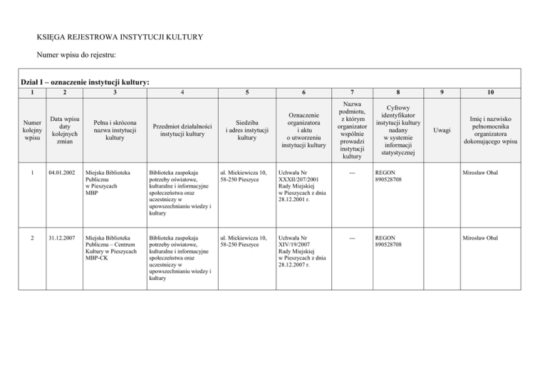 KSIĘGA REJESTROWA INSTYTUCJI KULTURY Numer wpisu do rejestru: Dział I – oznaczenie instytucji kultury: 1 Numer kolejny wpisu 2 Data wpisu daty kolejnych zmian 3 Pełna i skrócona nazwa instytucji kultury 4 Przedmiot działalności instytucji kultury 5 Siedziba i adres instytucji kultury 6 7 8 Oznaczenie organizatora i aktu o utworzeniu instytucji kultury Nazwa podmiotu, z którym organizator wspólnie prowadzi instytucji kultury Cyfrowy identyfikator instytucji kultury nadany w systemie informacji statystycznej 9 10 Uwagi Imię i nazwisko pełnomocnika organizatora dokonującego wpisu 1 04.01.2002 Miejska Biblioteka Publiczna w Pieszycach MBP Biblioteka zaspokaja potrzeby oświatowe, kulturalne i informacyjne społeczeństwa oraz uczestniczy w upowszechnianiu wiedzy i kultury ul. Mickiewicza 10, 58-250 Pieszyce Uchwała Nr XXXII/207/2001 Rady Miejskiej w Pieszycach z dnia 28.12.2001 r. --- REGON 890528708 Mirosław Obal 2 31.12.2007 Miejska Biblioteka Publiczna – Centrum Kultury w Pieszycach MBP-CK Biblioteka zaspokaja potrzeby oświatowe, kulturalne i informacyjne społeczeństwa oraz uczestniczy w upowszechnianiu wiedzy i kultury ul. Mickiewicza 10, 58-250 Pieszyce Uchwała Nr XIV/19/2007 Rady Miejskiej w Pieszycach z dnia 28.12.2007 r. --- REGON 890528708 Mirosław Obal Dział II – Organizacja instytucji kultury 1 Numer kolejny wpisu 1 2 4 5 2 Data wpisu daty kolejnych zmian 04.01.2002 r. 3 4 5 6 7 8 Informacja o złożeniu do rejestru statutu Imię i nazwisko dyrektora instytucji kultury i jego następców lub oznaczenie osoby fizycznej lub prawnej której powierzono zarządzanie instytucją kultury Imiona i nazwiska pełnomocników do instytucji kultury uprawnionych do dokonywania czynności prawnych w imieniu o instytucji oraz zakres ich uprawnień Nazwa oraz siedziba wyodrębnionych jednostek organizacyjnych instytucji kultury ich cyfrowe identyfikatory nadane w systemie informacji statystycznej Uwagi Imię i nazwisko pełnomocnika organizatora dokonującego wpisu Statut Miejskiej Biblioteki Publicznej załącznik do Uchwały nr XXXII/207/2001 Rady Miejskiej w Pieszycach z dnia 28.12.2001 r. 08.08.2007 r. 31.12.2007 r. 30.10.2014 r. Statut Miejskiej Biblioteki Publicznej - Centrum załącznik do Uchwały nr XIV/93/2007 Rady Miejskiej w Pieszycach z dnia 28 grudnia 2007 r UCHWAŁA Nr L/309/2014 Rady Miejskiej w Pieszycach z dnia 30.10.2014 r. w sprawie zmiany uchwały Nr XIV/93/2007 Rady Miejskiej w Pieszycach z dnia 28 grudnia 2007 r. w sprawie przyjęcia statutu Miejskiej Biblioteki Publicznej-Centrum Kultury w Pieszycach Marianna Konieczna-Marjan do dnia 31.07.2007 r. (przejście na emeryturę) Miejska Biblioteka Publiczna w Pieszycach ul. Mickiewicza 10, 58-250 Pieszyce REGON 890528708 Lidia Zakrzewska-Strózik od dnia 01.08.2007 r. Miejska Biblioteka Publiczna w Pieszycach ul. Mickiewicza 10, 58-250 Pieszyce REGON 890528708 Miejska Biblioteka Publiczna – Centrum Kultury w Pieszycach ul. Mickiewicza 10, 58-250 Pieszyce REGON 890528708 Anna Wojtal główna księgowa Miejska Biblioteka Publiczna – zmiana Centrum Kultury w Pieszycach adresu ul. Mikołaja Kopernika 37, siedziby 58-250 Pieszyce REGON 890528708 Mirosław Obal Mirosław Obal Mirosław Obal Mirosław Obal Dział III – Mienie instytucji kultury: 1 2 3 Numer kolejny wpisu Data wpisu daty kolejnych zmian Informacja o złożeniu do rejestru rocznego sprawozdania finansowego 4 Informacja o obciążeniu środków trwałych instytucji kultury ograniczonymi prawami rzeczowymi 5 6 Uwagi Imię i nazwisko pełnomocnika organizatora dokonującego wpisu 1 29.03.2002 r. Bilans za 2001 r. --- Mirosław Obal 2 18.03.2003 r. Bilans za 2002 r. --- Mirosław Obal 3 25.03.2004 r. Bilans za 2003 r. --- Mirosław Obal 4 23.03.2005 r. Bilans za 2004 r. --- Mirosław Obal 5 30.032006 r. Bilans za 2005 r. --- Mirosław Obal 6 21.03.2007 r. Bilans za 2006 r. --- Mirosław Obal 7 24.04.2008 r. Bilans za 2007 r. --- Mirosław Obal 8 30.03.2009 r. Bilans za 2008 r. --- Mirosław Obal 9 16.06.2010 r. Bilans za 2009 r. --- Mirosław Obal 10 28.04.2011 r. Bilans za 2010 r. --- Mirosław Obal 11 26.04.2012 r. Bilans za 2011 r. --- Mirosław Obal 12 25.04.2013 r. Bilans za 2012 r. --- Mirosław Obal 13 24.04.2014 r. Bilans za 2013 r. --- Mirosław Obal Dział IV – Połączenie, podział i likwidacja instytucji kultury: 1 2 3 4 5 Numer kolejny wpisu Data wpisu daty kolejnych zmian Informacja o połączeniu, podziale lub likwidacji instytucji kultury Imię i nazwisko likwidatora Uwagi --- --- --- --- 6 Imię i nazwisko pełnomocnika organizatora dokonującego wpisu