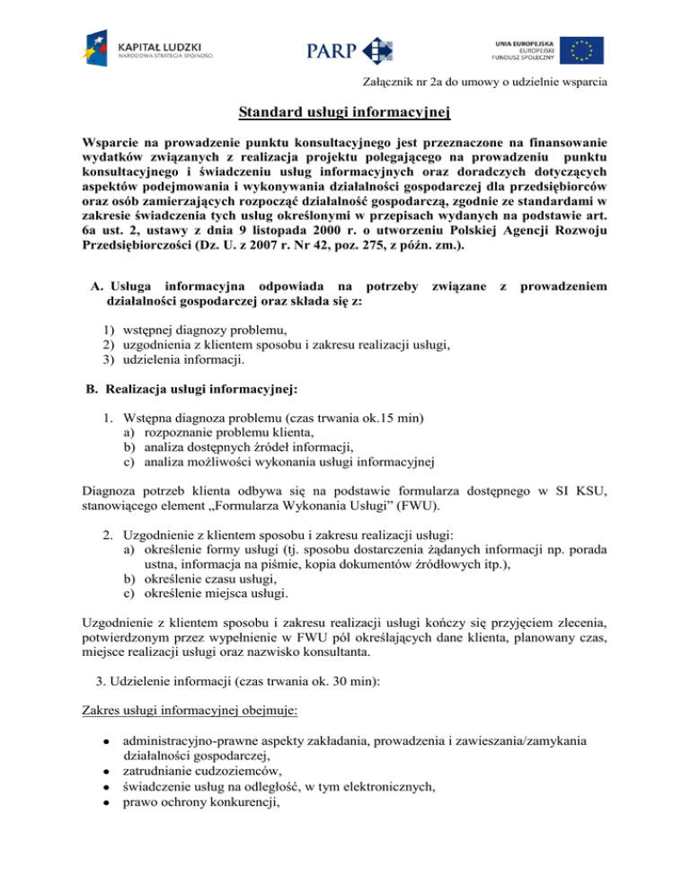 Załącznik nr 2a do umowy o udzielnie wsparcia Standard usługi informacyjnej Wsparcie na prowadzenie punktu konsultacyjnego jest przeznaczone na finansowanie wydatków związanych z realizacja projektu polegającego na prowadzeniu punktu konsultacyjnego i świadczeniu usług informacyjnych oraz doradczych dotyczących aspektów podejmowania i wykonywania działalności gospodarczej dla przedsiębiorców oraz osób zamierzających rozpocząć działalność gospodarczą, zgodnie ze standardami w zakresie świadczenia tych usług określonymi w przepisach wydanych na podstawie art. 6a ust. 2, ustawy z dnia 9 listopada 2000 r. o utworzeniu Polskiej Agencji Rozwoju Przedsiębiorczości (Dz. U. z 2007 r. Nr 42, poz. 275, z późn. zm.). A. Usługa informacyjna odpowiada na potrzeby związane z działalności gospodarczej oraz składa się z: prowadzeniem 1) wstępnej diagnozy problemu, 2) uzgodnienia z klientem sposobu i zakresu realizacji usługi, 3) udzielenia informacji. B. Realizacja usługi informacyjnej: 1. Wstępna diagnoza problemu (czas trwania ok.15 min) a) rozpoznanie problemu klienta, b) analiza dostępnych źródeł informacji, c) analiza możliwości wykonania usługi informacyjnej Diagnoza potrzeb klienta odbywa się na podstawie formularza dostępnego w SI KSU, stanowiącego element „Formularza Wykonania Usługi” (FWU). 2. Uzgodnienie z klientem sposobu i zakresu realizacji usługi: a) określenie formy usługi (tj. sposobu dostarczenia żądanych informacji np. porada ustna, informacja na piśmie, kopia dokumentów źródłowych itp.), b) określenie czasu usługi, c) określenie miejsca usługi. Uzgodnienie z klientem sposobu i zakresu realizacji usługi kończy się przyjęciem zlecenia, potwierdzonym przez wypełnienie w FWU pól określających dane klienta, planowany czas, miejsce realizacji usługi oraz nazwisko konsultanta. 3. Udzielenie informacji (czas trwania ok. 30 min): Zakres usługi informacyjnej obejmuje: administracyjno-prawne aspekty zakładania, prowadzenia i zawieszania/zamykania działalności gospodarczej, zatrudnianie cudzoziemców, świadczenie usług na odległość, w tym elektronicznych, prawo ochrony konkurencji, społeczną odpowiedzialność biznesu (CSR), ochronę własności intelektualnej, systemy jakości ISO 9001 i HACCP, rozwój zasobów ludzkich, wykorzystywanie technologii informacyjnych, ochronę interesów klientów, konsumentów (wykorzystanie BIK, baz ZBP), możliwość uzyskania finansowania działalności z różnych źródeł, wymogi ochrony środowiska w działalności przedsiębiorstw, prawo zamówień publicznych, zakres korzystania z bazy CEIDG, platformy ePUAP, podpisu elektronicznego, profilu zaufanego ePUAP, podstawowe informacje nt. usług specjalistycznych KSU, inne, stwierdzone w trakcie diagnozy. Usługa informacyjna w PK KSU to proces, którego efektem jest zrealizowanie potrzeb odbiorcy usługi, tj. przedsiębiorcy lub osoby fizycznej zamierzającej rozpocząć działalność gospodarczą poprzez dostarczenie wiedzy i umożliwienie odbiorcy usługi podjęcie decyzji w sposób świadomy i samodzielny co do działań lub zaniechania działań w zakresie prowadzonej albo planowanej działalności gospodarczej. Klient zgłaszający się po usługę PK KSU powinien zostać obsłużony bez zbędnej zwłoki, najlepiej w tym samym dniu. W przypadku konieczności przygotowania się konsultanta do usługi informacyjnej okres od zgłoszenia klienta do przeprowadzenia diagnozy powinien wynieść do 3 dni. Produktem usługi będzie informacja, odpowiadająca skonkretyzowanym potrzebom klienta, udzielona klientowi w ustalonej formie: pisemnej lub ustnej. Rezultatem usługi będzie wykonanie usługi zgodnie z potrzebą klienta, w określonym czasie i miejscu. Potwierdzeniem realizacji usługi informacyjnej jest wypełnienie formularza wykonania usługi (FWU) w systemie SI KSU. PARP zaproponuje FWU, który zostanie przesłany do uzgodnień podmiotom prowadzącym PK KSU. Wydrukowany formularz jest podpisywany przez klienta i stanowi dowód wykonania usługi (dla potrzeb sprawozdawczości). W przypadku usług świadczonych drogą telefoniczną i elektroniczną przed wykonaniem usługi klient wyraża zgodę na udział w projekcie oraz przetwarzanie danych osobowych. Potwierdzeniem realizacji usługi jest wypełnienie FWU w systemie SIKSU, natomiast potwierdzeniem odebrania usługi przez klienta jest podpisanie formularza przez klienta, nagranie telefoniczne lub e-mail. Po zakończeniu usługi klient wypełnia formularz zadowolenia klienta, dostępny w SI KSU. Dodatkowo badanie zadowolenia klienta przeprowadzane jest pół roku od daty zrealizowania usługi. Forma i miejsce świadczenia usługi informacyjnej: 1) usługa informacyjna powinna być świadczona w lokalizacji Punktu Konsultacyjnego w trzech możliwych formach: usługi bezpośredniej, usługi świadczonej drogą telefoniczną albo usługi świadczonej drogą elektroniczną, 2 2) usługa informacyjna realizowana jest w formie dyżurów (minimum 2 dyżury w miesiącu, w dwóch lokalizacjach, 1 dyżur trwa minimum 4 godziny) w zaproponowanych w trakcie konkursu lokalizacjach, uzgodnionych z PARP, dyżur nie może odbywać się w miejscowości, w której znajduje się PK KSU, 3) usługa informacyjna może być świadczona w formie seminarium informacyjnego dla przedsiębiorców pod następującymi warunkami: a) z inicjatywy PK KSU na temat zgodny z potrzebami zgłaszanymi przez przedsiębiorców po uzgodnieniu tematu z PARP, przy zapewnieniu przeprowadzenia diagnozy potrzeb każdego klienta (uczestnika seminarium) oraz wyświadczenia indywidualnej usługi po zakończeniu seminarium; w takim przypadku uczestnik seminarium liczony jest do wskaźnika projektu. b) z inicjatywy PK KSU na temat zgodny z potrzebami zgłaszanymi przez przedsiębiorców z wykorzystaniem elementów promocji systemu KSU; uczestnicy seminarium nie są liczeni do wskaźnika projektu, c) z inicjatywy PARP, 