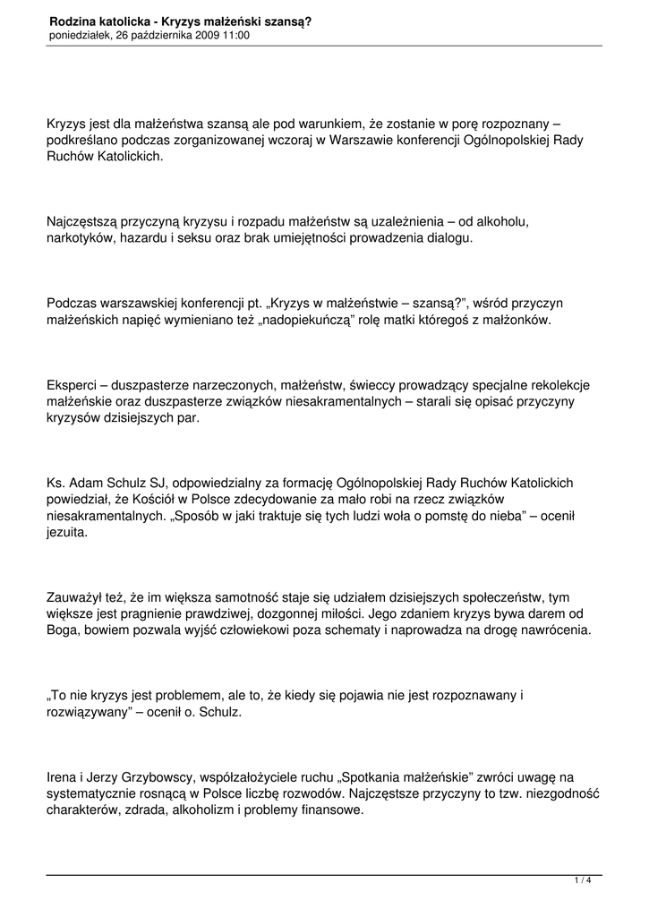 Rodzina katolicka - Kryzys małżeński szansą? poniedziałek, 26 października 2009 11:00 Kryzys jest dla małżeństwa szansą ale pod warunkiem, że zostanie w porę rozpoznany – podkreślano podczas zorganizowanej wczoraj w Warszawie konferencji Ogólnopolskiej Rady Ruchów Katolickich. Najczęstszą przyczyną kryzysu i rozpadu małżeństw są uzależnienia – od alkoholu, narkotyków, hazardu i seksu oraz brak umiejętności prowadzenia dialogu. Podczas warszawskiej konferencji pt. „Kryzys w małżeństwie – szansą?”, wśród przyczyn małżeńskich napięć wymieniano też „nadopiekuńczą” rolę matki któregoś z małżonków. Eksperci – duszpasterze narzeczonych, małżeństw, świeccy prowadzący specjalne rekolekcje małżeńskie oraz duszpasterze związków niesakramentalnych – starali się opisać przyczyny kryzysów dzisiejszych par. Ks. Adam Schulz SJ, odpowiedzialny za formację Ogólnopolskiej Rady Ruchów Katolickich powiedział, że Kościół w Polsce zdecydowanie za mało robi na rzecz związków niesakramentalnych. „Sposób w jaki traktuje się tych ludzi woła o pomstę do nieba” – ocenił jezuita. Zauważył też, że im większa samotność staje się udziałem dzisiejszych społeczeństw, tym większe jest pragnienie prawdziwej, dozgonnej miłości. Jego zdaniem kryzys bywa darem od Boga, bowiem pozwala wyjść człowiekowi poza schematy i naprowadza na drogę nawrócenia. „To nie kryzys jest problemem, ale to, że kiedy się pojawia nie jest rozpoznawany i rozwiązywany” – ocenił o. Schulz. Irena i Jerzy Grzybowscy, współzałożyciele ruchu „Spotkania małżeńskie” zwróci uwagę na systematycznie rosnącą w Polsce liczbę rozwodów. Najczęstsze przyczyny to tzw. niezgodność charakterów, zdrada, alkoholizm i problemy finansowe. 1/4 Rodzina katolicka - Kryzys małżeński szansą? poniedziałek, 26 października 2009 11:00 Zdaniem Grzybowskich kryzys małżeński może być problemem, jeśli nie zostanie w porę zauważony ale też wówczas, gdy każde z małżonków upiera się przy własnym zdaniu, co do przyczyn i strategii przezwyciężenia napięć. „Żeby pokonać kryzys, trzeba się z drugą osobą spotkać, wysłuchać do końca i nie oceniać zanim się współmałżonka nie zrozumie” – podkreślała Irena Grzybowska. Dodała, że strategia z wyjścia z kryzysu nie może być „moja” lub „twoja” ale wspólna. Opierając się na ponad 30-letnim doświadczeniu, twórcy „Spotkań małżeńskich” zaznaczyli, że z prośbą o pomoc – duchową czy terapeutyczną – zwraca się dziś więcej par aniżeli przed laty. Barbara Smolińska, psychoterapeutka specjalizująca się w terapii małżeńskiej zwróciła uwagę, że kryzys jest niejako wpisany w naturę małżeństwa, ponieważ małżeństwo jest procesem. „Małżeństwa, które nie przeżywają kryzysu, są nim najbardziej zagrożone” – oceniła. Zdaniem Smolińskiej każde małżeństwo potrzebuje formacji duchowej, rozwoju indywidualnej osobowości oraz grup wsparcia. - Kiedyś tę wspierającą rolę pełniła rodzina, zwłaszcza starsze pokolenie oraz sąsiedzi ale dziś sytuacja ta uległa zmianie – zaznaczyła. „Terapeuta małżeński zajmuje się leczeniem więzi małżeńskich, to znaczy działa wówczas, kiedy dialog i przebaczenie nie są możliwe, nawet pomimo chęci obojga” – zaznaczyła Smolińska. Oceniła też, że coraz więcej małżeństw stanowią osoby zranione w swojej historii życia, tzn. w rodzinach, z których pochodzą. „Oni nie są wstanie dialogować i przebaczać, choć tego chcą” – zaznaczyła. Celem pracy terapeuty małżeńskiego jest to, aby para uświadomiła sobie to, czego nie jest świadoma. „To czego sobie nie uświadamiamy rządzi nami w bardzo poważny sposób” – przekonywała Smolińska. Zdaniem ks. Jana Pałygi, od ponad 30 lat zajmującego się związkami niesakramentalnymi, najczęstszymi powodami rozpadu małżeństw są uzależnienia: alkoholizm, narkomania, hazard i erotomania. Pallotyn podkreślał, że niezależnie od pomocy duchowej, niekiedy najważniejszą sprawą bywa natychmiastowe skierowanie osoby do terapeuty lub psychiatry. Ks. Pałyga 2/4 Rodzina katolicka - Kryzys małżeński szansą? poniedziałek, 26 października 2009 11:00 przyznał, że częstą przyczyna kryzysów jest rola matki któregoś z małżonków (zwłaszcza jedynaka), która zbyt mocno ingeruje w ich życie. Dodał, że trudno mówić o jakiejś uniwersalnej recepcie na kryzys, bowiem w istocie „rodzajów kryzysów jest tyle, ile małżeństw” i do każdego przypadku trzeba podejść indywidualnie. O zmianach w mentalności osób przygotowujących się do małżeństwa mówił na podstawie 20 letniego pracy duszpasterza rodzin o. Mirosław Pilśniak OP. Zauważył, że dawniej jednym z celów pracy z kandydatami do małżeństwa było „zgaszenie euforii na temat budowanego związku”. Tymczasem dziś bardzo często dominikanin ma do czynienia z parami żyjącymi w wieloletnim konkubinacie, które decydują się na małżeństwo w celu ratowania związku i „zobaczenia, czy to ma sens”. Syndromem nowych czasów jest też szczególne traktowanie partnera. „Dziś często młodym ludziom towarzyszy wątpliwość, czy ‘towar’ jaki wybrałem jest rzeczywiście najlepszy spośród wszystkich dostępnych na rynku” – charakteryzował postawy wielu narzeczonych o. Pilśniak. Wymienił też trzy sytuacje, które – jak się wyraził – wywołują panikę wśród słuchaczy kursów przedmałżeńskich. Są to dyskusja nt.: przyszłych relacji rodzicami i teściami, stosunku do obserwowania płodności i cała sfera seksualna oraz kwestie wiary. „Kiedy zająłem się kwestią relacji do rodziców i teściów, nagle okazało się, że nagle wszyscy spieszą się na autobus, metro lub tramwaj” – mówił dominikanin dodając, że spośród 40 par, tego dnia pozostały do końc