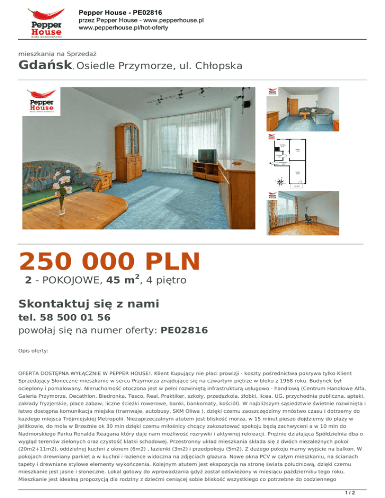 Pepper House - PE02816 przez Pepper House - www.pepperhouse.pl www.pepperhouse.pl/hot-oferty mieszkania na Sprzedaż Gdańsk, Osiedle Przymorze, ul. Chłopska 250 000 PLN 2 - POKOJOWE, 45 m2, 4 piętro Skontaktuj się z nami tel. 58 500 01 56 powołaj się na numer oferty: PE02816 Opis oferty: OFERTA DOSTĘPNA WYŁĄCZNIE W PEPPER HOUSE!. Klient Kupujący nie płaci prowizji - koszty pośrednictwa pokrywa tylko Klient Sprzedający Słoneczne mieszkanie w sercu Przymorza znajdujące się na czwartym piętrze w bloku z 1968 roku. Budynek był ocieplony i pomalowany. Nieruchomość otoczona jest w pełni rozwiniętą infrastrukturą usługowo - handlową (Centrum Handlowe Alfa, Galeria Przymorze, Decathlon, Biedronka, Tesco, Real, Praktiker, szkoły, przedszkola, żłobki, licea, UG, przychodnia publiczna, apteki, zakłady fryzjerskie, place zabaw, liczne ścieżki rowerowe, banki, bankomaty, kościół). W najbliższym sąsiedztwie świetnie rozwinięta i łatwo dostępna komunikacja miejska (tramwaje, autobusy, SKM Oliwa ), dzięki czemu zaoszczędzimy mnóstwo czasu i dotrzemy do każdego miejsca Trójmiejskiej Metropolii. Niezaprzeczalnym atutem jest bliskość morza, w 15 minut pieszo dojdziemy do plaży w Jelitkowie, do mola w Brzeźnie ok 30 min dzięki czemu miłośnicy chcący zakosztować spokoju będą zachwyceni a w 10 min do Nadmorskiego Parku Ronalda Reagana który daje nam możliwość rozrywki i aktywnej rekreacji. Prężnie działająca Spółdzielnia dba o wygląd terenów zielonych oraz czystość klatki schodowej. Przestronny układ mieszkania składa się z dwóch niezależnych pokoi (20m2+11m2), oddzielnej kuchni z oknem (6m2) , łazienki (3m2) i przedpokoju (5m2). Z dużego pokoju mamy wyjście na balkon. W pokojach drewniany parkiet a w kuchni i łazience widoczna na zdjęciach glazura. Nowe okna PCV w całym mieszkaniu, na ścianach tapety i drewniane stylowe elementy wykończenia. Kolejnym atutem jest ekspozycja na stronę świata południową, dzięki czemu mieszkanie jest jasne i słoneczne. Lokal gotowy do wprowadzania gdyż został odświeżony w miesiącu pażdzierniku tego roku. Mieszkanie jest idealną propozycją dla rodziny z dziećmi ceniącej sobie bliskość wszystkiego co potrzebne do codziennego 1/2 Pepper House - PE02816 przez Pepper House - www.pepperhouse.pl www.pepperhouse.pl/hot-oferty funkcjonowania. Polecam również dla studentów lub inwestorów chcących lokal wynajmować. OPŁATY: 500 zł czynsz stały (zaliczka na C.O. i wodę) plus media. Do mieszkania przynależy piwnica a przed budynkiem znajdują się ogólnodostępne miejsca postojowe.. Zapraszam do obejrzenia prezentacji multimedialnej nieruchomości: https://www.youtube.com/watch?v=bEBpNHsoNig&list=UUzKPh2pcLKwuMiM_f0Td0KA&index=14 Opiekun oferty - Roman Rajski tel. 535 439 100. Serdecznie zapraszam do obejrzenia nieruchomości! Więcej podobnych ofert na www.pepperhouse.pl Zapraszam na naszego bloga: www.blog.pepperhouse.pl 2/2 Powered by TCPDF (www.tcpdf.org)