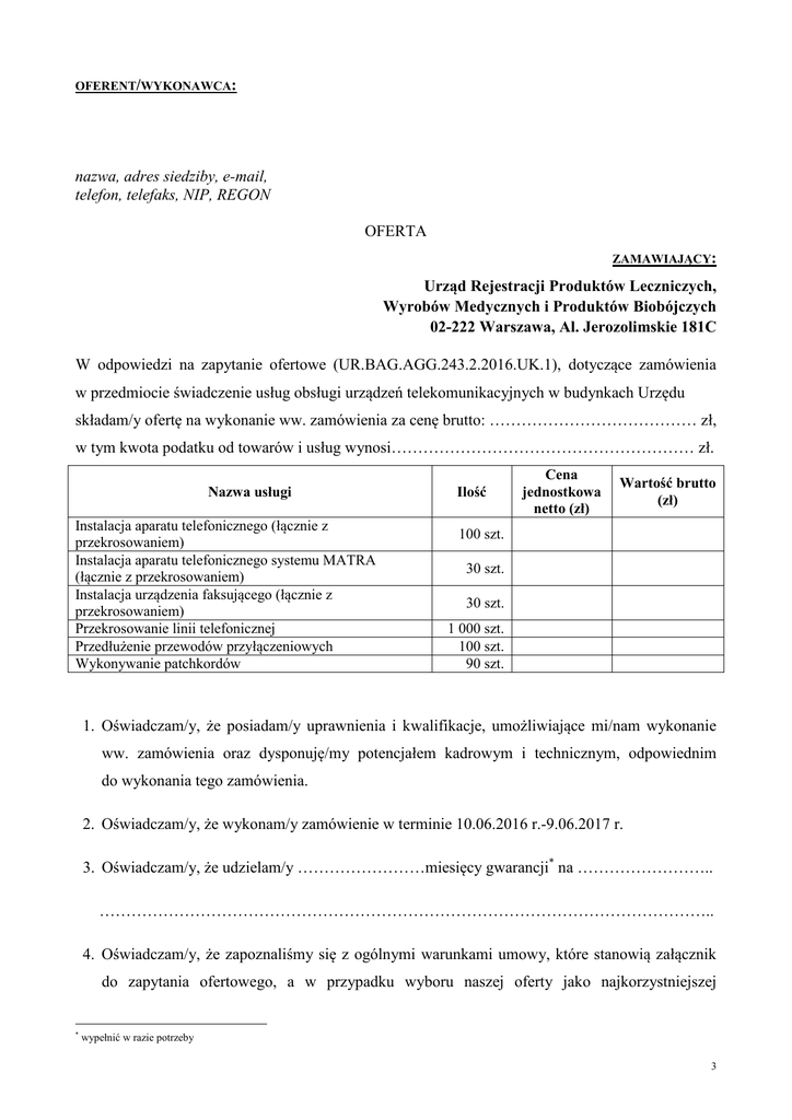 OFERENT/WYKONAWCA: nazwa, adres siedziby, e-mail, telefon, telefaks, NIP, REGON OFERTA ZAMAWIAJĄCY: Urząd Rejestracji Produktów Leczniczych, Wyrobów Medycznych i Produktów Biobójczych 02-222 Warszawa, Al. Jerozolimskie 181C W odpowiedzi na zapytanie ofertowe (UR.BAG.AGG.243.2.2016.UK.1), dotyczące zamówienia w przedmiocie świadczenie usług obsługi urządzeń telekomunikacyjnych w budynkach Urzędu składam/y ofertę na wykonanie ww. zamówienia za cenę brutto: ………………………………… zł, w tym kwota podatku od towarów i usług wynosi………………………………………………… zł. Nazwa usługi Instalacja aparatu telefonicznego (łącznie z przekrosowaniem) Instalacja aparatu telefonicznego systemu MATRA (łącznie z przekrosowaniem) Instalacja urządzenia faksującego (łącznie z przekrosowaniem) Przekrosowanie linii telefonicznej Przedłużenie przewodów przyłączeniowych Wykonywanie patchkordów Ilość Cena jednostkowa netto (zł) Wartość brutto (zł) 100 szt. 30 szt. 30 szt. 1 000 szt. 100 szt. 90 szt. 1. Oświadczam/y, że posiadam/y uprawnienia i kwalifikacje, umożliwiające mi/nam wykonanie ww. zamówienia oraz dysponuję/my potencjałem kadrowym i technicznym, odpowiednim do wykonania tego zamówienia. 2. Oświadczam/y, że wykonam/y zamówienie w terminie 10.06.2016 r.-9.06.2017 r. 3. Oświadczam/y, że udzielam/y ……………………miesięcy gwarancji* na …………………….. …………………………………………………………………………………………………….. 4. Oświadczam/y, że zapoznaliśmy się z ogólnymi warunkami umowy, które stanowią załącznik do zapytania ofertowego, a w przypadku wyboru naszej oferty jako najkorzystniejszej * wypełnić w razie potrzeby 3 zobowiązuję/my się do zawarcia umowy na określonych w niej warunkach, w terminie wyznaczonym przez zamawiającego**. 5. Uważam/y się za związanych tą ofertą w terminie …………….. dni od upływu terminu składania ofert. 6. Wyrażam/y zgodę na zamieszczenie przez ZAMAWIAJĄCEGO na stronie podmiotowej Biuletynu Informacji Publicznej, zawartych w ofercie danych OFERENTA/WYKONAWCY oraz ceny lub cen. …………………………….. miejscowość, data ** ………………………………………………… pieczęć, podpis OFERENTA/WYKONAWCY możliwe jest modyfikowanie tego punktu przez komórkę właściwą odpowiednio do przedmiotu lub warunków wykonania zamówienia 4