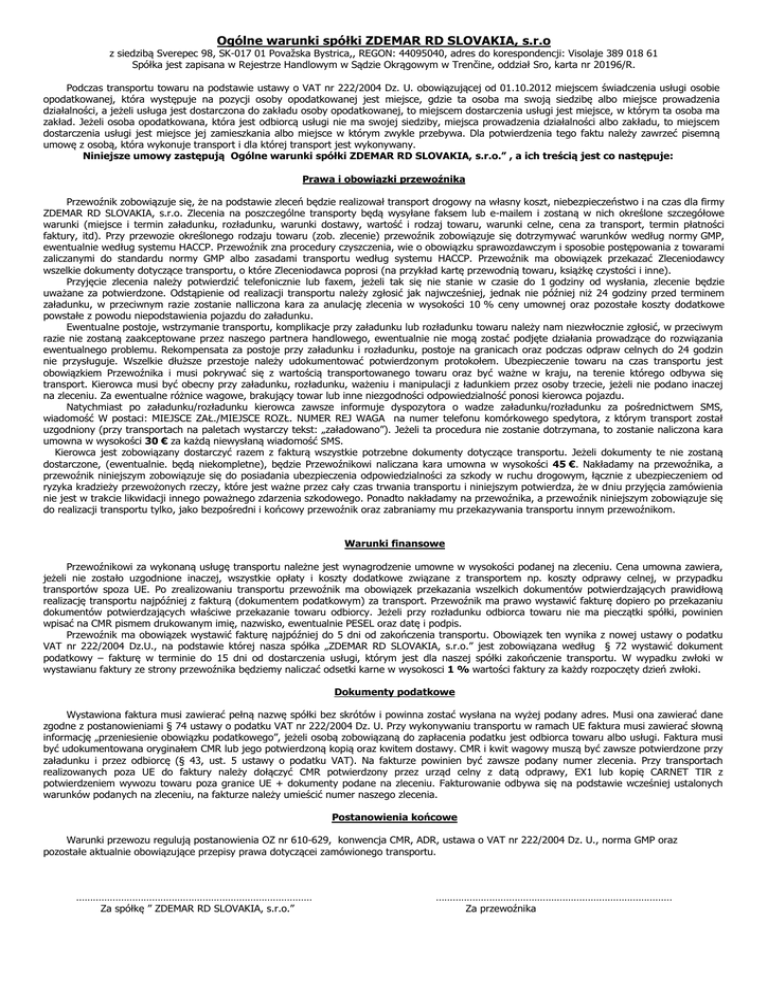 Ogólne warunki spółki ZDEMAR RD SLOVAKIA, s.r.o z siedzibą Sverepec 98, SK-017 01 Považska Bystrica,, REGON: 44095040, adres do korespondencji: Visolaje 389 018 61 Spółka jest zapisana w Rejestrze Handlowym w Sądzie Okrągowym w Trenčine, oddział Sro, karta nr 20196/R. Podczas transportu towaru na podstawie ustawy o VAT nr 222/2004 Dz. U. obowiązującej od 01.10.2012 miejscem świadczenia usługi osobie opodatkowanej, która występuje na pozycji osoby opodatkowanej jest miejsce, gdzie ta osoba ma swoją siedzibę albo miejsce prowadzenia działalności, a jeżeli usługa jest dostarczona do zakładu osoby opodatkowanej, to miejscem dostarczenia usługi jest miejsce, w którym ta osoba ma zakład. Jeżeli osoba opodatkowana, która jest odbiorcą usługi nie ma swojej siedziby, miejsca prowadzenia działalności albo zakładu, to miejscem dostarczenia usługi jest miejsce jej zamieszkania albo miejsce w którym zwykle przebywa. Dla potwierdzenia tego faktu należy zawrzeć pisemną umowę z osobą, która wykonuje transport i dla której transport jest wykonywany. Niniejsze umowy zastępują Ogólne warunki spółki ZDEMAR RD SLOVAKIA, s.r.o.” , a ich treścią jest co następuje: Prawa i obowiązki przewoźnika Przewoźnik zobowiązuje się, że na podstawie zleceń będzie realizował transport drogowy na własny koszt, niebezpieczeństwo i na czas dla firmy ZDEMAR RD SLOVAKIA, s.r.o. Zlecenia na poszczególne transporty będą wysyłane faksem lub e-mailem i zostaną w nich określone szczegółowe warunki (miejsce i termin załadunku, rozładunku, warunki dostawy, wartość i rodzaj towaru, warunki celne, cena za transport, termin płatności faktury, itd). Przy przewozie określonego rodzaju towaru (zob. zlecenie) przewoźnik zobowiązuje się dotrzymywać warunków według normy GMP, ewentualnie według systemu HACCP. Przewoźnik zna procedury czyszczenia, wie o obowiązku sprawozdawczym i sposobie postępowania z towarami zaliczanymi do standardu normy GMP albo zasadami transportu według systemu HACCP. Przewoźnik ma obowiązek przekazać Zleceniodawcy wszelkie dokumenty dotyczące transportu, o które Zleceniodawca poprosi (na przykład kartę przewodnią towaru, książkę czystości i inne). Przyjęcie zlecenia należy potwierdzić telefonicznie lub faxem, jeżeli tak się nie stanie w czasie do 1 godziny od wysłania, zlecenie będzie uważane za potwierdzone. Odstąpienie od realizacji transportu należy zgłosić jak najwcześniej, jednak nie później niż 24 godziny przed terminem załadunku, w przeciwnym razie zostanie nalliczona kara za anulację zlecenia w wysokości 10 % ceny umownej oraz pozostałe koszty dodatkowe powstałe z powodu niepodstawienia pojazdu do załadunku. Ewentualne postoje, wstrzymanie transportu, komplikacje przy załadunku lub rozładunku towaru należy nam niezwłocznie zgłosić, w przeciwym razie nie zostaną zaakceptowane przez naszego partnera handlowego, ewentualnie nie mogą zostać podjęte działania prowadzące do rozwiązania ewentualnego problemu. Rekompensata za postoje przy załadunku i rozładunku, postoje na granicach oraz podczas odpraw celnych do 24 godzin nie przysługuje. Wszelkie dłuższe przestoje należy udokumentować potwierdzonym protokołem. Ubezpieczenie towaru na czas transportu jest obowiązkiem Przewoźnika i musi pokrywać się z wartością transportowanego towaru oraz być ważne w kraju, na terenie którego odbywa się transport. Kierowca musi być obecny przy załadunku, rozładunku, ważeniu i manipulacji z ładunkiem przez osoby trzecie, jeżeli nie podano inaczej na zleceniu. Za ewentualne różnice wagowe, brakujący towar lub inne niezgodności odpowiedzialność ponosi kierowca pojazdu. Natychmiast po załadunku/rozładunku kierowca zawsze informuje dyspozytora o wadze załadunku/rozładunku za pośrednictwem SMS, wiadomość W postaci: MIEJSCE ZAŁ./MIEJSCE ROZŁ. NUMER REJ WAGA na numer telefonu komórkowego spedytora, z którym transport został uzgodniony (przy transportach na paletach wystarczy tekst: „załadowano”). Jeżeli ta procedura nie zostanie dotrzymana, to zostanie naliczona kara umowna w wysokości 30 € za każdą niewysłaną wiadomość SMS. Kierowca jest zobowiązany dostarczyć razem z fakturą wszystkie potrzebne dokumenty dotyczące transportu. Jeżeli dokumenty te nie zostaną dostarczone, (ewentualnie. będą niekompletne), będzie Przewoźnikowi naliczana kara umowna w wysokości 45 €. Nakładamy na przewoźnika, a przewoźnik niniejszym zobowiązuje się do posiadania ubezpieczenia odpowiedzialności za szkody w ruchu drogowym, łącznie z ubezpieczeniem od ryzyka kradzieży przewożonych rzeczy, które jest ważne przez cały czas trwania transportu i niniejszym potwierdza, że w dniu przyjęcia zamówienia nie jest w trakcie likwidacji innego poważnego zdarzenia szkodowego. Ponadto nakładamy na przewoźnika, a przewoźnik niniejszym zobowiązuje się do realizacji transportu tylko, jako bezpośredni i końcowy przewoźnik oraz zabraniamy mu przekazywania transportu innym przewoźnikom. Warunki finansowe Przewoźnikowi za wykonaną usługę transportu należne jest wynagrodzenie umowne w wysokości podanej na zleceniu. Cena umowna zawiera, jeżeli nie zostało uzgodnione inaczej, wszystkie opłaty i koszty dodatkowe związane z transportem np. koszty odprawy celnej, w przypadku transportów spoza UE. Po zrealizowaniu transportu przewoźnik ma obowiązek przekazania wszelkich dokumentów potwierdzających prawidłową realizację transportu najpóźniej z fakturą (dokumentem podatkowym) za transport. Przewoźnik ma prawo wystawić fakturę dopiero po przekazaniu dokumentów potwierdzających właściwe przekazanie towaru odbiorcy. Jeżeli przy rozładunku odbiorca towaru nie ma pieczątki spółki, powinien wpisać na CMR pismem drukowanym imię, nazwisko, ewentualnie PESEL oraz datę i podpis. Przewoźnik ma obowiązek wystawić fakturę najpóźniej do 5 