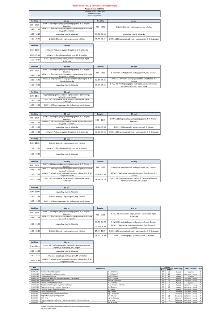 Wyższa Szkoła Edukacji Zdrowotnej i Nauk Społecznych Rok akademicki 2012/2013 Plan zajęć Studia Edukacyjne 2 semestr I stopnia studia stacjonarne Godziny 23-lut S-HW.I.I.11 Diagnostyka psychopedagogiczna, dr T. Wejner Jaworska S-HW.I.I.12 Teoretyczne podstawy procesów adaptacji i uczenia 10.45 - 12.15 się, prof. S. Lipiński Godziny 24-lut 9.00 - 12.00 S-HU.I.II.4 Emisja i higiena głosu, mgr J. Pałka 9.00 - 10.30 13.00 - 16.15 Język obcy, mgr M. Kijewska 13.00 - 16.15 Język obcy, mgr M. Kijewska 16.30 - 19.45 S-HU.I.II.4 Emisja i higiena głosu, mgr J. Pałka 16.30 - 19.45 S-HW.I.I.10 Psychologia zdrowia i wychowania, dr D. Strzelczyk Godziny 17-mar 9.00 - 12.00 S-HW.I.I.14 Metody badań pedagogicznych, dr J. Ciuciura Godziny 09-mar 9.00 - 12.00 S-HW.I.I.9 Podstawy dydaktyki ogólnej, dr K. Witerska 12.15- 15.30 S-HW.I.I.13 Socjologia edukacji, prof. M. Szymański 16.00 - 19.30 S-HU.I.II.5 Poznawanie siebie, innych i środowiska, mgr I. Szafarczyk Godziny 16-mar S-HW.I.I.11 Diagnostyka psychopedagogiczna, dr T. Wejner Jaworska S-HW.I.I.12 Teoretyczne podstawy procesów adaptacji i uczenia 10.45 - 12.15 się, prof. S. Lipiński S-HW.I.I.15 Współczesne koncepcje i systemy edukacyjne, dr M. 12.30 - 15.45 Kamper-Kubańska 9.00 - 10.30 16.00 - 19.15 Język obcy, mgr M. Kijewska Godziny 06-kwi Psychopedagogika twórczości, wprowadzenie do trenningu twórczości, dr A. Szpak S-HU.I.II.5 Poznawanie siebie, innych i środowiska, mgr I. Szafarczyk 9.00 - 12.15 12.30 - 15.45 16.00 - 19.45 12.30 - 15.45 16.00 - 19.15 S-HW.I.I.16 Wybrane koncepcje i systemy filozoficzne, dr J. Ciuciura S-HU.I.II.8 Psychopedagogika twórczości, wprowadzenie do trenningu twórczości, dr A. Szpak S-HW.I.I.17 Podstawy prawa dla pedagogów, mgr P. Bezat Godziny 13-kwi S-HW.I.I.11 Diagnostyka psychopedagogiczna, dr T. Wejner Jaworska S-HW.I.I.12 Teoretyczne podstawy procesów adaptacji i uczenia 10.45 - 12.15 się, prof. S. Lipiński Godziny 14-kwi 8.30 - 12.30 S-HW.I.I.11 Diagnostyka psychopedagogiczna, dr T. Wejner Jaworska 9.00 - 10.30 12.30 - 15.45 Język obcy, mgr M. Kijewska 12.30 - 15.45 S-HW.I.I.11 Pedagogika społeczna, prof. D. Marzec 16.00 - 19.15 S-HW.I.I.9 Podstawy dydaktyki ogólnej, dr K. Witerska 16.00 - 19.15 S-HW.I.I.10 Psychologia zdrowia i wychowania, dr D. Strzelczyk Godziny 12-maj 9.00 - 12.00 S-HW.I.I.14 Metody badań pedagogicznych, dr J. Ciuciura Godziny 27-kwi 9.00 - 12.00 S-HU.I.II.4 Emisja i higiena głosu, mgr J. Pałka 12.15 - 15.30 S-HW.I.I.13 Socjologia edukacji, prof. M. Szymański 16.00 - 19.15 Język obcy, mgr M. Kijewska Godziny 11-maj S-HW.I.I.11 Diagnostyka psychopedagogiczna, dr T. Wejner Jaworska S-HW.I.I.12 Teoretyczne podstawy procesów adaptacji i uczenia 10.45 - 12.15 się, prof. S. Lipiński S-HW.I.I.15 Współczesne koncepcje i systemy edukacyjne, dr M. 12.30 - 15.45 Kamper-Kubańska S-HU.I.II.5 Poznawanie siebie, innych i środowiska, mgr I. 16.00 - 19.15 Szafarczyk 9.00 - 10.30 Godziny 01-cze 9.00 - 12.00 Język obcy, mgr M. Kijewska 12.30 - 15.45 S-HU.I.II.4 Emisja i higiena głosu, mgr J. Pałka 16.00 - 19.45 S-HW.I.I.17 Podstawy prawa dla pedagogów, mgr P. Bezat Godziny 08-cze S-HW.I.I.11 Diagnostyka psychopedagogiczna, dr T. Wejner Jaworska S-HW.I.I.12 Teoretyczne podstawy procesów adaptacji i uczenia 10.45 - 12.15 się, prof. S. Lipiński 12.30 - 15.45 16.00 - 19.15 Godziny 09-cze 9.00 - 11.15 S-HU.I.II.5 Poznawanie siebie, innych i środowiska, mgr I. Szafarczyk 9.00 - 10.30 12.30 - 15.45 16.00 - 18.15 Godziny 22-cze 9.30 - 11.45 S-HU.I.II.8 Psychopedagogika twórczości, wprowadzenie do trenningu twórczości, dr A. Szpak 12.00 - 13.30 Język obcy, mgr M. Kijewska 13.30 - 15.00 S-HW.I.I.13 Socjologia edukacji, prof. M. Szymański 15.15 - 16.45 S-HW.I.I.15 Współczesne koncepcje i systemy edukacyjne, dr M. Kamper-Kubańska Kod przedmiotu S-HW.I.I.9 S-HW.I.I.10 S-HW.I.I.11 S-HW.I.I.12 S-HW.I.I.13 S-HW.I.I.14 S-HW.I.I.15 S-HW.I.I.16 S-HW.I.I.17 S-HU.I.II.4 S-HU.I.II.5 S-HU.I.II.6 S-HU.I.II.7 S-HU.I.II.8 S-HU.I.II.9 11.30 - 13.00 S-HW.I.I.14 Metody badań pedagogicznych, dr J. Ciuciura 13.00 - 14.30 S-HW.I.I.16 Wybrane koncepcje i systemy filozoficzne, dr J. Ciuciura 14.30 - 16.00 S-HW.I.I.10 Psychologia zdrowia i wychowanie, dr D. Strzelczyk 16.15 - 20.00 S-HW.I.I.11 Pedagogika społeczna, prof. D. Marzec Język obcy, mgr M. Kijewska S-HU.I.II.4 Emisja i higiena głosu, mgr J. Pałka S-HW.I.I.16 Wybrane koncepcje i systemy filozoficzne, dr J. Ciuciura S-HU.I.II.8 Psychopedagogika twórczości, wprowadzenie do trenningu twórczości, dr A. Szpak Prowadzący Podstawy dydaktyki ogólnej Psychologia zdrowia i wychowania Pedagogika społeczna Teoretyczne podstawy procesów adaptacji i uczenia się Socjologia edukacji Metody badań pedagogicznych Współczesne koncepcje i systemy edukacyjne Wybrane koncepcje i systemy filozoficzne Podstawy prawa dla pedagogogów Emisja i higiena głosu Poznawanie siebie, innych i środowiska Diagnostyka psychopedagogiczna Język obcy Psychopedagogika twórczości - wprowadzenie do treningu twórczości WF* *Zebranie informacyjne dotyczące Wychowania fizycznego odbędzie się 24 lutego o godz. 12.15 w auli Uczelni dr K. Witerska dr D. Strzelczyk prof. D. Marzec prof. S. Lipiński prof. M. Szymański dr J. Ciuciura dr M. Kamper - Kubańska dr J. Ciuciura dr P. Bezat mgr J. Pałka mgr I. Szafarczyk dr T. Wejner mgr M. Kijewska dr A. Szpak mgr M. Szpak Godziny Trad. WKNO 10 20 10 20 10 20 10 20 10 15 10 20 10 20 10 15 10 10 15 5 15 5 15 15 30 40 15 5 15 Forma zajęć Forma zaliczenia ECTS Wykład Wykład Wykład Wykład Wykład Wykład Wykład Wykład Wykład Ćwiczenia Ćwiczenia Ćwiczenia Lektorat Ćwiczenia Ćwiczenia Egzamin Zaliczenie z oceną Egzamin Zaliczenie z oceną Zaliczenie z oceną Egzamin Zaliczenie z oceną Zaliczenie z oceną Zaliczenie z oceną Zaliczenie z oceną Zaliczenie z oceną Zaliczenie z oceną Zaliczenie z oceną Zaliczenie z oceną Zaliczenie z oceną 3 3 2 2 3 3 2 2 1 1 1 3 2 1 1