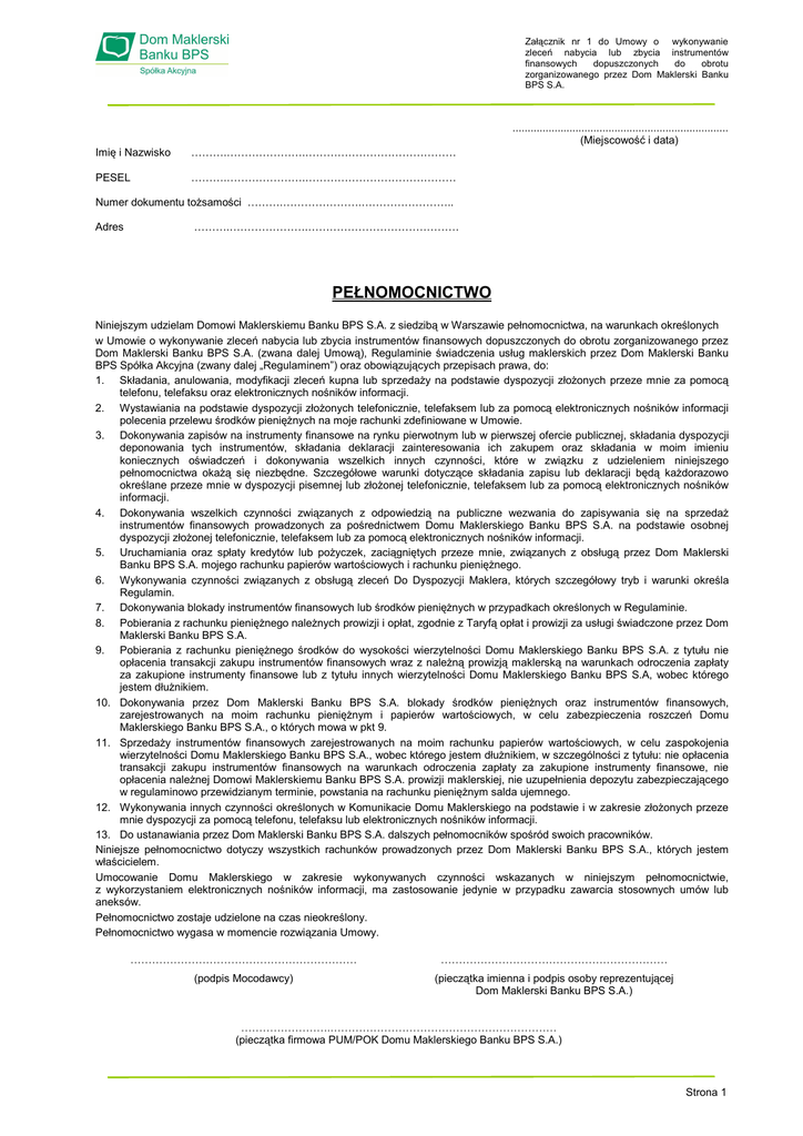 Załącznik nr 1 do Umowy o wykonywanie zleceń nabycia lub zbycia instrumentów finansowych dopuszczonych do obrotu zorganizowanego przez Dom Maklerski Banku BPS S.A. ........................................................................ (Miejscowość i data) Imię i Nazwisko ……….………………….…………………………………… PESEL ……….………………….…………………………………… Numer dokumentu toŜsamości ……….………………….…………………….. Adres ……….………………….…………………………………… PEŁNOMOCNICTWO Niniejszym udzielam Domowi Maklerskiemu Banku BPS S.A. z siedzibą w Warszawie pełnomocnictwa, na warunkach określonych w Umowie o wykonywanie zleceń nabycia lub zbycia instrumentów finansowych dopuszczonych do obrotu zorganizowanego przez Dom Maklerski Banku BPS S.A. (zwana dalej Umową), Regulaminie świadczenia usług maklerskich przez Dom Maklerski Banku BPS Spółka Akcyjna (zwany dalej „Regulaminem”) oraz obowiązujących przepisach prawa, do: 1. Składania, anulowania, modyfikacji zleceń kupna lub sprzedaŜy na podstawie dyspozycji złoŜonych przeze mnie za pomocą telefonu, telefaksu oraz elektronicznych nośników informacji. 2. Wystawiania na podstawie dyspozycji złoŜonych telefonicznie, telefaksem lub za pomocą elektronicznych nośników informacji polecenia przelewu środków pienięŜnych na moje rachunki zdefiniowane w Umowie. 3. Dokonywania zapisów na instrumenty finansowe na rynku pierwotnym lub w pierwszej ofercie publicznej, składania dyspozycji deponowania tych instrumentów, składania deklaracji zainteresowania ich zakupem oraz składania w moim imieniu koniecznych oświadczeń i dokonywania wszelkich innych czynności, które w związku z udzieleniem niniejszego pełnomocnictwa okaŜą się niezbędne. Szczegółowe warunki dotyczące składania zapisu lub deklaracji będą kaŜdorazowo określane przeze mnie w dyspozycji pisemnej lub złoŜonej telefonicznie, telefaksem lub za pomocą elektronicznych nośników informacji. 4. Dokonywania wszelkich czynności związanych z odpowiedzią na publiczne wezwania do zapisywania się na sprzedaŜ instrumentów finansowych prowadzonych za pośrednictwem Domu Maklerskiego Banku BPS S.A. na podstawie osobnej dyspozycji złoŜonej telefonicznie, telefaksem lub za pomocą elektronicznych nośników informacji. 5. Uruchamiania oraz spłaty kredytów lub poŜyczek, zaciągniętych przeze mnie, związanych z obsługą przez Dom Maklerski Banku BPS S.A. mojego rachunku papierów wartościowych i rachunku pienięŜnego. 6. Wykonywania czynności związanych z obsługą zleceń Do Dyspozycji Maklera, których szczegółowy tryb i warunki określa Regulamin. 7. Dokonywania blokady instrumentów finansowych lub środków pienięŜnych w przypadkach określonych w Regulaminie. 8. Pobierania z rachunku pienięŜnego naleŜnych prowizji i opłat, zgodnie z Taryfą opłat i prowizji za usługi świadczone przez Dom Maklerski Banku BPS S.A. 9. Pobierania z rachunku pienięŜnego środków do wysokości wierzytelności Domu Maklerskiego Banku BPS S.A. z tytułu nie opłacenia transakcji zakupu instrumentów finansowych wraz z naleŜną prowizją maklerską na warunkach odroczenia zapłaty za zakupione instrumenty finansowe lub z tytułu innych wierzytelności Domu Maklerskiego Banku BPS S.A, wobec którego jestem dłuŜnikiem. 10. Dokonywania przez Dom Maklerski Banku BPS S.A. blokady środków pienięŜnych oraz instrumentów finansowych, zarejestrowanych na moim rachunku pienięŜnym i papierów wartościowych, w celu zabezpieczenia roszczeń Domu Maklerskiego Banku BPS S.A., o których mowa w pkt 9. 11. SprzedaŜy instrumentów finansowych zarejestrowanych na moim rachunku papierów wartościowych, w celu zaspokojenia wierzytelności Domu Maklerskiego Banku BPS S.A., wobec którego jestem dłuŜnikiem, w szczególności z tytułu: nie opłacenia transakcji zakupu instrumentów finansowych na warunkach odroczenia zapłaty za zakupione instrumenty finansowe, nie opłacenia naleŜnej Domowi Maklerskiemu Banku BPS S.A. prowizji maklerskiej, nie uzupełnienia depozytu zabezpieczającego w regulaminowo przewidzianym terminie, powstania na rachunku pienięŜnym salda ujemnego. 12. Wykonywania innych czynności określonych w Komunikacie Domu Maklerskiego na podstawie i w zakresie złoŜonych przeze mnie dyspozycji za pomocą telefonu, telefaksu lub elektronicznych nośników informacji. 13. Do ustanawiania przez Dom Maklerski Banku BPS S.A. dalszych pełnomocników spośród swoich pracowników. Niniejsze pełnomocnictwo dotyczy wszystkich rachunków prowadzonych przez Dom Maklerski Banku BPS S.A., których jestem właścicielem. Umocowanie Domu Maklerskiego w zakresie wykonywanych czynności wskazanych w niniejszym pełnomocnictwie, z wykorzystaniem elektronicznych nośników informacji, ma zastosowanie jedynie w przypadku zawarcia stosownych umów lub aneksów. Pełnomocnictwo zostaje udzielone na czas nieokreślony. Pełnomocnictwo wygasa w momencie rozwiązania Umowy. ……………………………………………………… ……………………………………………………… (podpis Mocodawcy) (pieczątka imienna i podpis osoby reprezentującej Dom Maklerski Banku BPS S.A.) …………………….……………………………………………………… (pieczątka firmowa PUM/POK Domu Maklerskiego Banku BPS S.A.) Strona 1