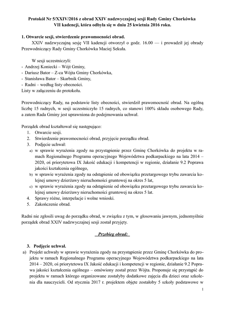 Protokół Nr 5/XXIV/2016 z obrad XXIV nadzwyczajnej sesji Rady Gminy Chorkówka VII kadencji, która odbyła się w dniu 25 kwietnia 2016 roku. 1. Otwarcie sesji, stwierdzenie prawomocności obrad. XXIV nadzwyczajną sesję VII kadencji otworzył o godz. 16.00 — i prowadził jej obrady Przewodniczący Rady Gminy Chorkówka Maciej Sekuła. W sesji uczestniczyli: - Andrzej Koniecki – Wójt Gminy, - Dariusz Bator – Z-ca Wójta Gminy Chorkówka, - Stanisława Bator – Skarbnik Gminy, - Radni – według listy obecności. Listy w załączeniu do protokołu. Przewodniczący Rady, na podstawie listy obecności, stwierdził prawomocność obrad. Na ogólną liczbę 15 radnych, w sesji uczestniczyło 15 radnych, co stanowi 100% składu osobowego Rady, a zatem Rada Gminy jest uprawniona do podejmowania uchwał. Porządek obrad kształtował się następująco: 1. Otwarcie sesji. 2. Stwierdzenie prawomocności obrad, przyjęcie porządku obrad. 3. Podjęcie uchwał: a) w sprawie wyrażenia zgody na przystąpienie przez Gminę Chorkówka do projektu w ra mach Regionalnego Programu operacyjnego Województwa podkarpackiego na lata 2014 – 2020, oś priorytetowa IX Jakość edukacji i kompetencji w regionie, działanie 9.2 Poprawa jakości kształcenia ogólnego, b) w sprawie wyrażenia zgody na odstąpienie od obowiązku przetargowego trybu zawarcia ko lejnej umowy dzierżawy nieruchomości gruntowej na okres 5 lat, c) w sprawie wyrażenia zgody na odstąpienie od obowiązku przetargowego trybu zawarcia ko lejnej umowy dzierżawy nieruchomości gruntowej na okres 5 lat. 4. Sprawy różne, interpelacje i wolne wnioski. 5. Zakończenie obrad. Radni nie zgłosili uwag do porządku obrad, w związku z tym, w głosowaniu jawnym, jednomyślnie porządek obrad XXIV nadzwyczajnej sesji został przyjęty. Przebieg obrad: 3. Podjęcie uchwał. a) Projekt uchwały w sprawie wyrażenia zgody na przystąpienie przez Gminę Chorkówka do pro jektu w ramach Regionalnego Programu operacyjnego Województwa podkarpackiego na lata 2014 – 2020, oś priorytetowa IX Jakość edukacji i kompetencji w regionie, działanie 9.2 Popra wa jakości kształcenia ogólnego – omówiony został przez Wójta. Proponuje się przystąpić do projektu w ramach którego organizowane zostałyby dodatkowe zajęcia dla dzieci oraz szkole nia dla nauczycieli. Od stycznia 2017 r. projektem objęte zostałoby 5 szkoły podstawowe w 1 Chorkówce, Draganowej, Faliszówce, Kobylanach i Kopytowej. Przewodniczący Rady Gminy odczytał projekt uchwały, następnie poddał go pod głosowanie. Po przeprowadzonym głosowaniu Przewodniczący Rady ustalił, że na ustawowy skład Rady – 15 radnych, w sesji brało udział – 15 radnych, za przyjęciem powyższej uchwały głosowało – 15 radnych, przeciw – 0 radnych, wstrzymało się – 0 radnych. W głosowaniu jawnym Uchwała Nr XXIV/176/2016 Rady Gminy Chorkówka z dnia 25 kwietnia 2016 r. w sprawie wyrażenia zgody na przystąpienie przez Gminę Chorkówka do projektu w ramach Regionalnego Programu operacyjnego Województwa podkarpackiego na lata 2014 – 2020, oś priorytetowa IX Jakość edukacji i kompetencji w regionie, działanie 9.2 Poprawa jakości kształcenia ogólnego – została podjęta. Następnie Wójt omówił kolejne dwa projekty chwał dotyczących wyrażenia zgody na odstąpie nie od obowiązku przetargowego trybu zawarcia kolejnej umowy dzierżawy nieruchomości gruntowej na okres 5 lat. b) Projekt uchwały w sprawie wyrażenia zgody na odstąpienie od obowiązku przetargowego trybu zawarcia kolejnej umowy dzierżawy nieruchomości gruntowej na okres 5 lat – Przewodniczący Rady Gminy odczytał projekt uchwały, następnie poddał go pod głosowanie. Po przeprowadzonym głosowaniu Przewodniczący Rady ustalił, że na ustawowy skład Rady – 15 radnych, w sesji brało udział – 15 radnych, za przyjęciem powyższej uchwały głosowało – 15 radnych, przeciw – 0 radnych, wstrzymało się – 0 radnych. W głosowaniu jawnym Uchwała Nr XXIV/177/2016 Rady Gminy Chorkówka z dnia 25 kwiet nia 2016 r. w sprawie wyrażenia zgody na odstąpienie od obowiązku przetargowego trybu za warcia kolejnej umowy dzierżawy nieruchomości gruntowej na okres 5 lat – została podjęta. c) Projekt uchwały w sprawie wyrażenia zgody na odstąpienie od obowiązku przetargowego trybu zawarcia kolejnej umowy dzierżawy nieruchomości gruntowej na okres 5 lat – Przewodniczący Rady Gminy odczytał projekt uchwały, następnie poddał go pod głosowanie. Po przeprowadzonym głosowaniu Przewodniczący Rady ustalił, że na ustawowy skład Rady – 15 radnych, w sesji brało udział – 15 radnych, za przyjęciem powyższej uchwały głosowało – 15 radnych, przeciw – 0 radnych, wstrzymało się – 0 radnych. W głosowaniu jawnym Uchwała Nr XXIV/178/2016 Rady Gminy Chorkówka z dnia 25 kwiet nia 2016 r. w sprawie wyrażenia zgody na odstąpienie od obowiązku przetargowego trybu za warcia kolejnej umowy dzierżawy nieruchomości gruntowej na okres 5 lat – została podjęta. 4. Sprawy różne, interpelacje i wolne wnioski. W sprawach różnych Wójt Andrzej Koniecki przedstawił radnym następujące sprawy: 1) Omówił ogłoszony nabór na wolne stanowisko pracy w Urzędzie – ds. funduszy unijnych. W konkursie wpłynęło dwie oferty. 2) Kolejnie przedstawił sprawę dotacji zakupu samochodu strażackiego dla OSP Draganowa. Warunkiem uzyskania dotacji jest wkład własny w wysokości 50%. Wójt zapytał czy na najbliższą sesję w projekcie zmian w budżecie zarezerwować środki na ten cel? Radni wyrazili zgodę na przeznaczenie środków na ten cel. 3) Następnie Wójt przedstawił propozycję przejęcia dróg w strefie ekonomicznej na rzecz Gminy. Wiceprzewodniczący Rady Gminy Mieczysław Czelny – zapytał o podział nadwyżki budżetowej. Zapytał czy w bieżącym roku podział nadwyżki odbędzie się jak w ubiegłych latach z zastosowaniem skalowania środk