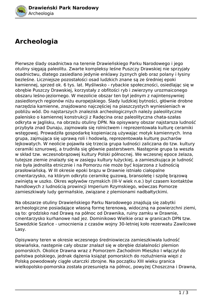 Drawieński Park Narodowy Archeologia Archeologia Pierwsze ślady osadnictwa na terenie Drawieńskiego Parku Narodowego i jego otuliny sięgają paleolitu. Zwarte kompleksy leśne Puszczy Drawskiej nie sprzyjały osadnictwu, dlatego zasiedlano jedynie enklawy żyznych gleb oraz polany i łysiny bezleśne. Liczniejsze pozostałości osad ludzkich znane są ze średniej epoki kamiennej, sprzed ok. 6 tys. lat. Myśliwsko - rybackie społeczności, osiedlając się w obrębie Puszczy Drawskiej, korzystały z obfitości ryb i zwierzyny urozmaiconego obszaru leśno-jeziornego. W mezolicie obszar ten był jednym z najintensywniej zasiedlonych regionów niżu europejskiego. Ślady ludzkiej bytności, głównie drobne narzędzia kamienne, znajdowano najczęściej na piaszczystych wyniesieniach w pobliżu wód. Do najstarszych znalezisk archeologicznych należy paleolityczne palenisko o kamiennej konstrukcji z Radęcina oraz paleolityczna chata-szałas odkryta w Jaglisku, na obrzeżu otuliny DPN. Na opisywany obszar najstarsza ludność przybyła znad Dunaju, zajmowała się rolnictwem i reprezentowała kulturę ceramiki wstęgowej. Prowadziła gospodarkę kopieniaczą używając motyk kamiennych. Inna grupa, zajmująca się uprawą roli i hodowlą, reprezentowała kulturę pucharów lejkowatych. W neolicie pojawiła się trzecia grupa ludności zaliczana do tzw. kultury ceramiki sznurowej, a trudniła się głównie pasterstwem. Następnie grupa ta weszła w skład tzw. wczesnobrązowej kultury Polski północnej. We wczesnej epoce żelaza, tutejsze ziemie znalazły się w zasięgu kultury łużyckiej, a zamieszkująca je ludność nie była jednolita etnicznie i na Pomorzu nie może być kojarzona z ludnością prasłowiańską. W III okresie epoki brązu w Drawnie istniało ciałopalne cmentarzysko, na którym odkryto ceramikę guzową, bransoletę i szpilę brązową zwiniętą w uszko. Okres wpływów rzymskich (III-V wiek n.e.) był czasem kontaktów handlowych z ludnością prowincji Imperium Rzymskiego, wówczas Pomorze zamieszkiwały ludy germańskie, związane z plemionami nadbałtyckimi. Na obszarze otuliny Drawieńskiego Parku Narodowego znajdują się zabytki archeologiczne posiadające własną formę terenową, widoczną na powierzchni ziemi, są to: grodzisko nad Drawą na północ od Drawnika, ruiny zamku w Drawnie, cmentarzysko kurhanowe nad jez. Dominikowo Wielkie oraz w granicach DPN tzw. Szwedzkie Szańce - umocnienia z czasów wojny 30-letniej koło rezerwatu Zawilcowe Lasy. Opisywany teren w okresie wczesnego średniowiecza zamieszkiwała ludność słowiańska, następnie cały obszar znalazł się w obrębie działalności plemion pomorskich. Okolice Drawna wraz z Pomorzem Zachodnim Mieszko I włączył do państwa polskiego, jednak dążenia książąt pomorskich do rozluźnienia więzi z Polską powodowały ciągłe utarczki zbrojne. Na początku XIII wieku granica wielkopolsko-pomorska została przesunięta na północ, powyżej Choszczna i Drawna, 1/3 Drawieński Park Narodowy Archeologia a cały teren wszedł w skład Wielkopolski. W wyniku waśni między książętami wielkopolskimi a pomorskimi, po śmierci Przemysła II, nastąpiły znaczące zmiany dla tego obszaru - teren aż po Gwdę opanowali margrabiowie brandenburscy. Stał się częścią Nowej Marchii. Wtedy pojawił się ród rycerski Wedlów, który odegrał znaczącą rolę dla tych ziem. Wedlowie występowali, w potyczkach z książętami pomorskimi, po stronie Brandenburgii, ale później oddali swe posiadłości Polsce. W drugiej połowie XIV wieku Ziemia Wałecka z Tucznem i Człopą powróciła do Polski, a granica wielkopolsko-brandenburska ustaliła się aż do wieku XVIII na linii dolnej Drawy i Płocicznej, z niewielkimi zmianami. Od początku XV wieku rozpoczęło się na tym terenie panowanie krzyżackie, gdyż Zakon nabył Nową Marchię jako zastaw pożyczki. Okres ten był pełen niepokoju i obfitował w potyczki i bitwy między poplecznikami Zakonu a jego przeciwnikami, co skończyło się sprzedaniem Nowej Marchii w 1454 roku elektorowi brandenburskiemu. Od średniowiecza po wiek XIX trwał z nierównym nasileniem proces kolonizacji Puszczy Drawskiej, w jego toku wiele powstałych osad pustoszało i było lokowanych na nowo. W okresie średniowiecza miała miejsce akcja kolonizacji, w której ważną rolę pełniły zakony. Pierwsze nadania otrzymali joannici, ale nie mieli większego znaczenia w dziejach Nowej Marchii, natomiast zakon cysterski wywodzący się z Francji w sposób istotny zaznaczył swoją bytność na tym obszarze. Od 1293 roku istniało opactwo cysterskie w Bierzwniku. Zakon o obowiązku pracy na roli budował tamy i jazy, osuszał podmokłe tereny, karczował lasy, zagospodarowywał nieużytki i budował młyny. W latach trzydziestych XVI wieku likwidowano dobra cysterskie i weszły one w skład bierzwnickiej domeny państwowej. Lokacja nowych osad i zaludnianie opustoszałych wsi Puszczy Drawskiej miało miejsce w XVI wieku, w okresie względnego spokoju na tym obszarze. Swoją akcję kolonizacyjną prowadził Rüdiger Wedel z Drawna, powstały wtedy: Brzeziny, Dominikowi, Głusko, Ostrowiec, Krępa, Niemieńsko, Nowa Korytnica, Nowa Studnica, Miradz, Rościn, Sitno, Brzeźniak. Następna akcja kolonizacyjna prowadzona była przez brandenburską domenę państwową i odbyła się w XVII wieku. Powstało wtedy Radachowo, nową lokalizację, przy drodze solnej z Wielkopolski do Kołobrzegu, zyskał Zatom. W wyniku kolonizacji fryderycjańskiej założono wsie Łęczyn, Mostniki, Moczele, a w końcu XVIII wieku i na początku XIX powstały wsie folwarczne, jak Święciechów, Podegrodzie, Borowiec, Dłusko, Konotop. Od połowy XIX wieku, po wcześniejszych akcjach kolonizacyjnych w Puszczy Drawskiej, zaczął się stopniowy proces wycofywania się osadnictwa z lasów. Obecne tereny Drawieńskiego Parku Narodowego przez cały XIX wiek znajdowały się pod administrowaniem
