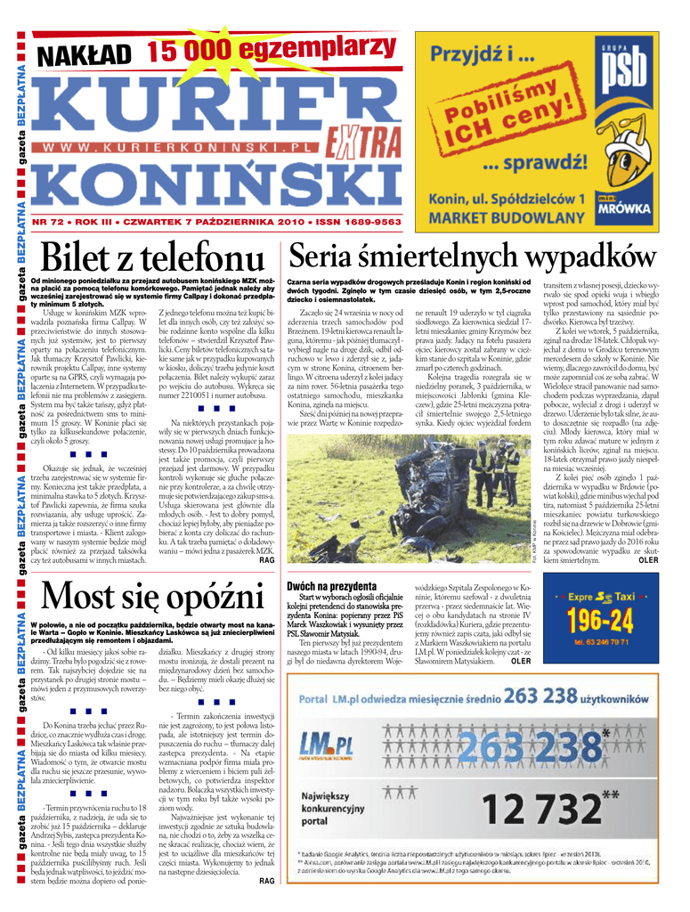 NR 72 l ROK III l CZWARTEK 7 PAŹDZIERNIKA 2010 l ISSN 1689-9563 Bilet z telefonu Seria śmiertelnych wypadków Od minionego poniedziałku za przejazd autobusem konińskiego MZK można płacić za pomocą telefonu komórkowego. Pamiętać jednak należy aby wcześniej zarejestrować się w systemie firmy Callpay i dokonać przedpłaty minimum 5 złotych. Czarna seria wypadków drogowych prześladuje Konin i region koniński od dwóch tygodni. Zginęło w tym czasie dziesięć osób, w tym 2,5-roczne dziecko i osiemnastolatek. Usługę w konińskim MZK wprowadziła poznańska firma Callpay. W przeciwieństwie do innych stosowanych już systemów, jest to pierwszy oparty na połączeniu telefonicznym. Jak tłumaczy Krzysztof Pawlicki, kierownik projektu Callpay, inne systemy oparte są na GPRS, czyli wymagają połączenia z Internetem. W przypadku telefonii nie ma problemów z zasięgiem. System ma być także tańszy, gdyż płatność za pośrednictwem sms to minimum 15 groszy. W Koninie płaci się tylko za kilkusekundowe połączenie, czyli około 5 groszy. Zaczęło się 24 września w nocy od zderzenia trzech samochodów pod Brzeźnem. 19-letni kierowca renault laguna, któremu - jak później tłumaczył wybiegł nagle na drogę dzik, odbił odruchowo w lewo i zderzył się z, jadącym w stronę Konina, citroenem berlingo. W citroena uderzył z kolei jadący za nim rover. 56-letnia pasażerka tego ostatniego samochodu, mieszkanka Konina, zginęła na miejscu. Sześć dni później na nowej przeprawie przez Wartę w Koninie rozpędzo- ne renault 19 uderzyło w tył ciągnika siodłowego. Za kierownicą siedział 17letni mieszkaniec gminy Krzymów bez prawa jazdy. Jadący na fotelu pasażera ojciec kierowcy został zabrany w ciężkim stanie do szpitala w Koninie, gdzie zmarł po czterech godzinach. Kolejna tragedia rozegrała się w niedzielny poranek, 3 października, w miejscowości Jabłonki (gmina Kleczew), gdzie 25-letni mężczyzna potrącił śmiertelnie swojego 2,5-letniego synka. Kiedy ojciec wyjeżdżał fordem Dwóch na prezydenta wódzkiego Szpitala Zespolonego w Koninie, któremu szefował - z dwuletnią przerwą - przez siedemnaście lat. Więcej o obu kandydatach na stronie IV (rozkładówka) Kuriera, gdzie prezentujemy również zapis czata, jaki odbył się z Markiem Waszkowiakiem na portalu LM.pl. W poniedziałek kolejny czat - ze OLER Sławomirem Matysiakiem. n n n Okazuje się jednak, że wcześniej trzeba zarejestrować się w systemie firmy. Konieczna jest także przedpłata, a minimalna stawka to 5 złotych. Krzysztof Pawlicki zapewnia, że firma szuka rozwiązania, aby usługę uprościć. Zamierza ją także rozszerzyć o inne firmy transportowe i miasta. - Klient zalogowany w naszym systemie będzie mógł płacić również za przejazd taksówką czy też autobusami w innych miastach. Z jednego telefonu można też kupić bilet dla innych osób, czy też założyć sobie rodzinne konto wspólne dla kilku telefonów – stwierdził Krzysztof Pawlicki. Ceny biletów telefonicznych są takie same jak w przypadku kupowanych w kiosku, doliczyć trzeba jedynie koszt połączenia. Bilet należy wykupić zaraz po wejściu do autobusu. Wykręca się numer 2210051 i numer autobusu. n n n Na niektórych przystankach pojawiły się w pierwszych dniach funkcjonowania nowej usługi promujące ją hostessy. Do 10 października prowadzona jest także promocja, czyli pierwszy przejazd jest darmowy. W przypadku kontroli wykonuje się głuche połączenie przy kontrolerze, a za chwilę otrzymuje się potwierdzającego zakup sms-a. Usługa skierowana jest głównie dla młodych osób. - Jest to dobry pomysł, chociaż lepiej byłoby, aby pieniądze pobierać z konta czy doliczać do rachunku. A tak trzeba pamiętać o doładowywaniu – mówi jedna z pasażerek MZK. RAG Most się opóźni W połowie, a nie od początku października, będzie otwarty most na kanale Warta – Gopło w Koninie. Mieszkańcy Laskówca są już zniecierpliwieni przedłużającym się remontem i objazdami. - Od kilku miesięcy jakoś sobie radzimy. Trzeba było pogodzić się z rowerem. Tak najszybciej dojedzie się na przystanek po drugiej stronie mostu – mówi jeden z przymusowych rowerzystów. n n n Do Konina trzeba jechać przez Rudzicę, co znacznie wydłuża czas i drogę. Mieszkańcy Laskówca tak właśnie przebijają się do miasta od kilku miesięcy. Wiadomość o tym, że otwarcie mostu dla ruchu się jeszcze przesunie, wywołała zniecierpliwienie. n n n - Termin przywrócenia ruchu to 18 października, z nadzieją, że uda się to zrobić już 15 października – deklaruje Andrzej Sybis, zastępca prezydenta Konina. - Jeśli tego dnia wszystkie służby kontrolne nie będą miały uwag, to 15 października puścilibyśmy ruch. Jeśli będą jednak wątpliwości, to jeździć mostem będzie można dopiero od ponie- Fot. KMP w Koninie n n n gazeta BEZPŁATNA n n n gazeta BEZPŁATNA n n n gazeta BEZPŁATNA n n n gazeta BEZPŁATNA n n n gazeta BEZPŁATNA n n n gazeta BEZPŁATNA n n n y rz la p m ze g e 0 0 0 5 1 D ŁA K NA działku. Mieszkańcy z drugiej strony mostu ironizują, że dostali prezent na międzynarodowy dzień bez samochodu. – Będziemy mieli okazję dłużej się bez niego obyć. n n n - Termin zakończenia inwestycji nie jest zagrożony, to jest połowa listopada, ale istotniejszy jest termin dopuszczenia do ruchu – tłumaczy dalej zastępca prezydenta. - Na etapie wzmacniana podpór firma miała problemy z wierceniem i biciem pali żelbetowych, co potwierdza inspektor nadzoru. Bolączką wszystkich inwestycji w tym roku był także wysoki poziom wody. Najważniejsze jest wykonanie tej inwestycji zgodnie ze sztuką budowlaną, nie chodzi o to, żeby za wszelką cenę skracać realizację, chociaż wiem, że jest to uciążliwe dla mieszkańców tej części miasta. Wykonujemy to jednak na następne dziesięciolecia. RAG Start w wyborach ogłosili oficjalnie kolejni pr