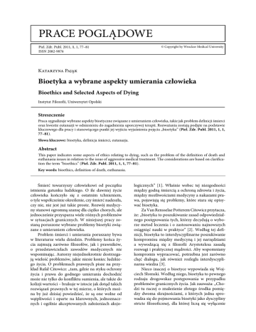 prace poglądowe Piel. Zdr. Publ. 2011, 1, 1, 77–81 ISSN 2082-9876 © Copyright by Wroclaw Medical University Katarzyna Pająk Bioetyka a wybrane aspekty umierania człowieka Bioethics and Selected Aspects of Dying Instytut Filozofii, Uniwersytet Opolski Streszczenie Praca sygnalizuje wybrane aspekty bioetyczne związane z umieraniem człowieka, takie jak problem definicji śmierci oraz kwestie eutanazji w odniesieniu do zagadnienia uporczywej terapii. Rozważania zostają podjęte na podstawie kluczowego dla pracy i stanowiącego punkt jej wyjścia wyjaśnienia pojęcia „bioetyka” (Piel. Zdr. Publ. 2011, 1, 1, 77–81). Słowa kluczowe: bioetyka, definicja śmierci, eutanazja. Abstract This paper indicates some aspects of ethics relating to dying, such as the problem of the definition of death and euthanasia issues in relation to the issue of aggressive medical treatment. The considerations are based on clarification the term “bioethics” (Piel. Zdr. Publ. 2011, 1, 1, 77–81). Key words: bioethics, definition of death, euthanasia. Śmierć towarzyszy człowiekowi od początku istnienia gatunku ludzkiego. O ile dawniej życie człowieka kończyło się z ostatnim tchnieniem, o tyle współcześnie określenie, czy śmierć nadeszła, czy nie, nie jest już takie proste. Rozwój medycyny stanowi ogromną szansę dla ciężko chorych, ale jednocześnie przysparza wiele różnych problemów w sytuacjach granicznych. W niniejszej pracy zostaną poruszone wybrane problemy bioetyki związane z umieraniem człowieka. Problem śmierci i umierania poruszany bywa w literaturze wielu dziedzin. Problemy końca życia zajmują zarówno filozofów, jak i prawników, o przedstawicielach zawodów medycznych nie wspominając. Autorzy niejednokrotnie dostrzegają wielość problemów, jakie niesie koniec ludzkiego życia. O problemach prawnych pisze na przykład Rafał Citowicz: „tam, gdzie na styku ochrony życia i prawa do godnego umierania dochodzić może nie tylko do konfliktu sumienia, ale także do kolizji wartości – brakuje w istocie jak dotąd takich rozwiązań prawnych w tej mierze, o których można by już dzisiaj powiedzieć, że są one wolne od wątpliwości i oparte na klarownych, jednoznacznych i ogólnie akceptowanych założeniach aksjo- logicznych” [1]. Właśnie wobec tej niezgodności między godną śmiercią a ochroną zdrowia i życia, między możliwościami medycyny a nakazami prawa, pojawiają się problemy, które stara się opisywać bioetyka. Za Van Rensselae Potterem Citowicz przytacza, że: „bioetyka to poszukiwanie zasad odpowiedzialnego postępowania tych, którzy decydują o wyborze metod leczenia i o zastosowaniu najnowszych osiągnięć nauki w praktyce” [2]. Według tej definicji, bioetyka to interdyscyplinarne poszukiwanie kompromisu między medycyną i jej narzędziami a wywodzącą się z filozofii Arystotelesa zasadą rozwagi i praktycznej mądrości. Aby wspomniany kompromis wypracować, potrzebna jest zarówno chęć dialogu, jak również rozległa interdyscyplinarna wiedza [3]. Nieco inaczej o bioetyce wypowiada się Wojciech Słomski. Według niego, bioetyka to pewnego rodzaju drogowskaz postępowania w przypadku problemów granicznych życia. Jak zauważa: „Chodzi tu raczej o znalezienie złotego środka pomiędzy dwoma skrajnościami, z których jedna sprowadza się do pojmowania bioetyki jako dyscypliny stricte filozoficznej, dla której liczą się wyłącznie 78 problemy i rozstrzygnięcia teoretyczne i która nie bierze (lub stara się nie brać) pod uwagę praktycznych implikacji własnych wyników, oraz drugą, polegającą na traktowaniu bioetyki nieomal jako części medycyny, jako technicznej biegłości w rozwiązywaniu etycznych problemów pojawiających się w praktyce medycznej” [4]. Tak więc według Słomskiego bioetyka może być zarówno dyscypliną typowo teoretyczną, akademicką polegającą na czystym namyśle w oderwaniu od rzeczywistości albo niemal przeciwnie. Bioetyka może być traktowana instrumentalnie jako część medycyny ustalająca określone rozwiązania wobec pojawiających się problemów, z którymi spotykają się przedstawiciele dyscyplin medycznych. Traktowanie bioetyki instrumentalnie, jako dyscypliny pomocniczej dla medycyny, może prowadzić do niebezpieczeństwa absolutyzacji i ustalania pewnych słusznych rozwiązań w świetle określonych praktyk, które po upływie pewnego czasu przestają być aktualne i odpowiednie. Takie twarde traktowanie bioetyki nie sprzyja ciągłemu namysłowi nad zmieniającą się rzeczywistością, zresztą na ile można nazwać etykę szczegółową etyką, jeśli pozbawia się wątpliwości, wprowadzając określone zasady i procedury postępowania, na ile etyka jest etyką, jeśli nie próbuje rozwiązywać za każdym razem na nowo problemów związanych z praktyką, w tym przypadku medyczną? Warto mieć te wątpliwości na uwadze. Jak dalej pisze Słomski: „wielu autorów podkreśla, że współczesna medycyna stała się zbiurokratyzowaną instytucją, w której pojedyncze osoby pełnią wąskie, wyspecjalizowane funkcje, często tracąc z pola widzenia cele tej instytucji jako całości” [5]. Trzeba mieć przed oczami wyraźny podział między etyką a medycyną i specyfiką obu tych dyscyplin. Należałoby się także zastanowić, czy bioetyka traktowana jako wąska, specjalistyczna dziedzina medycyny ciągle jest etyką, czy już jest narzędziem uzasadniającym jakieś konkretne medyczne działanie. Można też rozważyć, czy etyka ma uzasadniać, czy też poddawać pod rozwagę i stawiać pytania, na które trudno jest znaleźć jednoznaczne odpowiedzi. Jak dalej pisze ten sam autor, aby bioetyka mogła dostrzec cele medycyny i je właściwie ocenić „nie może ani sama stać się częścią tej instytucji, ani też pozostać ściśle filozoficzną, akademicką spekulacją. Interdyscyplinarność jawi się w tym kontekście jako wymóg, 