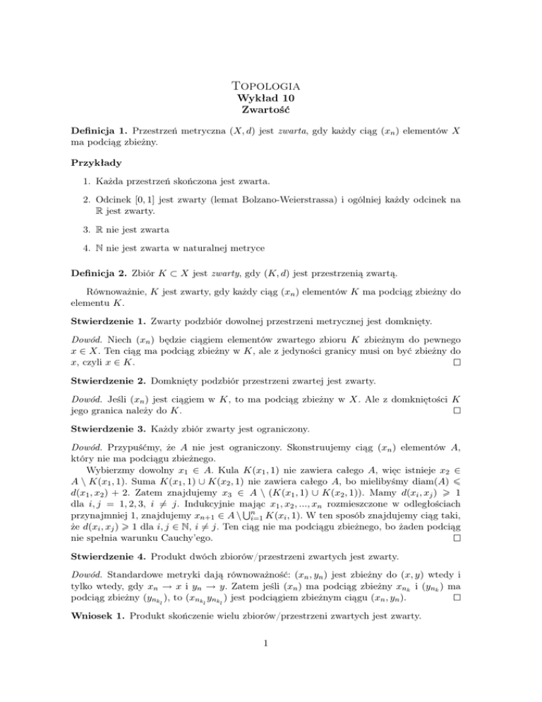 Topologia Wykład 10 Zwartość Definicja 1. Przestrzeń metryczna (X, d) jest zwarta, gdy każdy ciąg (xn ) elementów X ma podciąg zbieżny. Przykłady 1. Każda przestrzeń skończona jest zwarta. 2. Odcinek [0, 1] jest zwarty (lemat Bolzano-Weierstrassa) i ogólniej każdy odcinek na R jest zwarty. 3. R nie jest zwarta 4. N nie jest zwarta w naturalnej metryce Definicja 2. Zbiór K ⊂ X jest zwarty, gdy (K, d) jest przestrzenią zwartą. Równoważnie, K jest zwarty, gdy każdy ciąg (xn ) elementów K ma podciąg zbieżny do elementu K. Stwierdzenie 1. Zwarty podzbiór dowolnej przestrzeni metrycznej jest domknięty. Dowód. Niech (xn ) będzie ciągiem elementów zwartego zbioru K zbieżnym do pewnego x ∈ X. Ten ciąg ma podciąg zbieżny w K, ale z jedyności granicy musi on być zbieżny do x, czyli x ∈ K. Stwierdzenie 2. Domknięty podzbiór przestrzeni zwartej jest zwarty. Dowód. Jeśli (xn ) jest ciągiem w K, to ma podciąg zbieżny w X. Ale z domkniętości K jego granica należy do K. Stwierdzenie 3. Każdy zbiór zwarty jest ograniczony. Dowód. Przypuśćmy, że A nie jest ograniczony. Skonstruujemy ciąg (xn ) elementów A, który nie ma podciągu zbieżnego. Wybierzmy dowolny x1 ∈ A. Kula K(x1 , 1) nie zawiera całego A, więc istnieje x2 ∈ A \ K(x1 , 1). Suma K(x1 , 1) ∪ K(x2 , 1) nie zawiera całego A, bo mielibyśmy diam(A) ¬ d(x1 , x2 ) + 2. Zatem znajdujemy x3 ∈ A \ (K(x1 , 1) ∪ K(x2 , 1)). Mamy d(xi , xj ) 1 dla i, j = 1, 2, 3, i 6= j. Indukcyjnie mając x1 , x2 , ..., xn rozmieszczone w odległościach S przynajmniej 1, znajdujemy xn+1 ∈ A \ ni=1 K(xi , 1). W ten sposób znajdujemy ciąg taki, że d(xi , xj ) 1 dla i, j ∈ N, i 6= j. Ten ciąg nie ma podciągu zbieżnego, bo żaden podciąg nie spełnia warunku Cauchy’ego. Stwierdzenie 4. Produkt dwóch zbiorów/przestrzeni zwartych jest zwarty. Dowód. Standardowe metryki dają równoważność: (xn , yn ) jest zbieżny do (x, y) wtedy i tylko wtedy, gdy xn → x i yn → y. Zatem jeśli (xn ) ma podciąg zbieżny xnk i (ynk ) ma podciąg zbieżny (ynkl ), to (xnkl ynkl ) jest podciągiem zbieżnym ciągu (xn , yn ). Wniosek 1. Produkt skończenie wielu zbiorów/przestrzeni zwartych jest zwarty. 1 Wniosek 2. [a1 , b1 ] × ... × [an , bn ] jest zwarty w Rn . Twierdzenie 1. Zbiór K ⊂ Rn jest zwarty w metryce euklidesowej wtedy i tylko wtedy, gdy jest domknięty i ograniczony. Dowód. Wiemy już, że zbiór zwarty jest zawsze domknięty o ograniczony. Niech K ⊂ Rn będzie ograniczony. Wtedy K zawiera się w pewnej kuli K(0, r) ⊂ [−r, r]×...×[−r, r]. Ponieważ ten produkt jest zwarty, a domknięty podzbiór zbioru zwartego jest zwarty, mamy tezę. Uwaga. Domkniętość i ograniczoność nie gwarantuje zwartości w dowolnych przestrzeniach! Przykład: X = (0, 1) jest ograniczona i domknięta w sobie, ale nie jest zwarta, bo 1 n nie ma podciągu zbieznego. 2