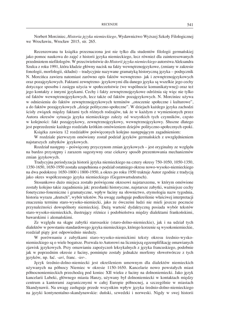 RECENZJE 541 Norbert Morciniec, Historia języka niemieckiego, Wydawnictwo Wyższej Szkoły Filologicznej we Wrocławiu, Wrocław 2015, str. 265. Recenzowana tu książka przeznaczona jest nie tylko dla studentów filologii germańskiej jako pomoc naukowa do zajęć z historii języka niemieckiego, lecz również dla zainteresowanych przedmiotem niefilologów. W przeciwieństwie do Historii języka niemieckiego autorstwa Aleksandra Szulca z roku 1991, która kładzie główny nacisk na fakty wewnętrznojęzykowe, (zmiany w zakresie fonologii, morfologii, składni) – tradycyjnie nazywane gramatyką historyczną języka – podręcznik N. Morcińca zawiera natomiast zarówno opis faktów wewnętrzno- jak i zewnętrznojęzykowych oraz pozajęzykowych. Faktami zewnętrzno- językowymi dla danego języka są wszelkie jego cechy dotyczące sposobu i zasięgu użycia w społeczeństwie (we wspólnocie komunikatywnej) oraz też jego kontakty z innymi językami. Cechy i fakty zewnętrznojęzykowe odróżnia się więc nie tylko od faktów wewnętrznojęzykowych, lecz także od faktów pozajęzykowych. N. Morciniec używa w odniesieniu do faktów zewnętrznojęzykowych terminów „otoczenie społeczne i kulturowe”, a do faktów pozajęzykowych „dzieje polityczno-społeczne”. W dziejach każdego języka zachodzi ścisły związek między faktami tych różnych rodzajów, tak że w każdym z wymienionych przez Autora okresów sytuacja języka niemieckiego zależy od wszystkich tych czynników, często w kolejności: fakt pozajęzykowy, zewnętrznojęzykowy, wewnętrznojęzykowy. Słuszne dlatego jest poprzedzenie każdego rozdziału krótkim omówieniem dziejów polityczno-społecznych epoki. Książka zawiera 12 rozdziałów poświęconych kolejno następującym zagadnieniom: W rozdziale pierwszym omówiony został podział języków germańskich z uwzględnieniem najstarszych zabytków językowych. Rozdział następny – poświęcony przyczynom zmian językowych – jest oryginalny ze względu na bardzo przystępny i zarazem sugestywny oraz ciekawy sposób prezentowania mechanizmów zmian językowych. Tradycyjna periodyzacja historii języka niemieckiego na cztery okresy 750-1050, 1050-1350, 1350-1650, 1650-1950 została uzupełniona o podział ostatniego okresu nowo-wysoko-niemieckiego na dwa podokresy 1650-1800 i 1800-1950, a okres po roku 1950 traktuje Autor zgodnie z tradycją jako okres współczesnego języka niemieckiego (Gegenwartsdeutsch). Stosunkowo dużo miejsca zostało poświęcone okresowi najstarszemu, w którym omówione zostały kolejno takie zagadnienia jak: przesłanki historyczne, najstarsze zabytki, ważniejsze cechy fonetyczno-fonemiczne i gramatyczne, wpływ łaciny na słownictwo, etymologia nazw tygodnia, historia wyrazu „deutsch”, wybór tekstów. Na uwagę zasługuje podkreślenie właściwej interpretacji znaczenia terminu staro-wysoko-niemiecki, jako że ówcześni ludzi nie mieli jeszcze poczucie przynależności dowspólnoty niemieckiej. Dużą wartość dydaktyczną posiada wybór tekstów staro-wysoko-niemieckich, ilustrujący różnice i podobieństwa między dialektami frankońskimi, bawarskimi i alemańskimi. Ze względu na skąpe zabytki starosaskie (staro-dolno-niemieckie), jak i na udział tych dialektów w powstaniu standardowego języka niemieckiego, którego korzenie są wysokoniemieckie, rozdział piąty jest odpowiednio nieduży. W porównaniu z zabytkami staro-wysoko-niemickimi teksty okresu średnio-wyskoniemieckiego są o wiele bogatsze. Pozwala to Autorowi na liczniejszą egzemplifikację omawianych zjawisk językowych. Przy omawianiu zapożyczeń leksykalnych z języka francuskiego, podobnie jak w poprzednim okresie z łaciny, pominięte zostały jednakże morfemy słowotwórcze z tych języków, np. łać. -ari, franc. -ier-. Język średnio-dolno-niemiecki jest określeniem umownym dla dialektów niemieckich używanych na północy Niemiec w okresie 1150-1650. Kancelarie nowo powstałych miast północnoniemieckich przechodzą pod koniec XII wieku z łaciny na dolnoniemiecki. Jako język kancelarii Lubeki, głównego miasta Hanzy, używany był dolnoniemiecki w kontaktach między centrum a kantorami zagranicznymi w całej Europie północnej, a szczególnie w miastach Skandynawii. Na uwagę zasługuje przede wszystkim wpływ języka średnio-dolno-niemieckiego na języki kontynentalno-skandynawskie: duński, szwedzki i norweski. Nigdy w swej historii 542 RECENZJE język niemiecki nie wywarł tak intensywnego wpływu na inne języki, jak to miało miejsce w okresie Hanzy na języki skandynawskie. Do dzisiaj około 30% zapożyczeń leksykalnych, a wraz z nimi liczne prefiksy i sufiksy są pochodzenia dolnoniemieckiego, co ułatwia znającemu język niemiecki opanowanie tych języków. Centralnym zagadnieniem historii języka niemieckiego jest prześledzenie i przeanalizowanie procesu powstawania ponaddialektalnego ogólnoniemieckiego języka pisanego. W kolejnym rozdziale traktującym o okresie wczesno-nowo-niemieckim przedstawione zostały m.in. tradycyjne teorie Müllenhoffa. Burdacha i Fringsa, na wspomniany temat. O ile Müllenhoff zakłada ciągłość rozwoju języka pisanego w kilku etapach od Karola Wielkiego do Lutra, opierając się na centrach ówczesnej władzy cesarskiej, to dla Burdacha podstawą współczesnego języka pisanego jest język kancelarii praskiej. Z kolei Frings oparł swoją tezę nie na tekstach pisanych, lecz na języku mówionym osadników na kolonialnych terenach wschodnioniemieckich. Te monocentryczne poglądy rozwijane w pracach Szkoły Lipskiej dominowały szczególnie w NRD. Autor konfrontuje je z wynikami nowszych badań tekstów pisanych nie tylko obszarów kolonialnych, lecz także starych terytoriów ówczesnej Rzeszy. Zgodnie z wynikami tych badań proces powstawania ogólnoniemieckiego języka pisanego miał charakter policentryczny. Proces ten został przedstawiony w podrozdziale poświęcony