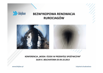 BEZWYKOPOWA RENOWACJA RUROCIAGÓW KONFERENCJA „WODA I ŚCIEKI W PRZEMYŚLE SPOŻYWCZYM” SŁOK K. BEŁCHATOWA 03-04.10.2013 www.blejkan.pl inżynieria budowlana ZAWARTOŚĆ PREZENTACJI 1. 2. 3. 4. 5. 6. 7. 8. 9. 10. Historia Spółki Władze Spółki Polityka ZSZ Stan zatrudnienia na przestrzeni lat Schemat organizacyjny Dane finansowe Oferta technologiczna Sprzęt Dlaczego metody bezwykopowe? Wykaz zrealizowanych kontraktów i robót inżynieria budowlana www.blejkan.pl Historia Spółki Władze Spółki HISTORIA SPÓŁKI •Firma BLEJKAN Sp. z o.o. powstała we wrześniu 2007 r. jako Przedsiębiorstwo Renowacji Kanalizacji Blejkan Sp. z o.o. •Pierwsza siedziba Spółki znajdowała się w Gryfinie, przy ul. Iwaszkiewicza 22/10 •W 2012 roku Spółka została przeniesiona do Szczecina na ul. Szafera 146/6 •Obecnie siedziba Spółki mieści się w Szczecinie przy ul. Łukasińskiego 116 WŁADZE SPÓŁKI •Właściciele (udziałowcy): Jakub Blejsz Waldemar Dzudziak •Zarząd Spółki: Jakub Blejsz – Prezes Zarządu •Prokurenci: Iwona Kubeczka – Kątny – Dyrektor Finansowa Ewelina Minc inżynieria budowlana www.blejkan.pl ZINTEGROWANY SYSTEM ZARZĄDZANIA W 2010 roku Spółka wdrożyła Zintegrowany System Zarządzania Jakością i Środowiskiem W kwietniu 2013 roku Spółka przeszła pomyślnie audyt certyfikujący z zakresu BS OHSAS 18001:2007, rozszerzając tym samym Zintegrowany System Zarządzania o Bezpieczeństwo i Higienę Pracy. Spółka Blejkan Sp. z o.o. posiada certyfikaty potwierdzające zgodność stosowanych procedur w zakresie norm : ISO 9001:2008- zarządzanie jakością ISO 14001:2004 - zarządzanie środowiskiem OHSAS 18001:2007 - zarządzanie bezpieczeństwem i higieną pracy. Treść certyfikatu jest następująca : "Projektowanie i realizacja prac renowacyjnych, modernizacyjnych i naprawczych sieci kanalizacyjnych, wodnych, gazowych i przewodów technologicznych" inżynieria budowlana www.blejkan.pl Stan zatrudnienia w latach 2007-2013 Data 31.12.2007 31.12.2008 31.12.2009 31.12.2010 31.12.2011 01.11.2012 31.12.2012 31.07.2013 inżynieria budowlana www.blejkan.pl Umysłowi Fizyczni 2 22 8 28 7 23 7 20 6 15 7 49 8 52 26 61 Ogółem 24 36 30 27 21 56 60 87 Schemat organizacyjny inżynieria budowlana www.blejkan.pl Dane finansowe mln zł Rok 2012 2013 * inżynieria budowlana Zysk z działalności operacyjnej w mln zł 5 823,43 mln zł 2 729,70 mln zł Przychody ze sprzedaży w mln zł 13 099,90 mln zł 13 349,70 mln zł * stan na dzień 30.06.2013 r. www.blejkan.pl Oferta i technologie Renowacja kolektorów kanalizacyjnych, sieci sanitarnych, wodociągowych, przemysłowych i gazowych Renowacja studni i komór kanalizacyjnych Renowacja obiektów inżynierskich, zbiorników oczyszczania ścieków i stacji uzdatniania wody www.blejkan.pl inżynieria budowlana Dlaczego metody bezwykopowe? 1. brak lub minimalizacja robót ziemnych. W przypadku bezwykopowej budowy nowych przewodów wywożona jest wyłącznie objętość gruntu równa kubaturze wbudowywanych bezwykopowo rur. Z kolei odnawiając bezwykopowo przewody kanalizacyjne w wielu przypadkach nie wykonuje się jakichkolwiek robót ziemnych, korzystając z dostępu do przewodów poprzez studzienki kanalizacyjne. W przypadku niektórych technologii odnowy stosowanych głównie w rurociągach ciśnieniowych konieczne jest wykonanie wykopów początkowego, końcowego, a czasami także wykopów pośrednich w miejscach występowania przyłączy. inżynieria budowlana www.blejkan.pl Dlaczego metody bezwykopowe? 2. w przypadku stosowania technologii bezwykopowej renowacji poniżej zwierciadła wody gruntowej nie stosuje się robót odwodnieniowych. Prace te szczególnie przy występowaniu gruntów o niskim współczynniku filtracji są bardzo kosztowne i czasochłonne. W przypadku większości technologii bezwykopowej budowy możliwa jest ich realizacja również bez wykonywania robót odwodnieniowych. inżynieria budowlana www.blejkan.pl Dlaczego metody bezwykopowe? 3. brak lub ograniczenie do minimum powierzchni nawierzchni ulicznych koniecznych do rozbiórki, a następnie ich odtworzenia, ponieważ większość technologii wymaga jedynie wykonania wykopów początkowych i końcowych, a niektóre stosowane w odnowie kanalizacji nie wymagają żadnych wykopów. Przyczynia się to także do zmniejszenia obszaru nawierzchni zagrożonej w przyszłości ryzykiem osiadania oraz wystąpienia innych uszkodzeń. inżynieria budowlana www.blejkan.pl Dlaczego metody bezwykopowe? 4.ograniczenie transportu z uwagi na ograniczenie zakresu niektórych robót (np. wykopowych), bądź eliminację innych robót (nie wykonywanie deskowania wykopu, zagęszczenia gruntu, nie wykonywania podłoża itp.). Poza oszczędnością kosztów uzyskuje się dodatkowo istotną redukcję uciążliwości środowiskowych związanych z ograniczeniem ilości wytwarzanych spalin, hałasu, kurzu oraz zanieczyszczeń, które pojawiają się w przypadku stosowania robót wykopowych, inżynieria budowlana www.blejkan.pl Dlaczego metody bezwykopowe? 6.niezanieczyszczanie wód gruntowych w obszarze stosowania technologii bezwykopowych, 7. nie stwarzanie zagrożeń dla zieleni. W trakcie realizacji robót wykopowych uszkodzone korzenie drzew i krzewów często są przyczyną ich wysychania, 8. eliminacja ryzyka wystąpienia uszkodzeń budowli znajdujących się w sąsiedztwie budowanych lub odnawianych przewodów. W przypadku stosowania technologii wykopowych często ma miejsce przesuszenie terenów znajdujących się w sąsiedztwie budynków co może powodować ryzyko wystąpienia zarysowań ich konstrukcji. Niekorzystne mogą być także drgania spowodowane np. wbijaniem w grunt stalowych deskowań czy osuwania się gruntu spoza wykopu w kierunku do wykopu, inżynieria budowlana www.blejkan.pl Dlaczego metody bezwykopowe? 9. eliminacja ryzyka uszkodzenia innych sieci lub kabli znajdujących się w pobliżu planowanych wykopów lub ułożonych w poprzek c