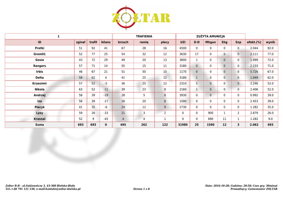 1 TRAFIENIA ZUŻYTA AMUNICJA ID zginał trafił bilans brzuch ramię plecy UZI D-D Mhgun Shg Snp efekt.(%) wynik Pretki 51 92 41 67 28 16 4500 0 0 0 0 2.044 92.0 Grom01 52 77 25 54 32 12 3630 17 0 0 0 2.111 77.0 Gosia 43 72 29 49 20 13 3600 1 0 0 0 1.999 72.0 Rangers 57 71 14 55 15 11 3180 0 0 0 0 2.233 71.0 Irbis 46 67 21 51 50 10 1170 0 0 0 0 5.726 67.0 Delta 58 62 4 41 25 12 3180 1 0 0 0 1.949 62.0 Krzesimir 57 52 -5 36 25 12 2310 5 0 0 0 2.246 52.0 Nikola 63 52 -11 39 23 8 2160 1 0 0 0 2.406 52.0 Andrzej 58 39 -19 28 5 8 3930 0 0 0 0 0.992 39.0 Iza 56 39 -17 26 20 8 1590 0 0 0 0 2.453 39.0 Piecyk 41 35 -6 24 12 9 2730 0 0 0 0 1.282 35.0 Lysy 59 26 -33 21 3 2 0 0 900 1 2 2.879 26.0 Krasnal 52 9 -43 4 4 1 0 0 690 11 1 1.282 9.0 Suma 693 693 0 495 262 122 31980 25 1590 12 3 2.062 693 Zoltar B-B - ul.Sukiennicza 3, 43-300 Bielsko-Biała Tel.:+48 791 121 530, e-mail:[email protected] Strona 1 z 8 Data: 2016-10-28; Godzina: 20:50; Czas gry: 30minut Prowadzący: Gamemaster ZOLTAR 1 TRAFIENIA ZUŻYTA AMUNICJA ID zginał trafił bilans brzuch ramię plecy UZI D-D Mhgun Shg Snp efekt.(%) wynik Krasnal 23 28 5 20 15 1 1680 0 0 0 0 1.667 28.0 Pretki 19 28 9 23 6 3 5550 0 0 0 0 0.505 28.0 Krzesimir 13 27 15 15 14 4 4800 0 0 0 0 0.563 27.0 Grom01 22 20 -2 16 4 3 3600 0 0 0 0 0.556 20.0 Rangers 19 16 -2 15 2 2 1860 0 0 0 0 0.860 16.0 Andrzej 11 16 5 14 4 1 7620 0 0 0 0 0.210 16.0 Lysy 18 3 -14 2 1 0 0 0 2220 12 1 0.134 3.0 Suma 125 138 16 105 46 14 25110 0 2220 12 1 0.505 138 2 TRAFIENIA ZUŻYTA AMUNICJA ID zginał trafił bilans brzuch ramię plecy UZI D-D Mhgun Shg Snp efekt.(%) wynik Iza 25 27 2 12 15 5 2250 0 0 0 0 1.200 27.0 Delta 27 27 0 16 13 5 4230 0 0 0 0 0.638 27.0 Nikola 27 19 -8 14 7 1 5280 0 0 0 0 0.360 19.0 Piecyk 15 18 3 5 15 0 3390 0 0 0 0 0.531 18.0 Gosia 22 16 -6 13 6 0 1620 5 0 0 0 0.985 16.0 Irbis 22 15 -7 6 13 2 1140 1 0 0 0 1.315 15.0 Suma 138 122 -16 66 69 13 17910 6 0 0 0 0.681 122 Zoltar B-B - ul.Sukiennicza 3, 43-300 Bielsko-Biała Tel.:+48 791 121 530, e-mail:[email protected] 1 2 138 122 Strona 2 z 8 Data: 2016-10-28; Godzina: 21:32; Czas gry: 30minut Prowadzący: Gamemaster ZOLTAR 1 TRAFIENIA ZUŻYTA AMUNICJA ID zginał trafił bilans brzuch ramię plecy UZI D-D Mhgun Shg Snp efekt.(%) wynik Krasnal 32 52 20 32 37 6 3270 0 0 0 0 1.590 52.0 Pretki 19 40 21 30 11 4 5700 0 0 0 0 0.702 40.0 Krzesimir 19 32 13 14 23 3 5160 1 0 0 0 0.620 32.0 Grom01 35 23 -12 16 12 2 3960 0 0 0 0 0.581 23.0 Rangers 23 15 -8 11 5 2 2040 0 0 0 0 0.735 15.0 Andrzej 22 8 -14 5 3 0 2910 0 0 0 0 0.275 8.0 Lysy 19 1 -18 1 0 0 0 0 2640 18 8 0.038 1.0 Suma 169 171 2 109 91 17 23040 1 2640 18 8 0.665 171 2 TRAFIENIA ZUŻYTA AMUNICJA ID zginał trafił bilans brzuch ramię plecy UZI D-D Mhgun Shg Snp efekt.(%) wynik Piecyk 22 39 17 27 17 1 3930 0 0 0 0 0.992 39.0 Irbis 32 35 3 25 15 6 2370 0 0 0 0 1.477 35.0 Nikola 35 29 -6 29 5 0 4590 0 0 0 0 0.632 29.0 Delta 28 27 -1 21 11 2 4320 0 0 0 0 0.625 27.0 Gosia 20 23 3 19 2 3 3600 0 0 0 0 0.639 23.0 Iza 34 16 -18 8 10 0 3630 0 0 0 0 0.441 16.0 Suma 171 169 -2 129 60 12 22440 0 0 0 0 0.753 169 Zoltar B-B - ul.Sukiennicza 3, 43-300 Bielsko-Biała Tel.:+48 791 121 530, e-mail:[email protected] 1 2 171 169 Strona 3 z 8 Data: 2016-10-28; Godzina: 22:33; Czas gry: 30minut Prowadzący: Gamemaster ZOLTAR 1 TRAFIENIA ZUŻYTA AMUNICJA ID zginał trafił bilans brzuch ramię plecy UZI D-D Mhgun Shg Snp efekt.(%) wynik Pretki 20 40 20 27 17 2 4650 0 0 0 0 0.860 40.0 Krzesimir 15 36 21 16 24 1 6960 0 0 0 0 0.517 36.0 Krasnal 39 33 -6 21 20 4 2940 0 0 0 0 1.122 33.0 Rangers 24 20 -2 13 8 1 3360 0 0 0 0 0.595 20.0 Grom01 28 15 -13 11 5 1 4440 0 0 0 0 0.338 15.0 Andrzej 23 9 -14 7 2 0 3750 6 0 0 0 0.240 9.0 Lysy 19 3 -16 3 0 0 0 0 3330 10 7 0.090 3.0 Cel 14 0 -14 0 0 0 0 0 0 0 0 0.000 0.0 Suma 182 156 -24 98 76 9 26100 6 3330 10 7 0.530 156 2 TRAFIENIA ZUŻYTA AMUNICJA ID zginał trafił bilans brzuch ramię plecy UZI D-D Mhgun Shg Snp efekt.(%) wynik Irbis 23 40 17 29 16 4 2850 0 0 0 0 1.404 40.0 Iza 26 38 13 32 16 3 5220 0 0 0 0 0.728 38.0 Gosia 21 30 10 23 4 4 4950 3 0 0 0 0.606 30.0 Nikola 35 28 -7 25 5 2 4260 0 0 0 0 0.657 28.0 Delta 22 24 2 19 10 0 3030 0 0 0 0 0.792 24.0 Piecyk 21 20 -1 13 7 3 3660 0 0 0 0 0.546 20.0 Cel2 10 0 -10 0 0 0 0 0 0 0 0 0.000 0.0 Suma 158 180 24 141 58 16 23970 3 0 0 0 0.751 180 Zoltar B-B - ul.Sukiennicza 3, 43-300 Bielsko-Biała Tel.:+48 791 121 530, e-mail:[email protected] 2 1 180 156 Strona 4 z 8 Data: 2016-10-28; Godzina: 23:16; Czas gry: 30minut Prowadzący: Gamemaster ZOLTAR Drużyny Rozgrywki Miejsce Nazwa 1 Zoltar B-B - ul.Sukiennicza 3, 43-300 Bielsko-Biała Tel.:+48 791 121 530, e-mail:[email protected] 2 3 4 Suma 2 - 122 169 180 471 1 - 138 171 156 465 Strona 5 z 8 Data: 2016-10-28 Prowadzący: Gamemaster ZOLTAR Zestawienie wg wyniku Miejsce TRAFIENIA ZUŻYTA AMUNICJA ID zginał trafił bilans brzuch ramię plecy UZI D-D Mhgun Shg Snp efekt.(%) wynik Pretki 54.50 100.00 45.50 73.50 31.00 12.50 10200.00 0.00 0.00 0.00 0.00 0.980 100.00 Irbis 61.50 78.50 17.00 55.50 47.00 11.00 3765.00 0.50 0.00 0.00 0.00 2.085 78.50 Krzesimir 52.00 73.50 21.50 40.50 43.00 10.00 9615.00 3.00 0.00 0.00 0.00 0.764 73.50 4 Gosia 53.00 70.50 17.50 52.00 16.00 10.00 6885.00 4.50 0.00 0.00 0.00 1.023 70.50 5 Delta 67.50 70.00 2.50 48.50 29.50 9.50 7380.00 0.50 0.00 0.00 0.00 0.948 70.00 6 Grom01 68.50 67.50 -1.00 48.50 26.50 9.00 7815.00 8.50 0.00 0.00 0.00 0.863 67.50 7 Nikola 80.00 64.00 -16.00 53.50 20.00 5.50 8145.00 0.50 0.00 0.00 0.00 0.786 64.00 Rangers 61.50 61.00 -0.50 47.00 15.00 8.00 5220.00 0.00 0.00 0.00 0.00 1.169 Krasnal 73.00 61.00 -12.00 38.50 38.00 6.00 3945.00 0.00 345.00 5.50 0.50 1.420 9 Iza 70.50 60.00 -10.50 39.00 30.50 8.00 6345.00 0.00 0.00 0.00 0.00 0.946 60.00 10 Piecyk 49.50 56.00 6.50 34.50 25.50 6.50 6855.00 0.00 0.00 0.00 0.00 0.817 56.00 11 Andrzej 57.00 36.00 -21.00 27.00 7.00 4.50 9105.00 3.00 0.00 0.00 0.00 0.395 36.00 12 Lysy 57.50 16.50 -41.00 13.50 2.00 1.00 0.00 0.00 4545.00 20.50 9.00 0.361 16.50 Cel2 20.00 0.00 