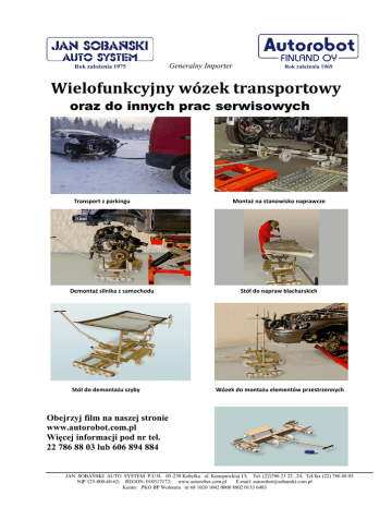 Generalny Importer Wielofunkcyjny wózek transportowy oraz do innych prac serwisowych Transport z parkingu Demontaż silnika z samochodu Stół do demontażu szyby Montaż na stanowisko naprawcze Stół do napraw blacharskich Wózek do montażu elementów przestrzennych Obejrzyj film na naszej stronie www.autorobot.com.pl Więcej informacji pod nr tel. 22 786 88 03 lub 606 894 884 JAN SOBAŃSKI AUTO SYSTEM P.U.H. 05-230 Kobyłka ul. Konopnickiej 13; Tel. (22)786 23 22...24, Tel/fax (22) 786 88 03 NIP 125-000-60-62; REGON: 010317172; www.autorobot.com.pl E-mail: [email protected] Konto: PKO BP Wołomin nr 68 1020 1042 0000 8802 0133 6403