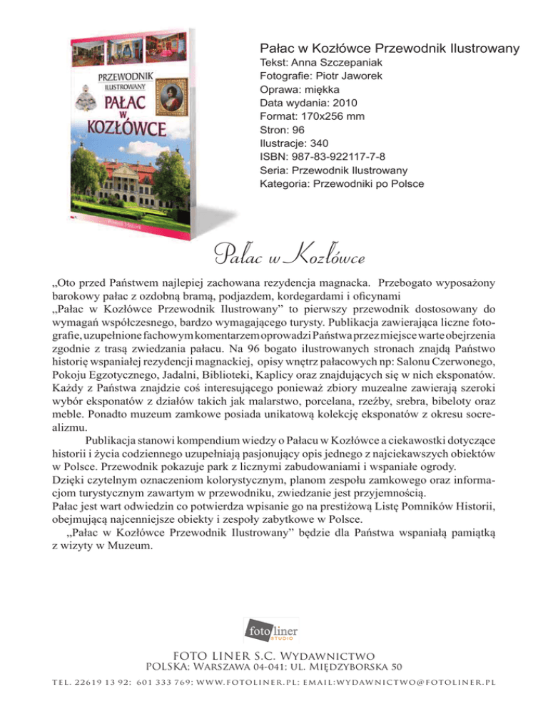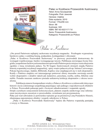Pałac w Kozłówce Przewodnik Ilustrowany Tekst: Anna Szczepaniak Fotografie: Piotr Jaworek Oprawa: miękka Data wydania: 2010 Format: 170x256 mm Stron: 96 Ilustracje: 340 ISBN: 987-83-922117-7-8 Seria: Przewodnik Ilustrowany Kategoria: Przewodniki po Polsce Pałac w Kozłówce „Oto przed Państwem najlepiej zachowana rezydencja magnacka. Przebogato wyposażony barokowy pałac z ozdobną bramą, podjazdem, kordegardami i oficynami „Pałac w Kozłówce Przewodnik Ilustrowany” to pierwszy przewodnik dostosowany do wymagań współczesnego, bardzo wymagającego turysty. Publikacja zawierająca liczne fotografie, uzupełnione fachowym komentarzem oprowadzi Państwa przez miejsce warte obejrzenia zgodnie z trasą zwiedzania pałacu. Na 96 bogato ilustrowanych stronach znajdą Państwo historię wspaniałej rezydencji magnackiej, opisy wnętrz pałacowych np: Salonu Czerwonego, Pokoju Egzotycznego, Jadalni, Biblioteki, Kaplicy oraz znajdujących się w nich eksponatów. Każdy z Państwa znajdzie coś interesującego ponieważ zbiory muzealne zawierają szeroki wybór eksponatów z działów takich jak malarstwo, porcelana, rzeźby, srebra, bibeloty oraz meble. Ponadto muzeum zamkowe posiada unikatową kolekcję eksponatów z okresu socrealizmu. Publikacja stanowi kompendium wiedzy o Pałacu w Kozłówce a ciekawostki dotyczące historii i życia codziennego uzupełniają pasjonujący opis jednego z najciekawszych obiektów w Polsce. Przewodnik pokazuje park z licznymi zabudowaniami i wspaniałe ogrody. Dzięki czytelnym oznaczeniom kolorystycznym, planom zespołu zamkowego oraz informacjom turystycznym zawartym w przewodniku, zwiedzanie jest przyjemnością. Pałac jest wart odwiedzin co potwierdza wpisanie go na prestiżową Listę Pomników Historii, obejmującą najcenniejsze obiekty i zespoły zabytkowe w Polsce. „Pałac w Kozłówce Przewodnik Ilustrowany” będzie dla Państwa wspaniałą pamiątką z wizyty w Muzeum. FOTO LINER S.C. Wydawnictwo POLSKA; Warszawa 04-041; ul. Międzyborska 50 t e l . 2 2 6 1 9 1 3 9 2 ; 6 0 1 3 3 3 7 6 9 ; w w w. f otol i n e r . p l ; e m a i l : w y d aw n i c t w o @ f otol i n e r . p l