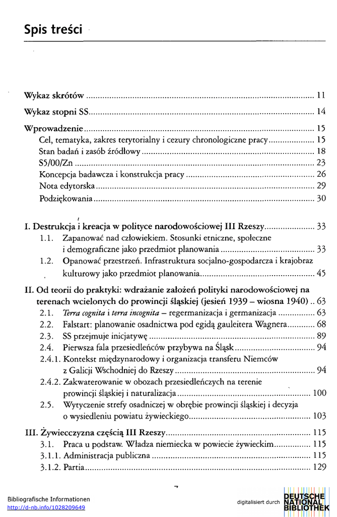 Spis treści Wykaz skrótów 11 Wykaz stopni SS 14 Wprowadzenie Cel, tematyka, zakres terytorialny i cezury chronologiczne pracy Stan badań i zasób źródłowy S5/00/Zn Koncepcja badawcza i konstrukcja pracy Nota edytorska 15 15 18 23 26 29 Podziękowania 30 I I. Destrukcja i kreacja w polityce narodowościowej III Rzeszy 33 1.1. Zapanować nad człowiekiem. Stosunki etniczne, społeczne i demograficzne jako przedmiot planowania 33 1.2. Opanować przestrzeń. Infrastruktura socjalno-gospodarcza i krajobraz kulturowy jako przedmiot planowania 45 II. Od teorii do praktyki: wdrażanie założeń polityki narodowościowej na terenach wcielonych do prowincji śląskiej (jesień 1939 — wiosna 1940).. 63 2.1. Terra cognita i terra incognita — regermanizacja i germanizacja 63 2.2. Falstart: planowanie osadnictwa pod egidą gauleitera Wagnera 68 2.3. SS przejmuje inicjatywę 89 2.4. Pierwsza fala przesiedleńców przybywa na Śląsk 94 2.4.1. Kontekst międzynarodowy i organizacja transferu Niemców z Galicji Wschodniej do Rzeszy 94 2.4.2. Zakwaterowanie w obozach przesiedleńczych na terenie prowincji śląskiej i naturalizacja 100 2.5. Wytyczenie strefy osadniczej w obrębie prowincji śląskiej i decyzja o wysiedleniu powiatu żywieckiego 103 III. Żywiecczyzna częścią III Rzeszy 3.1. Praca u podstaw. Władza niemiecka w powiecie żywieckim 3.1.1. Administracja publiczna 3.1.2. Partia http://d-nb.info/1028209649 115 115 115 129 Spis treści 3.1.3. Landrat Eugen Hering i jego pozycja w narodowosocjalistycznym systemie władzy 3.2. Jeszcze Europa czy już Azja? Powiat żywiecki w oczach władzy niemieckiej 3.2.1. Historia 3.2.2. Ludność 3.2.3. Gospodarka i infrastruktura 136 142 142 145 148 IV. „Aktion Saybusch" — poligon doświadczalny i katalizator w procesie rozbudowy górnośląskiego aparatu Komisariatu Rzeszy do spraw Umacniania Niemczyzny (wiosna 1940 - wiosna 1941) 162 4.1. Z niemiecką precyzją. Przygotowania do akcji 162 4.1.1. Czyszczenie przedpola: wywózki Polaków zdatnych do pracy na teren tzw. Starej Rzeszy 162 4.1.2. Utworzenie sztabu osiedleńczego i jego działalność 165 4.1.3. Specjalista do spraw kolonizacji — SS-Obersturmbannfiihrer dr Fritz Arlt.... 182 4.1.4. Utworzenie sztabu ewakuacyjnego (wysiedleńczego), organizacja sił policyjnych i logistyka 195 4.2. Modus operandi 209 4.2.1. Deportacja Polaków 210 Wyrzucenie z domów 210 Obozy zbiorcze — filtracja i „ostatnie kuszenie" .v. 227 Transport pociągami do Generalnego Gubernatorstwa 233 Los osób przeznaczonych na germanizację 246 4.2.2. Osiedlenie Niemców z Galicji Wschodniej 249 Przygotowanie gospodarstw dla osadników 249 Przybycie osadników na Żywiecczyznę i wprowadzenie ich do gospodarstw ..251 Pomoc dla osadników w początkowym okresie aklimatyzacyjnym 256 4.2.3. Przesiedlenie wewnętrzne Polaków 265 4.3. Zakończenie akcji i jej bilans 276 V. „Siedlungsaktion Buchenland" — kolonizacja w warunkach przedłużającej się wojny (jesień 1940 — jesień 1944) 5.1. Aparat Komisariatu Rzeszy do spraw Umacniania Niemczyzny w regionie po „Aktion Saybusch" 5.1.1. Regulacja stosunków z organami Głównego Urzędu Bezpieczeństwa Rzeszy — utworzenie UWZ Kattowitz 5.1.2. Próba sił z resortem rolnictwa i utworzenie Sonderkommando SLG 5.1.3. Rozbudowa, transformacja i atrofia struktur Komisariatu Rzeszy do spraw Umacniania Niemczyzny w regionie 5.1.4. Wzorowa placówka — SS na Żywiecczyźnie 5.2. Druga fala przesiedleńców przybywa na Śląsk 5.2.1. Kontekst międzynarodowy i organizacja transferu Niemców z Bukowiny do Rzeszy 8 300 300 300 306 312 332 335 335 Spis treści 5.2.2. Zakwaterowanie w obozach przesiedleńczych na terenie prowincji śląskiej/górnośląskiej i naturalizacja 5-3. Osiedlenie Niemców z Bukowiny 5.3.1. Geneza: kalkulacje demograficzno-przestrzenne (jesień 1940 — zima 1940/1941) 5.3.2. Wstrzymanie transportów do Generalnego Gubernatorstwa i adaptacja akcji osadniczej do nowej sytuacji geostrategicznej III Rzeszy wiosną 1941 r 5.3.3. Akcja osadnicza w okresie od wiosny 1941 do wiosny 1942 r 5.3.4. Akcja osadnicza w okresie od lata 1942 do jesieni 1944 r. i bilans kolonizacji 5.4. Wysiedlenia Polaków 5.4.1. Pokłosie „Aktion Saybusch" Sytuacja wysiedlonych w Generalnym Gubernatorstwie 339 350 350 361 367 394 398 398 398 Powroty na Żywiecczyznę wiosną i latem 1941 r. i druga deportacja (wrzesień 1941 r.) 402 5.4.2. Przesiedlenia wewnętrzne i deportacje do Polenlagrów w latach 1941—1944 oraz bilans wysiedleń 5.4.3. Alternatywa wysiedlenia — niemiecka lista narodowościowa 411 435 VI. Raz na zawsze. Likwidacja własności obywateli państwa polskiego 6.1. Podstawy prawne i aparat wywłaszczeń 6.2. Zajęcie mienia w sektorze rolnym 6.3. Zajęcie mienia w sektorze mieszkaniowym 6.4. Zajęcie mienia w sektorach przemysłu, rzemiosła, handlu i usług 6.5. Kontrowersje wokół majątku rodziny Habsburgów 447 447 456 459 464 470 VII. Oderint dum metuant. Pacyfikacja społeczeństwa polskiego 7.1. Aparat terroru 7.2. Egzekucje i deportacje do obozów koncentracyjnych 7.3. Ucisk ekonomiczny 7.4. Prześladowania w sferach religii i szkolnictwa 7.5. Izolacja, eksploatacja i wysiedlenie Żydów 479 479 489 496 511 521 VIII. „Żołnierze bez mundurów". Opieka nad osadnikami niemieckimi... 529 8.1. Finansowanie kolonizacji 529 8.2. Adaptacja ekonomiczna 541 8.3. Rekompensaty majątkowe 562 8.4. Indoktrynacja i edukacja 574 IX. Ku rajskim ogrodom — Raumplanung 9-1. Organy planowania przestrzennego na Górnym Śląsku 9-2. Warunki naturalne mikroregionu żywieckiego i możliwości ich wykorzystania 9-3. Projekt Musterdorf Kamesznica 9 583 583 587 594 Spis treści 9.4. Projekt Hauptdorfbereich Milówka 9.5. Projekty zagospodarowania przestrzennego w skali powiatu 9-6. Postulaty architektoniczne i „wąskie gardła" budownictwa 9.1. Zmiany administracyjne i zmiany nazw miejscowości 9-8. Założenia demograficzne 9-9. Sanacja ekosystemu 599 603 606