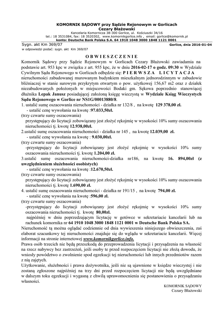 KOMORNIK SĄDOWY przy Sądzie Rejonowym w Gorlicach Cezary Błażowski Kancelaria Komornicza 38-300 Gorlice, ul. Kościuszki 34/16 tel.: 18 3531084, fax: 18 3520302, www.komornikgorlice.info , email: [email protected] konto: Deutsche Bank Polska S.A. 64 1910 1048 3000 1848 1121 0001 Sygn. akt Km 369/07 Gorlice, dnia 2016-01-04 w odpowiedzi podać: sygn. akt Km 369/07 OBWIESZCZENIE Komornik Sądowy przy Sądzie Rejonowym w Gorlicach Cezary Błażowski zawiadamia na podstawie art. 953 kpc w związku z art. 955 kpc, że w dniu 2016-02-17 o godz. 09:30 w Wydziale Cywilnym Sądu Rejonowego w Gorlicach odbędzie się: P I E R W S Z A L I C Y T A C J A nieruchomości zabudowanej murowanym budynkiem mieszkalnym jednorodzinnym w zabudowie bliźniaczej w stanie surowym przykrytym otwartym o pow. użytkowej 156,67 m2 oraz z działek niezabudowanych położonych w miejscowości Bodaki gm. Sękowa poprzednio stanowiącej dłużnika Lepak Janusz posiadającej założoną księgę wieczystą w Wydziale Ksiąg Wieczystych Sądu Rejonowego w Gorlice nr NS1G/00013880/8. 1. ustalić sumę oszacowania nieruchomości - działka nr 132/8 , na kwotę 129 378,00 zł. - ustalić cenę wywołania na kwotę :97.033,50zł. (trzy czwarte sumy oszacowania) przystępujący do licytacji zobowiązany jest złożyć rękojmię w wysokości 10% sumy oszacowania nieruchomości tj. kwotę 12.938,00zł. 2.ustalić sumę oszacowania nieruchomości - działka nr 145 , na kwotę 12.039,00 zł. - ustalić cenę wywołania na kwotę : 9.030,00zł. (trzy czwarte sumy oszacowania) -przystępujący do licytacji zobowiązany jest złożyć rękojmię w wysokości 10% sumy oszacowania nieruchomości tj. kwotę 1.204,00 zł. 3.ustalić sumę oszacowania nieruchomości-działka nr186, na kwotę 16. 894,00zł (z uwzględnieniem służebności osobistych) - ustalić cenę wywołania na kwotę :12.670,50zł. (trzy czwarte sumy oszacowania) przystępujący do licytacji zobowiązany jest złożyć rękojmię w wysokości 10% sumy oszacowania nieruchomości tj. kwotę 1.690,00 zł. 4. ustalić sumę oszacowania nieruchomości - działka nr 191/15 , na kwotę 794,00 zł. - ustalić cenę wywołania na kwotę :596,00 zł. (trzy czwarte sumy oszacowania) -przystępujący do licytacji zobowiązany jest złożyć rękojmię w wysokości 10% sumy oszacowania nieruchomości tj. kwotę 80,00zł. najpóźniej w dniu poprzedzającym licytację w gotówce w sekretariacie kancelarii lub na rachunek komornika nr 64 1910 1048 3000 1848 1121 0001 w Deutsche Bank Polska SA. Nieruchomość tą można oglądać codziennie od dnia wywieszenia niniejszego obwieszczenia, zaś elaborat szacunkowy tej nieruchomości znajduje się do wglądu w sekretariacie kancelarii. Więcej informacji na stronie internetowej www.komornikgorlice.info. Prawa osób trzecich nie będą przeszkodą do przeprowadzenia licytacji i przysądzenia na własność na rzecz nabywcy bez zastrzeżeń, jeśli osoby te przed rozpoczęciem licytacji nie złożą dowodu, że wniosły powództwo o zwolnienie spod egzekucji tej nieruchomości lub innych przedmiotów razem z nią zajętych. Użytkowanie, służebności i prawa dożywotnika, jeśli nie są ujawnione w księdze wieczystej i nie zostaną zgłoszone najpóźniej na trzy dni przed rozpoczęciem licytacji nie będą uwzględniane w dalszym toku egzekucji i wygasną z chwilą uprawomocnienia się postanowienia o przysądzaniu własności. KOMORNIK SĄDOWY Cezary Błażowski