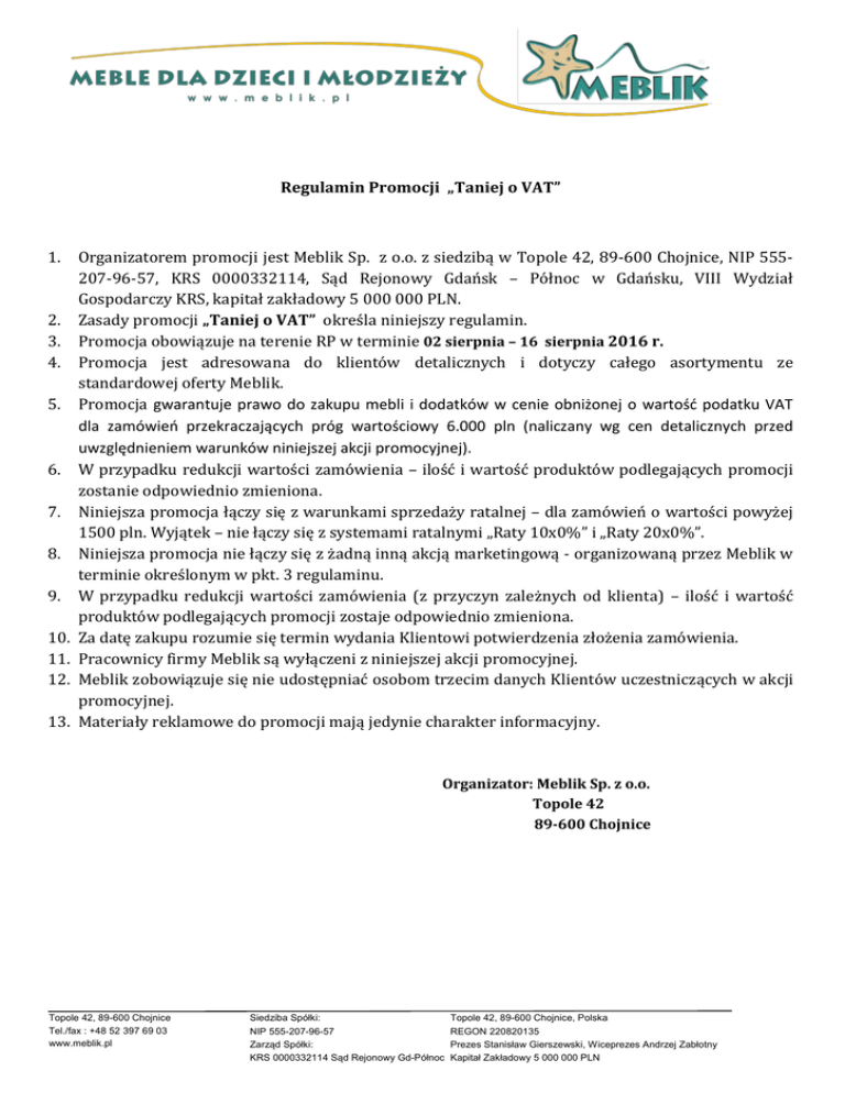 Regulamin Promocji „Taniej o VAT” 1. 2. 3. 4. 5. 6. 7. 8. 9. 10. 11. 12. 13. Organizatorem promocji jest Meblik Sp. z o.o. z siedzibą w Topole 42, 89-600 Chojnice, NIP 555207-96-57, KRS 0000332114, Sąd Rejonowy Gdańsk – Północ w Gdańsku, VIII Wydział Gospodarczy KRS, kapitał zakładowy 5 000 000 PLN. Zasady promocji „Taniej o VAT” określa niniejszy regulamin. Promocja obowiązuje na terenie RP w terminie 02 sierpnia – 16 sierpnia 2016 r. Promocja jest adresowana do klientów detalicznych i dotyczy całego asortymentu ze standardowej oferty Meblik. Promocja gwarantuje prawo do zakupu mebli i dodatków w cenie obniżonej o wartość podatku VAT dla zamówień przekraczających próg wartościowy 6.000 pln (naliczany wg cen detalicznych przed uwzględnieniem warunków niniejszej akcji promocyjnej). W przypadku redukcji wartości zamówienia – ilość i wartość produktów podlegających promocji zostanie odpowiednio zmieniona. Niniejsza promocja łączy się z warunkami sprzedaży ratalnej – dla zamówień o wartości powyżej 1500 pln. Wyjątek – nie łączy się z systemami ratalnymi „Raty 10x0%” i „Raty 20x0%”. Niniejsza promocja nie łączy się z żadną inną akcją marketingową - organizowaną przez Meblik w terminie określonym w pkt. 3 regulaminu. W przypadku redukcji wartości zamówienia (z przyczyn zależnych od klienta) – ilość i wartość produktów podlegających promocji zostaje odpowiednio zmieniona. Za datę zakupu rozumie się termin wydania Klientowi potwierdzenia złożenia zamówienia. Pracownicy firmy Meblik są wyłączeni z niniejszej akcji promocyjnej. Meblik zobowiązuje się nie udostępniać osobom trzecim danych Klientów uczestniczących w akcji promocyjnej. Materiały reklamowe do promocji mają jedynie charakter informacyjny. Organizator: Meblik Sp. z o.o. Topole 42 89-600 Chojnice Topole 42, 89-600 Chojnice Tel./fax : +48 52 397 69 03 www.meblik.pl Siedziba Spółki: NIP 555-207-96-57 Zarząd Spółki: KRS 0000332114 Sąd Rejonowy Gd-Północ Topole 42, 89-600 Chojnice, Polska REGON 220820135 Prezes Stanisław Gierszewski, Wiceprezes Andrzej Zabłotny Kapitał Zakładowy 5 000 000 PLN