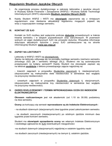 Regulamin Studium Języków Obcych I. Za organizację procesu dydaktycznego w zakresie lektoratów z języków obcych w Wyższej Szkole Finansów i Zarządzania (WSFiZ) i Wyższej Szkole Technologii Informatycznych (WSTI) odpowiada Studium Języków Obcych (SJO) II. Każdy Student WSFiZ i WSTI ma obowiązek zapoznania się z niniejszym regulaminem oraz śledzenia aktualizacji regulaminu mogących pojawić się wraz z rozpoczęciem nowego semestru. III. KONTAKT ZE SJO Kontakt ze SJO możliwy jest wyłącznie podczas dyżurów prowadzonych w trakcie trwania semestru i w sesjach poprawkowych oraz warunkowych. W przerwach wolnych od zajęć dydaktycznych SJO nie prowadzi dyżurów. Wszystkie informacje dotyczące aktualnych dyżurów i pracy SJO zamieszczane są na stronie informacyjnej Studium: www.sjo.vizja.pl. IV. ZAPISY NA LEKTORATY Lektoraty w WSFiZ i WSTI są obowiązkowe. Zapisy na lektoraty odbywają się na początku każdego semestru (zarówno semestru zimowego (SZ) jak i semestru letniego (SL)). Studenci nie są automatycznie przepisywani na kolejny semestr!!! Każdy Student ma obowiązek zapisać się na lektorat osobiście u lektora prowadzącego zajęcia najpóźniej na: - trzecich zajęciach w przypadku Studentów zaocznych tj. niestacjonarnych, (dopuszczalne są maksymalne dwie nieobecności w semestrze bez względu na przyczynę nieobecności) - czwartych zajęciach w przypadku Studentów dziennych tj. stacjonarnych, (dopuszczalne są maksymalnie trzy nieobecności w semestrze bez względu na przyczynę nieobecności). V. OKRES ROZLICZENIOWY I TERMIN WPROWADZANIA OCEN DO INDEKSÓW ELEKTRONICZNYCH Okresem rozliczeniowym jest rok akademicki (od 1.10 do 30.09) podzielony na dwa semestry. Oceny za kończący się semestr wprowadzane są do Indeksów Elektronicznych : - na studiach dziennych (stacjonarnych) dwa tygodnie przed zakończeniem semestru - na studiach zaocznych (niestacjonarnych) po siódmym zjeździe minimum dwa tygodnie przed końcem semestru. Student ma obowiązek sprawdzenia oceny we własnym Indeksie Elektronicznym i osobistego zgłoszenia do SJO ewentualnych niezgodności: -na studiach dziennych (stacjonarnych) najpóźniej w ostatnim tygodniu nauki -na studiach zaocznych (niestacjonarnych) na ósmym tj. ostatnim zjeździe. 1 Dnia 30 stycznia dla semestru zimowego i 30 czerwca dla semestru letniego następuje blokada ocen z terminu podstawowego w Indeksie Elektronicznym. Po upływie tych terminów zmiana ocen w trybie podstawowym nie jest możliwa. Korekta może nastąpić dopiero w trybie poprawkowym lub warunkowym po osobistym zgłoszeniu przez Studenta niezgodności podczas dyżurów w sesji poprawkowej lub warunkowej. Nie ma możliwości zgłaszania i korygowania niezgodności drogą elektroniczną. VI. WARUNKI ZALICZENIA ROKU AKADEMICKIEGO Warunkiem zaliczenia roku akademickiego jest zaliczenie w jednym cyklu rozliczeniowym (od 01.10 do 30.09) dwóch semestrów (tj. semestru zimowego (SZ) i semestru letniego (SL)) z języka angielskiego ogólnego i/lub specjalistycznego. Zaliczenia lektoratów odbywają się wyłącznie w formie pisemnej. Zaliczenie semestru zimowego (SZ) w terminie podstawowym należy uzyskać do dnia 30 stycznia danego roku akademickiego. Zaliczenie semestru letniego (SL) w terminie podstawowym należy uzyskać do dnia 30 czerwca danego roku akademickiego. Wszelkie zaliczenia uzyskane po w/w terminach odbywają się w odpowiednich sesjach poprawkowych i/lub warunkowych w formie testu pisemnego. (Wyjątek stanowi tu letnia sesja Cambridge ESOL przewidziana wyłącznie dla Studentów kończących lektorat z języka angielskiego, której wyniki Student otrzymuje na początku lipca.) Warunkiem zaliczenia semestru jest spełnienie niżej wymienionych wymagań: 1. Student zobowiązany jest osobiście zapisać się na lektoraty nie później niż na czwartych zajęciach w semestrze na studiach dziennych lub na trzecim zjeździe na studiach zaocznych. Osoby, które nie zapiszą się na zajęcia w danym semestrze nie mogą uzyskać zaliczenia tego semestru w terminie podstawowym, otrzymują ocenę niedostateczną i będą zaliczać semestr w sesji poprawkowej i/lub warunkowej w formie testu pisemnego na poziomie B1/B2. 2. Obecność na lektoratach jest obowiązkowa i oznacza aktywne uczestnictwo w zajęciach oraz posiadanie materiałów do pracy (podręcznik, rozdane fotokopie, odrobiona praca domowa, itp.). Dopuszczalna liczba nieobecności wynosi: - 3 dla Studentów dziennych - 2 dla Studentów zaocznych. Przekroczenie w/w liczby nieobecności (bez względu na przyczynę) jest równoznaczne z niezaliczeniem semestru w terminie podstawowym (ocena niedostateczna). Zaliczenie możliwe jest w trybie poprawkowym lub/i warunkowym. 3. Zaliczenie w pierwszym terminie otrzymują wyłącznie Studenci, którzy nie przekroczyli w/w liczby nieobecności i uzyskali minimalną średnią ocen 2,83 ze wszystkich pisemnych testów cząstkowych przeprowadzonych w danym semestrze. Minimalna liczba testów na studiach dziennych to trzy, a na studiach zaocznych dwa. 2 W przypadku Studentów dziennych konieczne jest uzyskanie ocen pozytywnych z większości przeprowadzonych testów pisemnych (np. dwóch z trzech, trzech z pięciu). Terminy testów są ustalane na pierwszych zajęciach. Student uzyskuje pozytywną ocenę z testu cząstkowego po uzyskaniu co najmniej 60% poprawnych odpowiedzi. Obecność na testach jest obowiązkowa. Student nieobecny na teście cząstkowym otrzymuje ocenę niedostateczną. 4. Ocena końcowa z danego semestru jest średnią arytmetyczną ocen z pisemnych testów cząstkowych przeprowadzonych w danym semestrze: 2,00 - 2,82 2,83 - 3,32 3,33 - 3,82 3,83 - 4,32 4,33 - 4,82 4,83 - 5,32 2,0 3,0 3,5 4,0 4,5 5,0 Skala ocen/punktów z pisemnych testów cząstkowych: 100% 95% - 99% 88% - 94% 81% - 87% 74% - 80% 67% - 73% 60% - 66% 50% - 59% 35% - 49% 20% - 34% 0% - 19 % 6,0 5,5 5,0 4,5 4,0 3,5 3,0 2,5 2,0 1,5 1,0 Testy cząstkowe udostępniane są