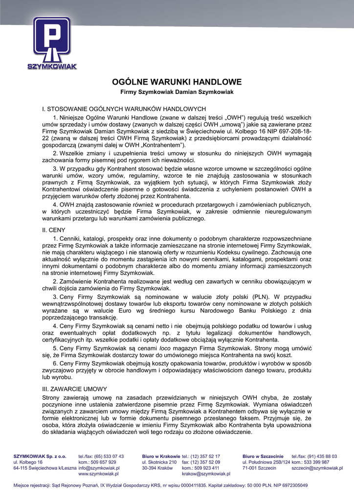 OGÓLNE WARUNKI HANDLOWE Firmy Szymkowiak Damian Szymkowiak I. STOSOWANIE OGÓLNYCH WARUNKÓW HANDLOWYCH 1. Niniejsze Ogólne Warunki Handlowe (zwane w dalszej treści „OWH”) regulują treść wszelkich umów sprzedaży i umów dostawy (zwanych w dalszej części OWH „umową”) jakie są zawierane przez Firmę Szymkowiak Damian Szymkowiak z siedzibą w Święciechowie ul. Kolbego 16 NIP 697-208-1822 (zwaną w dalszej treści OWH Firmą Szymkowiak) z przedsiębiorcami prowadzącymi działalność gospodarczą (zwanymi dalej w OWH „Kontrahentem”). 2. Wszelkie zmiany i uzupełnienia treści umowy w stosunku do niniejszych OWH wymagają zachowania formy pisemnej pod rygorem ich nieważności. 3. W przypadku gdy Kontrahent stosować będzie własne wzorce umowne w szczególności ogólne warunki umów, wzory umów, regulaminy, wzorce te nie znajdują zastosowania w stosunkach prawnych z Firmą Szymkowiak, za wyjątkiem tych sytuacji, w których Firma Szymkowiak złoży Kontrahentowi oświadczenie pisemne o gotowości świadczenia z uchyleniem postanowień OWH a przyjęciem warunków oferty złożonej przez Kontrahenta. 4. OWH znajdą zastosowanie również w procedurach przetargowych i zamówieniach publicznych, w których uczestniczyć będzie Firma Szymkowiak, w zakresie odmiennie nieuregulowanym warunkami przetargu lub warunkami zamówienia publicznego. II. CENY 1. Cenniki, katalogi, prospekty oraz inne dokumenty o podobnym charakterze rozpowszechniane przez Firmę Szymkowiak a także informacje zamieszczane na stronie internetowej Firmy Szymkowiak, nie mają charakteru wiążącego i nie stanowią oferty w rozumieniu Kodeksu cywilnego. Zachowują one aktualność wyłącznie do momentu zastąpienia ich nowymi cennikami, katalogami, prospektami oraz innymi dokumentami o podobnym charakterze albo do momentu zmiany informacji zamieszczonych na stronie internetowej Firmy Szymkowiak. 2. Zamówienie Kontrahenta realizowane jest według cen zawartych w cenniku obowiązującym w chwili dojścia zamówienia do Firmy Szymkowiak. 3. Ceny Firmy Szymkowiak są nominowane w walucie złoty polski (PLN). W przypadku wewnątrzwspólnotowej dostawy towarów lub eksportu towarów ceny nominowane w złotych polskich wyrażane są w walucie Euro wg średniego kursu Narodowego Banku Polskiego z dnia poprzedzającego transakcję. 4. Ceny Firmy Szymkowiak są cenami netto i nie obejmują polskiego podatku od towarów i usług oraz ewentualnych opłat dodatkowych np. z tytułu legalizacji dokumentów handlowych, certyfikacyjnych itp. wszelkie podatki i opłaty dodatkowe obciążają wyłącznie Kontrahenta. 5. Ceny Firmy Szymkowiak są cenami loco magazyn Firma Szymkowiak. Strony mogą umówić się, że Firma Szymkowiak dostarczy towar do umówionego miejsca Kontrahenta na swój koszt. 6. Ceny Firmy Szymkowiak obejmują koszty opakowania towarów, produktów i wyrobów w sposób zwyczajowo przyjęty w obrocie handlowym i odpowiadający właściwościom danego towaru, produktu lub wyrobu. III. ZAWARCIE UMOWY Strony zawierają umowę na zasadach przewidzianych w niniejszych OWH chyba, że zostały poczynione inne ustalenia zatwierdzone pisemnie przez Firmę Szymkowiak. Wymiana oświadczeń związanych z zawarciem umowy między Firmą Szymkowiak a Kontrahentem odbywa się wyłącznie w formie elektronicznej lub w formie dokumentu pisemnego przesłanego faksem. Przyjmuje się, że osoba, która złożyła oświadczenie w imieniu Firmy Szymkowiak albo Kontrahenta była upoważniona do składania wiążących oświadczeń woli tego rodzaju co złożone oświadczenie. Umowa zawierana jest na podstawie złożonego przez Kontrahenta zamówienia (oferty). Zamówienie jest składane poprzez oświadczenie wysłane drogą elektroniczną na podany na stronie internetowej Firmy Szymkowiak adres poczty elektronicznej działu sprzedaży lub poprzez pisemne zamówienie wysłane na numer faksu Firmy Szymkowiak lub przez formularz zamówienia w sklepie internetowym prowadzonym pod adresem: http://sklep.szymkowiak.pl. Złożenie zamówienia przez Kontrahenta jest jednoznaczne z zapoznaniem się i akceptacją OWH Firma Szymkowiak. Kontrahent jest związany złożonym zamówieniem przez okres 7 dni od dnia doręczenia zamówienia Firmie Szymkowiak. Firma Szymkowiak potwierdzi przyjęcie zamówienia w terminie do 7 dni od dnia otrzymania zamówienia od Kontrahenta albo poinformuje Kontrahenta o braku możliwości przyjęcia zamówienia wskazując jego przyczyny. Brak oświadczenia Firmy Szymkowiak w powyższym terminie oznacza brak przyjęcia zamówienia i niezawarcie umowy. Warunkiem realizacji zamówienia jest nie zaleganie przez Kontrahenta z płatnościami na rzecz Firmy Szymkowiak. W przypadku rezygnacji przez Kontrahenta z realizacji zamówienia jest on zobowiązany do pokrycia kosztów poniesionych przez Firmę Szymkowiak związanych z uruchomieniem realizacji zamówienia (zakup materiału, uruchomienie produkcji, zamówienie towarów od zewnętrznych dostawców itp.) Umowa zostaje zawarta z chwilą doręczenia Kontrahentowi potwierdzenia zamówienia przez Firmę Szymkowiak (przyjęcie oferty). Firma Szymkowiak składając oświadczenie o braku możliwości przyjęcia zamówienia może złożyć Kontrahentowi zmodyfikowane warunki realizacji zamówienia (kontroferta). Firma Szymkowiak jest związany kontrofertą przez okres trzech dni od dnia jej doręczenia Kontrahentowi. W takim przypadku do zawarcia umowy dochodzi poprzez potwierdzenie przyjęcia kontroferty przez Kontrahenta. Brak potwierdzenia przyjęcia kontroferty w terminie trzech dni od dnia jej otrzymania oznacza brak przyjęcia kontroferty i niezawarcie umowy. IV. TERMINY DOSTAW 1. Terminem dostawy, wiążącym obie strony jest termin wskazany przez Firmę Szymkowiak w potwierdzeniu zamówienia. Termin dostawy uznaje się za dotrzymany gdy towar (wyrób) opuścił magazyn Firmy Szymkowiak najpóźniej w dniu określonym jako termin w potwierdzeniu zamówien