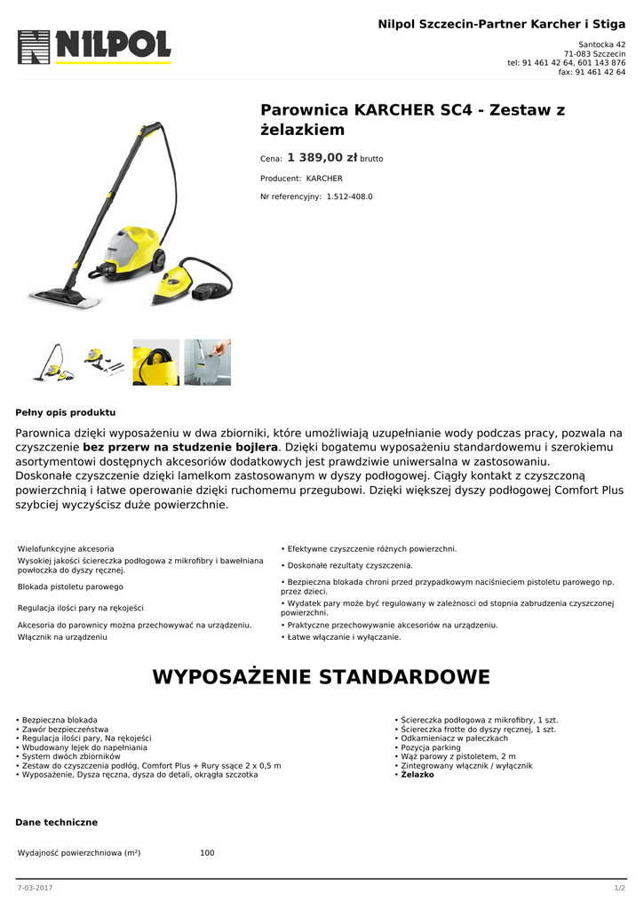 Nilpol Szczecin-Partner Karcher i Stiga Santocka 42 71-083 Szczecin tel: 91 461 42 64, 601 143 876 fax: 91 461 42 64 Parownica KARCHER SC4 - Zestaw z żelazkiem Cena: 1 389,00 zł brutto Producent: KARCHER Nr referencyjny: 1.512-408.0 Pełny opis produktu Parownica dzięki wyposażeniu w dwa zbiorniki, które umożliwiają uzupełnianie wody podczas pracy, pozwala na czyszczenie bez przerw na studzenie bojlera. Dzięki bogatemu wyposażeniu standardowemu i szerokiemu asortymentowi dostępnych akcesoriów dodatkowych jest prawdziwie uniwersalna w zastosowaniu. Doskonałe czyszczenie dzięki lamelkom zastosowanym w dyszy podłogowej. Ciągły kontakt z czyszczoną powierzchnią i łatwe operowanie dzięki ruchomemu przegubowi. Dzięki większej dyszy podłogowej Comfort Plus szybciej wyczyścisz duże powierzchnie. Wielofunkcyjne akcesoria • Efektywne czyszczenie różnych powierzchni. Wysokiej jakości ściereczka podłogowa z mikrofibry i bawełniana powłoczka do dyszy ręcznej. • Doskonałe rezultaty czyszczenia. Blokada pistoletu parowego • Bezpieczna blokada chroni przed przypadkowym naciśnieciem pistoletu parowego np. przez dzieci. Regulacja ilości pary na rękojeści • Wydatek pary może być regulowany w zależnosci od stopnia zabrudzenia czyszczonej powierzchni. Akcesoria do parownicy można przechowywać na urządzeniu. • Praktyczne przechowywanie akcesoriów na urządzeniu. Włącznik na urządzeniu • Łatwe włączanie i wyłączanie. WYPOSAŻENIE STANDARDOWE • • • • • • • Bezpieczna blokada Zawór bezpieczeństwa Regulacja ilości pary, Na rękojeści Wbudowany lejek do napełniania System dwóch zbiorników Zestaw do czyszczenia podłóg, Comfort Plus + Rury ssące 2 x 0,5 m Wyposażenie, Dysza ręczna, dysza do detali, okrągła szczotka • • • • • • • Ściereczka podłogowa z mikrofibry, 1 szt. Ściereczka frotte do dyszy ręcznej, 1 szt. Odkamieniacz w pałeczkach Pozycja parking Wąż parowy z pistoletem, 2 m Zintegrowany włącznik / wyłącznik Żelazko Dane techniczne Wydajność powierzchniowa (m²) 7-03-2017 100 1/2 Moc grzałki (W) 2000 Maks. ciśnienie pary (bar) 3,5 Czas podgrzewania (min.) 4 Pojemność kotła / zbiornika wyrównawczego (l) 0,5 / 0,8 Napięcie (V) 220 - 240 Częstotliwość (Hz) 50 - 60 Ciężar bez wyposażenia (kg) 4,1 Wymiary (dł. x szer. x wys.) (mm) 380 x 251 x 273 7-03-2017 2/2