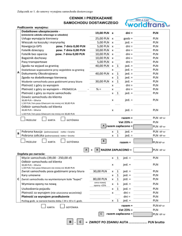 Załącznik nr 1. do umowy wynajmu samochodu dostawczego CENNIK I PRZEKAZANIE SAMOCHODU DOSTAWCZEGO Podliczenie wynajmu: Dodatkowe ubezpieczenie - 19,00 PLN x (zniesienie udziału własnego w szkodzie) Usługa wynajęcia kierowcy Wieszak na koszulę i marynarkę Nawigacja GPS pow. 7 dnia 0,00 PLN Fotelik dziecięcy pow. 7 dnia 0,00 PLN Fotelik bez oparcia pow. 7 dnia 0,00 PLN Bagażnik dachowy Pasy transportowe Zgoda na wyjazd za granicę dni = PLN godz = jed. = dni = dni = dni = dni = dni = jed. = jed. = jed. = jed. = jed. = dni = dni = jed. = PLN PLN PLN PLN PLN PLN PLN PLN PLN PLN PLN PLN PLN PLN PLN x jed. = PLN x jed. = PLN 25,00 PLN 5,00 PLN 5,00 PLN 10,00 PLN 10,00 PLN 10,00 PLN 5,00 PLN 40,00 PLN x x x x x x x x x 40,00 PLN x x 30,00 PLN x x %= x x Dodatkowe wyposażenie przy wyjeździe za granicę A Dokumenty Obcokrajowca Zgoda na dodatkowego kierowcę Wydanie samochodu poza godzinami pracy biura Płatność z góry za wynajem Płatność z góry za wynajem – PROMOCJA Płatność z góry za mycie samochodu Dowóz samochodu do klienta - 30,00 PLN – Gliwice 1,50 PLN / km poza Gliwicami nie mniej niż 30,00 PLN 1 1 1 1 1 Odbiór samochodu od klienta 30,00 PLN – Gliwice 1,50 PLN / km poza Gliwicami nie mniej niż 30,00 PLN PRZELEW B KARTA Pobrana kaucja (jednorazowo) Pobrana zaliczka (jednorazowo) PRZELEW KARTA razem = Vat 23% = A razem zapłacono = GOTÓWKA x x netto = brutto netto = brutto B GOTÓWKA A + B 1 1 [B PLN KP nr PLN KP nr razem = PLN KP nr RAZEM ZAPŁACONO = PLN KP nr Dopłata po zwrocie: Mycie samochodu (39,00 - 250,00 zł) Odbiór samochodu od klienta x 1 x 30,00 PLN – Gliwice 1,50 PLN / km poza Gliwicami nie mniej niż 30,00 PLN Zwrot samochodu poza godzinami pracy biura Kary umowne jed. = jed. = PLN KP nr PLN PLN KP nr PLN jed. = PLN 80,00 PLN x x x 1 1 1 jed. = jed. = jed. = PLN PLN PLN cena nowej opony +25% x 1 jed. = PLN Uszkodzenia pojazdu Płatność za wynajem (nie uiszczona wcześniej) Płatność za wynajem przedłużenie x x 1 Poślizg godz. w zwrocie kwota doby / 24 x 10 x il. godz. x 1 jed. = dni = dni = jed. = PLN PLN PLN PLN C Zwrot samochodu na wymienionym kole "kapeć" Wymiana opony na nową KARTA 30,00 PLN jed. = GOTÓWKA C B - C razem = Vat 23% = razem zapłacono = PLN KP nr PLN PLN KP nr = ZWROT PO ZDANIU AUTA ………………… PLN brutto ODBIÓR PRZEKAZANIE LEGENDA R – rysa O – odprysk W – wgniecenie B – Brak P - Pęknięcie UWAGI…………………………………… ……………………………………………. Stan paliwa - …………………………... Rodzaj paliwa - ………………………… Opony - ……………………szt………… Czysty / brudny UWAGI…………………………………… ……………………………………………. Stan paliwa - …………………………... Rodzaj paliwa - ………………………… Opony - ……………………szt………… Czysty / brudny Wynajmujący…………………………...... Wynajmujący…………………………...... Najemca………………………………….. Najemca …….………………………….. Data:………………………..godz……..... Data:………………………..godz……..... Potwierdzam zdanie samochodu oraz rozliczenie kaucji oraz wszystkich płatności za wynajem samochodu. ……………………… ……………………………………….…… Data, czytelny podpis