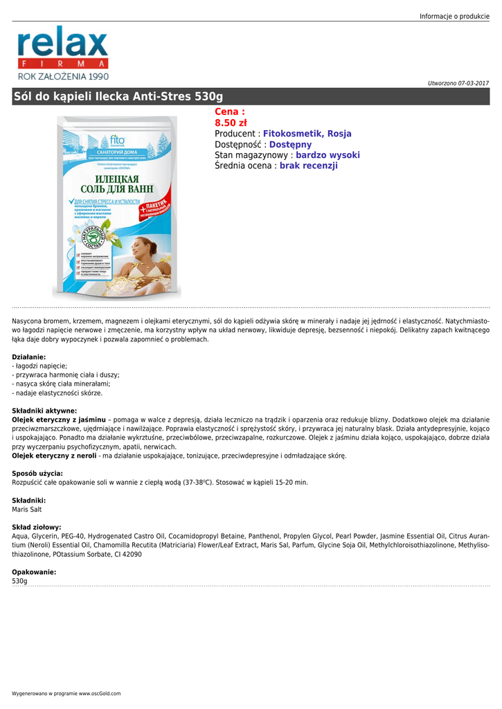 Informacje o produkcie Utworzono 07-03-2017 Sól do kąpieli Ilecka Anti-Stres 530g Cena : 8.50 zł Producent : Fitokosmetik, Rosja Dostępność : Dostępny Stan magazynowy : bardzo wysoki Średnia ocena : brak recenzji Nasycona bromem, krzemem, magnezem i olejkami eterycznymi, sól do kąpieli odżywia skórę w minerały i nadaje jej jędrność i elastyczność. Natychmiastowo łagodzi napięcie nerwowe i zmęczenie, ma korzystny wpływ na układ nerwowy, likwiduje depresję, bezsenność i niepokój. Delikatny zapach kwitnącego łąka daje dobry wypoczynek i pozwala zapomnieć o problemach. Działanie: - łagodzi napięcie; - przywraca harmonię ciała i duszy; - nasyca skórę ciała minerałami; - nadaje elastyczności skórze. Składniki aktywne: Olejek eteryczny z jaśminu – pomaga w walce z depresją, działa leczniczo na trądzik i oparzenia oraz redukuje blizny. Dodatkowo olejek ma działanie przeciwzmarszczkowe, ujędrniające i nawilżające. Poprawia elastyczność i sprężystość skóry, i przywraca jej naturalny blask. Działa antydepresyjnie, kojąco i uspokajająco. Ponadto ma działanie wykrztuśne, przeciwbólowe, przeciwzapalne, rozkurczowe. Olejek z jaśminu działa kojąco, uspokajająco, dobrze działa przy wyczerpaniu psychofizycznym, apatii, nerwicach. Olejek eteryczny z neroli - ma działanie uspokajające, tonizujące, przeciwdepresyjne i odmładzające skórę. Sposób użycia: Rozpuścić całe opakowanie soli w wannie z ciepłą wodą (37-38⁰C). Stosować w kąpieli 15-20 min. Składniki: Maris Salt Skład ziołowy: Aqua, Glycerin, PEG-40, Hydrogenated Castro Oil, Cocamidopropyl Betaine, Panthenol, Propylen Glycol, Pearl Powder, Jasmine Essential Oil, Citrus Aurantium (Neroli) Essential Oil, Chamomilla Recutita (Matriciaria) Flower/Leaf Extract, Maris Sal, Parfum, Glycine Soja Oil, Methylchloroisothiazolinone, Methylisothiazolinone, POtassium Sorbate, CI 42090 Opakowanie: 530g Wygenerowano w programie www.oscGold.com