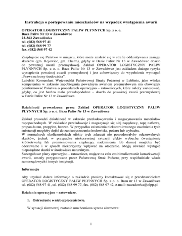 Instrukcja o postępowaniu mieszkańców na wypadek wystąpienia awarii OPERATOR LOGISTYCZNY PALIW PŁYNNYCH Sp. z o. o. Baza Paliw Nr 13 w Zawadówce 22-363 Zawadówka tel. (082) 568 97 41 tel. (082) 568 99 77 fax. (082) 568 97 42 Znajdujecie się Państwo w miejscu, które moŜe znaleźć się w strefie oddziaływania zasięgu skutków (gm. Rejowiec, gm. Chełm), gdyby w Bazie Paliw Nr 13 w Zawadówce doszło do powaŜnej awarii przemysłowej. Zakład OPERATOR LOGISTYCZNY PALIW PŁYNNYCH Sp. z o. o. Baza Paliw Nr 13 w Zawadówce jest zakładem duŜego ryzyka wystąpienia powaŜnej awarii przemysłowej i jest zobowiązany do wypełnienia wymagań „Prawa ochrony środowiska”. Lubelski Komendant Wojewódzki Państwowej StraŜy PoŜarnej w Lublinie, jako władza kompetentna w zakresie zapobiegania powaŜnym awariom przemysłowym ma obowiązek poinformować Państwa o procedurach operacyjno – ratowniczych, które naleŜy zastosować, gdyby, co jest bardzo mało prawdopodobne – doszło do powaŜnej awarii przemysłowej w Bazie Paliw Nr 13 w Zawadówce. Działalność prowadzona przez Zakład OPERATOR LOGISTYCZNY PALIW PŁYNNYCH Sp. z o. o. Baza Paliw Nr 13 w Zawadówce Zakład prowadzi działalność w zakresie przeładowywania i magazynowania materiałów ropopochodnych. W zakładzie przeładowuje i magazynuje się olej napędowy, ropę naftową, propan-butan, propylen, benzen. W przypadku zaistnienia niekontrolowanego uwolnienia tych substancji mogłoby dojść do zanieczyszczenia środowiska, poŜaru lub wybuchu. W normalnych okolicznościach efekty tych zdarzeń nie powodowałyby odczuwalnych skutków, jednak w przypadku niekorzystnej sytuacji efekty wybuchu (wystąpienie krótkotrwałej fali promieniowania cieplnego, nadciśnienia lub dymu) mogłoby być odczuwalne i w sposób niekorzystny wpływać na otoczenie. Mogą równieŜ wystąpić niepoŜądane skutki w środowisku naturalnym. Szczegółowe plany operacyjno – ratownicze, mające na celu zminimalizowanie konsekwencji awarii, zostały przygotowane przez Państwową StraŜ PoŜarną przy współudziale władz samorządowych i innych instytucji. Informacje Aby uzyskać dalsze informacje o zakładzie prosimy kontaktować się z przedstawicielem OPERATOR LOGISTYCZNY PALIW PŁYNNYCH Sp. z o. o. Baza nr 13 w Zawadówce tel. (082) 568 97 41, tel. (082) 568 99 77, fax. (082) 568 97 42, e-mail: [email protected] Działania operacyjno – ratownicze. 1. OstrzeŜenie o niebezpieczeństwie. W sytuacji alarmowej zostanie uruchomiona syrena alarmowa: 1 SYGNAŁ TRWAJĄCY 3 MINUTY Z 10 SEKUNDOWYMI DŹWIĘKAMI PRZERYWANYMI, przerwy między poszczególnymi dźwiękami będą wynosiły od 25 do 30 sekund. Prosimy sprawdzić, jeŜeli będzie to moŜliwe, czy sąsiedzi usłyszeli sygnał syreny. 2. Udaj się do bezpiecznego miejsca. Schroń się w pomieszczeniu zamkniętym, najlepiej budynku murowanym. MoŜesz rozwaŜyć, czy nie zaprosić sąsiadów lub przechodniów. Nie próbuj odbierać dzieci ze szkoły, przedszkola, Ŝłobka i placówek edukacyjnych. Dzieci zostaną zabezpieczone przez kierownictwo placówek i słuŜby ratownicze. Zasłoń okna, na oknie przyklej białą kartkę papieru. Ten znak będzie sygnalizował słuŜbom ratowniczym, Ŝe jest ktoś w domu. Nie wyjeŜdŜaj pojazdami poza miejsce zamieszkania – pojazdy silnikowe mogą zablokować drogę słuŜbom ratowniczym i porządkowym, ponadto mogą ulec uszkodzeniu w przypadku wjechania w strefę oddziaływania niebezpiecznych substancji. 3. Zabezpiecz swoje mienie. Zamknij szczelnie okna i drzwi. Wyłącz wentylatory i urządzenia gazowe. Zachowaj spokój i odpręŜ się. 4. Dalsze informacje. Czekaj na dalsze instrukcje od właściwych słuŜb: Państwowej StraŜy PoŜarnej, Policji, formacji Obrony Cywilnej, władz samorządowych. Słuchaj: Radio ZET (MHz – 107,0 ), Radio RMF FM (MHz – 89,3; 107,7), Radio PULS Lublin (MHz – 95,6), inne lokalne. Informacje o rozwoju sytuacji podawane będą, co 15 minut. Staraj się nie uŜywać telefonu stacjonarnego i komórkowego. W ten sposób linie telefoniczne nie będą zablokowane i ułatwią alarmowanie słuŜb ratowniczych oraz prowadzenie akacji ratowniczej. Wykonuj polecenia funkcjonariuszy Policji, Państwowej StraŜy PoŜarnej. Przy zachowaniu tych warunków będziesz bezpieczny. 5. Odwołanie alarmu. Na znak, Ŝe sytuacja alarmowa została odwołania, ponownie zostanie uruchomiona syrena alarmowa: PRZERYWANY SYGNAŁ PRZEZ PIĘTNAŚCIE MIUNUT. Po odwołaniu alarmu moŜesz wrócić do własnych zajęć. Nie naleŜy podejmować Ŝadnych działań. Nie wyjeŜdŜaj poza teren posesji. Gdy sygnał usłyszysz poza miejscem zamieszkania udaj się do najbliŜszego sklepu, szkoły, budynku uŜyteczności publicznej (urzędu). Zachowaj tą informację na przyszłość. 2 Wykaz telefonów alarmowych oraz adresów i telefonów wojewódzkich, powiatowych i gminnych organów i słuŜb odpowiedzialnych za podjęcie działań operacyjnoratowniczych 1. Telefony alarmowe. Państwowa StraŜ PoŜarna - 998 Policja - 997 Pogotowie Ratunkowe - 999 Numer alarmowy z telefonu komórkowego - 112 2. Adresy i telefony. Komenda Wojewódzka Państwowej StraŜy PoŜarnej w Lublinie ul. StraŜacka 7 20-012 Lublin tel. (081) 532 64 26 tel. (081) 534 80 50 tel. (081) 535 12 55 faks. (081) 532 67 14 Komenda Miejska Państwowej StraŜy PoŜarnej w Chełmie ul. S. Wyszyńskiego 2 b 22-100 Chełm tel. (082) 560 48 50 tel. (082) 560 48 61 tel. (082) 560 48 74 faks. (082) 565 06 11 3