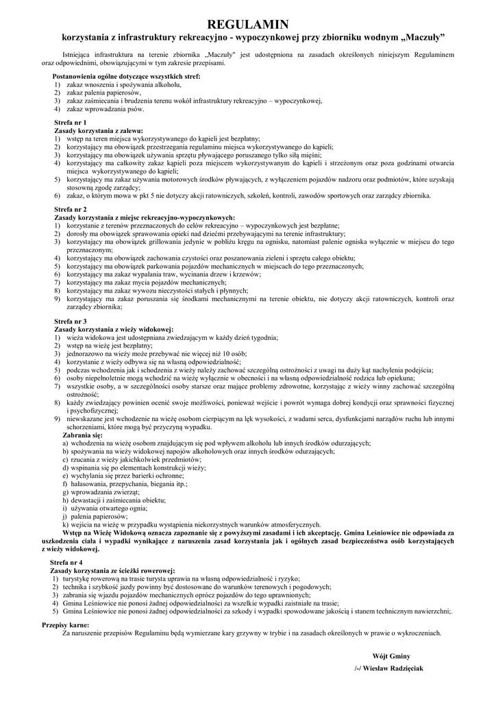 REGULAMIN korzystania z infrastruktury rekreacyjno - wypoczynkowej przy zbiorniku wodnym „Maczuły” Istniejąca infrastruktura na terenie zbiornika „Maczuły" jest udostępniona na zasadach określonych niniejszym Regulaminem oraz odpowiednimi, obowiązującymi w tym zakresie przepisami. Postanowienia ogólne dotyczące wszystkich stref: 1) zakaz wnoszenia i spożywania alkoholu, 2) zakaz palenia papierosów, 3) zakaz zaśmiecania i brudzenia terenu wokół infrastruktury rekreacyjno – wypoczynkowej, 4) zakaz wprowadzania psów. Strefa nr 1 Zasady korzystania z zalewu: 1) wstęp na teren miejsca wykorzystywanego do kąpieli jest bezpłatny; 2) korzystający ma obowiązek przestrzegania regulaminu miejsca wykorzystywanego do kąpieli; 3) korzystający ma obowiązek używania sprzętu pływającego poruszanego tylko siłą mięśni; 4) korzystający ma całkowity zakaz kąpieli poza miejscem wykorzystywanym do kąpieli i strzeżonym oraz poza godzinami otwarcia miejsca wykorzystywanego do kąpieli; 5) korzystający ma zakaz używania motorowych środków pływających, z wyłączeniem pojazdów nadzoru oraz podmiotów, które uzyskają stosowną zgodę zarządcy; 6) zakaz, o którym mowa w pkt 5 nie dotyczy akcji ratowniczych, szkoleń, kontroli, zawodów sportowych oraz zarządcy zbiornika. Strefa nr 2 Zasady korzystania z miejsc rekreacyjno-wypoczynkowych: 1) korzystanie z terenów przeznaczonych do celów rekreacyjno – wypoczynkowych jest bezpłatne; 2) dorosły ma obowiązek sprawowania opieki nad dziećmi przebywającymi na terenie infrastruktury; 3) korzystający ma obowiązek grillowania jedynie w pobliżu kręgu na ognisku, natomiast palenie ogniska wyłącznie w miejscu do tego przeznaczonym; 4) korzystający ma obowiązek zachowania czystości oraz poszanowania zieleni i sprzętu całego obiektu; 5) korzystający ma obowiązek parkowania pojazdów mechanicznych w miejscach do tego przeznaczonych; 6) korzystający ma zakaz wypalania traw, wycinania drzew i krzewów; 7) korzystający ma zakaz mycia pojazdów mechanicznych; 8) korzystający ma zakaz wywozu nieczystości stałych i płynnych; 9) korzystający ma zakaz poruszania się środkami mechanicznymi na terenie obiektu, nie dotyczy akcji ratowniczych, kontroli oraz zarządcy zbiornika; Strefa nr 3 Zasady korzystania z wieży widokowej: 1) wieża widokowa jest udostępniana zwiedzającym w każdy dzień tygodnia; 2) wstęp na wieżę jest bezpłatny; 3) jednorazowo na wieży może przebywać nie więcej niż 10 osób; 4) korzystanie z wieży odbywa się na własną odpowiedzialność; 5) podczas wchodzenia jak i schodzenia z wieży należy zachować szczególną ostrożności z uwagi na duży kąt nachylenia podejścia; 6) osoby niepełnoletnie mogą wchodzić na wieżę wyłącznie w obecności i na własną odpowiedzialność rodzica lub opiekuna; 7) wszystkie osoby, a w szczególności osoby starsze oraz mające problemy zdrowotne, korzystając z wieży winny zachować szczególną ostrożność; 8) każdy zwiedzający powinien ocenić swoje możliwości, ponieważ wejście i powrót wymaga dobrej kondycji oraz sprawności fizycznej i psychofizycznej; 9) niewskazane jest wchodzenie na wieżę osobom cierpiącym na lęk wysokości, z wadami serca, dysfunkcjami narządów ruchu lub innymi schorzeniami, które mogą być przyczyną wypadku. Zabrania się: a) wchodzenia na wieżę osobom znajdującym się pod wpływem alkoholu lub innych środków odurzających; b) spożywania na wieży widokowej napojów alkoholowych oraz innych środków odurzających; c) rzucania z wieży jakichkolwiek przedmiotów; d) wspinania się po elementach konstrukcji wieży; e) wychylania się przez barierki ochronne; f) hałasowania, przepychania, biegania itp.; g) wprowadzania zwierząt; h) dewastacji i zaśmiecania obiektu; i) używania otwartego ognia; j) palenia papierosów; k) wejścia na wieżę w przypadku wystąpienia niekorzystnych warunków atmosferycznych. Wstęp na Wieżę Widokową oznacza zapoznanie się z powyższymi zasadami i ich akceptację. Gmina Leśniowice nie odpowiada za uszkodzenia ciała i wypadki wynikające z naruszenia zasad korzystania jak i ogólnych zasad bezpieczeństwa osób korzystających z wieży widokowej. Strefa nr 4 Zasady korzystania ze ścieżki rowerowej: 1) turystykę rowerową na trasie turysta uprawia na własną odpowiedzialność i ryzyko; 2) technika i szybkość jazdy powinny być dostosowane do warunków terenowych i pogodowych; 3) zabrania się wjazdu pojazdów mechanicznych oprócz pojazdów do tego uprawnionych; 4) Gmina Leśniowice nie ponosi żadnej odpowiedzialności za wszelkie wypadki zaistniałe na trasie; 5) Gmina Leśniowice nie ponosi żadnej odpowiedzialności za szkody i wypadki spowodowane jakością i stanem technicznym nawierzchni;. Przepisy karne: Za naruszenie przepisów Regulaminu będą wymierzane kary grzywny w trybie i na zasadach określonych w prawie o wykroczeniach. Wójt Gminy /-/ Wiesław Radzięciak