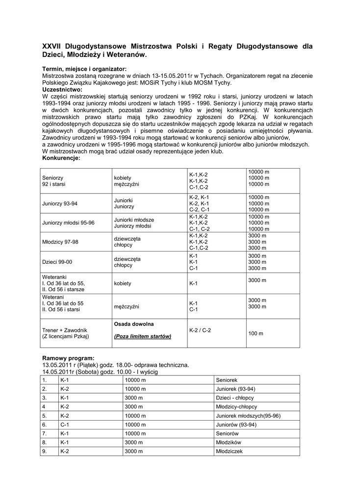 XXVII Długodystansowe Mistrzostwa Polski i Regaty Długodystansowe dla Dzieci, Młodzieży i Weteranów. Termin, miejsce i organizator: Mistrzostwa zostaną rozegrane w dniach 13-15.05.2011r w Tychach. Organizatorem regat na zlecenie Polskiego Związku Kajakowego jest: MOSiR Tychy i klub MOSM Tychy. Uczestnictwo: W części mistrzowskiej startują seniorzy urodzeni w 1992 roku i starsi, juniorzy urodzeni w latach 1993-1994 oraz juniorzy młodsi urodzeni w latach 1995 - 1996. Seniorzy i juniorzy mają prawo startu w dwóch konkurencjach, pozostali zawodnicy tylko w jednej konkurencji. W konkurencjach mistrzowskich prawo startu mają tylko zawodnicy zgłoszeni do PZKaj. W konkurencjach ogólnodostępnych dopuszcza się do startu uczestników mających zgodę lekarza na udział w regatach kajakowych długodystansowych i pisemne oświadczenie o posiadaniu umiejętności pływania. Zawodnicy urodzeni w 1993-1994 roku mogą startować w konkurencji seniorów albo juniorów, a zawodnicy urodzeni w 1995-1996 mogą startować w konkurencji juniorów albo juniorów młodszych. W mistrzostwach mogą brać udział osady reprezentujące jeden klub. Konkurencje: Seniorzy 92 i starsi kobiety mężczyźni Juniorzy 93-94 Juniorki Juniorzy Juniorzy młodsi 95-96 Juniorki młodsze Juniorzy młodsi Młodzicy 97-98 dziewczęta chłopcy Dzieci 99-00 dziewczęta chłopcy Weteranki I. Od 36 lat do 55, II. Od 56 i starsze Weterani I. Od 36 lat do 55 II. Od 56 i starsi 10000 m 10000 m 10000 m K-1,K-2 K-1,K-2 C-1,C-2 K-2, K-1 K-2, K-1 C-2, C-1 K-1,K-2 K-1,K-2 C-1, C-2 K-1,K-2 K-1,K-2 C-1,C-2 K-1 K-1 C-1 kobiety K-1 mężczyźni K-1 C-1 10000 m 10000 m 10000 m 10000 m 10000 m 10000 m 3000 m 3000 m 3000 m 3000 m 3000 m 3000 m 3000 m 3000 m 3000 m Osada dowolna Trener + Zawodnik (Z licencjami Pzkaj) K-2 / C-2 100 m (Poza limitem startów) Ramowy program: 13.05.2011 r (Piątek) godz. 18.00- odprawa techniczna. 14.05.2011r (Sobota) godz. 10.00 - I wyścig 1. K-1 10000 m Seniorek 2. K-2 10000 m Juniorek (93-94) 3. K-1 3000 m Dzieci - chłopcy 4 K-2 3000 m Młodzicy-chłopcy 5. K-2 10000 m Juniorek młodszych(95-96) 6. C-1 10000 m Juniorów (93-94) 7. K-1 10000 m Seniorów 8. K-1 3000 m Młodzików 9. K-2 3000 m Młodziczek 10. C-2 10000 m Seniorów 11. K-1 10000 m Juniorów (93-94) 12. C-2 10000 m Juniorów młodszych (95-96) 13. K-2 10000 m Juniorów młodszych (95-96) 14. C-1 3000 m Weterani (36 lat do 55) 15. K-1 3000 m Weterani (36 lat do 55) 16. K-1 3000 m Weteranki (36 lat do 55) 17. K-2 / C-2 100 m Trener + Zawodnik 15.05.2011r (niedziela) od godz. 9,00 wg. kolejność wyścigów. 1. 2. 3. 4. 5 6. 7. 8. 9. 10. 11. 12. 13. 14. 15. 16. 17. K-2 C-1 K-1 C-2 C-1 K-2 C-2 K-1 C-1 K-1 K-2 C-1 K-1 K-1 K-1 C-1 K-1 10000 m 10000 m 10000 m 3000 m 3000 m 10000 m 10000 m 3000 m 3000 m 3000 m 10000 m 10000 m 10000 m 10000 m 3000 m 3000 m 3000 m Juniorów (93-94) Seniorów Juniorów młodszych (95-96) Młodzicy Młodzików Seniorek Juniorów (93-94) Młodziczek Dzieci-chłopcy Dzieci - dziewczęta Seniorów Juniorów młodszych (95-96) Juniorek (92-93) Juniorek młodszych (95-96) Weteranki (Od 56 i starsze) Weterani (Od 56 i starsi) Weterani (Od 56 i starsi) Podczas odprawy technicznej Sędzia Główny ma prawo zmienić program minutowy, ustalony na losowaniu. Zgłoszenia: Zgłoszenia imienne na obowiązujących drukach wraz z listą zbiorczą należy wysłać do dnia 01.05.2011r do godz. 12,00 tj. do rozpoczęcia losowania na adres domowy: Marek Stanny ul. Łagodna 20/34 43-502 Czechowice-Dziedzice, lub email: [email protected] Odprawa techniczna odbędzie się w dniu 13.05.2011r w godz. 18.00 na Przystani MOSM Tychy ul. Parkowa 17. Kierownicy ekip mogą odbierać program od godz. 16.00 w dniu 13.05.2011r. Opłaty: Za każdego zawodnika w kategorii seniorów ,juniorów i juniorów młodszych (z listy zbiorczej) 1-krotna wysokość obowiązującej diety, natomiast w pozostałych konkurencjach 50% wysokości obowiązującej diety. Za dogłoszenie zawodnika 10-krotna wysokość diety. Vadium za protest 10-krotna wysokość diety. Vadium za odwołanie 20-krotna wysokość diety. Sposób przeprowadzenia regat: Organizator umożliwia ważenie łodzi w dniu 13.05.2011r od godz. 16.00. Nie wprowadza się żadnych ograniczeń w zakresie używania łodzi z wyjątkiem wymiarów i ciężaru. Kajaki z tworzyw sztucznych, biorące udział w wyścigach muszą posiadać zamocowany materiał wypornościowy, zabezpieczający kajak przed zatonięciem. Kanadyjki muszą posiadać sprawne komory wodoszczelne. Numery startowe zabezpieczają organizacje zgłaszające. Zdobywcy trzech pierwszych miejsc otrzymują medale oraz nagrody ufundowane przez sponsorów. Różne: Koszty zakwaterowania i wyżywienia pokrywają organizacje zgłaszające. Koszt organizacji pokrywa PZKaj., organizator i sponsorzy. W sprawach nie ujętych w niniejszej zapowiedzi stosuje się przepisy „Regulamin Kajakowych Biegów Płaskich”. Uwaga! W przypadku niekorzystnych warunków atmosferycznych, na podstawie decyzji Sędziego Głównego, zawodnicy uczestniczący we wszystkich kategoriach wiekowych, dopuszczeni zostaną do startu w kamizelkach asekuracyjnych.