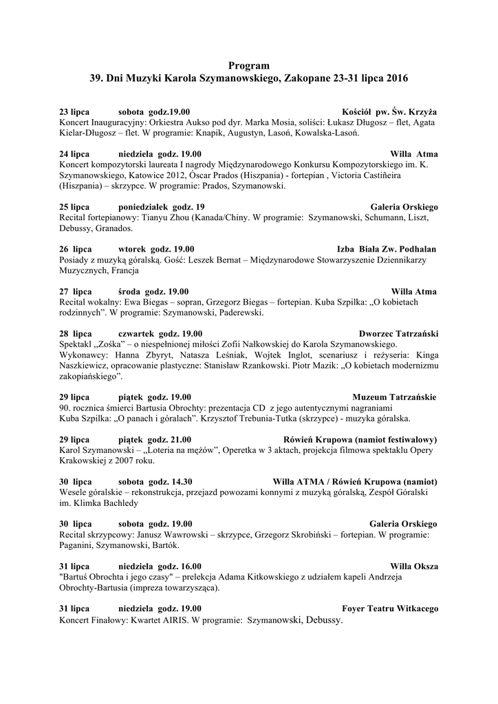 Program 39. Dni Muzyki Karola Szymanowskiego, Zakopane 23-31 lipca 2016 23 lipca sobota godz.19.00 Kościół pw. Św. Krzyża Koncert Inauguracyjny: Orkiestra Aukso pod dyr. Marka Mosia, soliści: Łukasz Długosz – flet, Agata Kielar-Długosz – flet. W programie: Knapik, Augustyn, Lasoń, Kowalska-Lasoń. 24 lipca niedziela godz. 19.00 Willa Atma Koncert kompozytorski laureata I nagrody Międzynarodowego Konkursu Kompozytorskiego im. K. Szymanowskiego, Katowice 2012, Óscar Prados (Hiszpania) - fortepian , Victoria Castiñeira (Hiszpania) – skrzypce. W programie: Prados, Szymanowski. 25 lipca poniedzialek godz. 19 Galeria Orskiego Recital fortepianowy: Tianyu Zhou (Kanada/Chiny. W programie: Szymanowski, Schumann, Liszt, Debussy, Granados. 26 lipca wtorek godz. 19.00 Izba Biała Zw. Podhalan Posiady z muzyką góralską. Gość: Leszek Bernat – Międzynarodowe Stowarzyszenie Dziennikarzy Muzycznych, Francja 27 lipca środa godz. 19.00 Willa Atma Recital wokalny: Ewa Biegas – sopran, Grzegorz Biegas – fortepian. Kuba Szpilka: „O kobietach rodzinnych”. W programie: Szymanowski, Paderewski. 28 lipca czwartek godz. 19.00 Dworzec Tatrzański Spektakl ,,Zośka” – o niespełnionej miłości Zofii Nałkowskiej do Karola Szymanowskiego. Wykonawcy: Hanna Zbyryt, Natasza Leśniak, Wojtek Inglot, scenariusz i reżyseria: Kinga Naszkiewicz, opracowanie plastyczne: Stanisław Rzankowski. Piotr Mazik: „O kobietach modernizmu zakopiańskiego”. 29 lipca piątek godz. 19.00 Muzeum Tatrzańskie 90. rocznica śmierci Bartusia Obrochty: prezentacja CD z jego autentycznymi nagraniami Kuba Szpilka: „O panach i góralach”. Krzysztof Trebunia-Tutka (skrzypce) - muzyka góralska. 29 lipca piątek godz. 21.00 Rówień Krupowa (namiot festiwalowy) Karol Szymanowski – „Loteria na mężów”, Operetka w 3 aktach, projekcja filmowa spektaklu Opery Krakowskiej z 2007 roku. 30 lipca sobota godz. 14.30 Willa ATMA / Rówień Krupowa (namiot) Wesele góralskie – rekonstrukcja, przejazd powozami konnymi z muzyką góralską, Zespół Góralski im. Klimka Bachledy 30 lipca sobota godz. 19.00 Galeria Orskiego Recital skrzypcowy: Janusz Wawrowski – skrzypce, Grzegorz Skrobiński – fortepian. W programie: Paganini, Szymanowski, Bartók. 31 lipca niedziela godz. 16.00 Willa Oksza "Bartuś Obrochta i jego czasy" – prelekcja Adama Kitkowskiego z udziałem kapeli Andrzeja Obrochty-Bartusia (impreza towarzysząca). 31 lipca niedziela godz. 19.00 Foyer Teatru Witkacego Koncert Finałowy: Kwartet AIRIS. W programie: Szymanowski, Debussy.