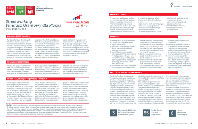 CELE ZRÓWNOWAŻONEGO ROZWOJU paliwa i energetyka REZULTATY I EFEKTY Program jest poddawany bieżącemu monitoringowi. Zmiany postaw dzieci i młodzieży mierzone są kwartalnie za pomocą arkusza oceny. Corocznie badany jest także postęp w zakresie celów szczegółowych, zakładanych rezultatów i efektów działań. Badania wskazu- Streetworking Fundusz Grantowy dla Płocka PKN ORLEN S.A. DLACZEGO STREETWORKING? Fundacja Fundusz Grantowy dla Płocka od lat jest kluczowym narzędziem realizowania działań na rzecz zrównoważonego miasta i regionu Płocka przez PKN ORLEN. Fundusz Grantowy dla Płocka przeprowadziła analizę, która wskazała, że Płock – ze szczególnym uwzględnieniem trzech dzielnic – zmaga się z szeregiem problemów społecznych, takich jak ubóstwo, bezrobocie, uzależnienia, przemoc w rodzinie. Podkreślono zjawisko dziedziczenia „bezradności” – w ramach podwórkowych subkultur dzieci powielają wzorce wyniesione z domu, eksperymentują z używkami, wchodzą w pierwsze konflikty z prawem. Streetworking pozwala skutecznie docierać do dzieci podwójnie wykluczonych – ekonomicznie i społecznie, które funkcjonują, zazwyczaj nie z własnej woli, na marginesie życia społeczno-kulturalnego miasta. Zakres działań projektu jest kompatybilny z lokalnymi strategiami i programami oraz corocznie konsultowany z miejskimi służbami. budując poczucie współodpowiedzialności za realizację celów nie tylko biznesowych, ale i społecznych. W jej ramach Spółka realizuje kilkadziesiąt projektów dla lokalnych społeczności. Płock ma szczególne miejsce na mapie zaangażowania społecznego Spółki – to tu mieści się największy w Polsce kompleks rafineryjno-petrochemiczny. POMOC TAM, GDZIE JEST NAJBARDZIEJ POTRZEBNA Innowacyjne, dopasowane do potrzeb płockiej społeczności narzędzie powstało w 2014 r. dzięki współpracy z lokalnymi instytucjami, przy wsparciu doświadczonego partnera - Grupy Animacji i Pedagogiki Społecznej Praga Północ w Warszawie. GAiPS zapewnił szkolenia dla nowych streetworkerów oraz metodykę pracy „pedagogów ulicy”. Projekt zakłada pracę z dziećmi w cyklach trzyletnich – to optymalny czas potrzebny na zmianę postaw i motywacji. Obecnie pod opieką streetworkerów pozostaje ok. 55 dzieci w wieku od 7 do 16 lat pochodzących z głęboko dysfunkcyjnych rodzin. Głównym założeniem projektu jest bezpośrednia praca z dzieckiem poprzez różnorodne działania realizowane w przestrzeni miasta: animację i organizację czasu wolnego, mediacje środowiskowe i superwizje, usamodzielnianie członków grupy. Streetworkerzy angażują także podopiecznych w projekty dziecięce – od budowy karmników przez warsztaty dla rodziców – budujące kompetencje społeczne. Według szacunków Krajowego Komitetu Wychowania Resocjalizującego na każde sto dzieci w wielu szkolnym w Polsce pięcioro to dzieci ulicy. To szczególna grupa ryzyka: mają dom i rodzinę, ale brak im należytej opieki; ich pogląd na świat i sposób na życie kształtuje ulica, ze wszystkimi jej zagrożeniami, w tym ryzykiem demoralizacji. Wczesna interwencja pozwala skutecznie walczyć z wykluczeniem społecznym i edukacyjnym. Doświadczeni, akceptowani przez dzieci streetworkerzy stają się przewodnikami po nowym – lepszym – życiu. ZBIGNIEW BURŻACKI, PRZEWODNICZĄCY RADY FUNDACJI FUNDUSZ GRANTOWY DLA PŁOCKA 6 SDGs W PRAKTYCE •zmniejszenie skali zachowań ryzykownych dzieci, •wzmocnienie kompetencji społecznych dzieci, •wzrost wiedzy o świecie, •usamodzielnianie się podopiecznych. z doświadczoną Grupą Animacji i Pedagogiki Społecznej Praga Północ w Warszawie, nadzór pedagogiczny i merytoryczny nad metodami pracy, stymulowanie streetworkerów do podejmowania nowych wyzwań; 4) dobór kadry streetworkerów – dobór metod rekrutacji, wolontariat, szkolenia; 5) motywowanie streetworkerów (praca o niewymiernych efektach, odroczonych w czasie) – cykliczne rady wychowawców, wzajemne hospitowanie zajęć, motywacja finansowa i pozafinansowa; 6) koordynacja działań – bieżąca obsługa finansowa, kadrowa i merytoryczna programu, podejmowanie działań interwencyjnych, uczestnictwo w działaniach grup i streetworkerów; 7) monitorowanie rezultatów (efekty niewymierne, odroczone) – dobór metod i narzędzi monitoringu, bieżące raportowanie (szczegółowe karty pracy prowadzone przez streetworkerów), sprawozdania. WYZWANIA POWIĄZANIE ZE STRATEGIĄ Projekt jest spójny z wartościami PKN ORLEN: Odpowiedzialność, Rozwój, Ludzie, Energia, Niezawodność. Stanowią one fundament strategii CSR, która wspiera biznes, ją na widoczny postęp w funkcjonowaniu dzieci i młodzieży, w tym: •ograniczenie skali dysfunkcyjnych zachowań oraz poprawa ich funkcjonowania społecznego, •wzmocnienie rodzin w procesie wychowania i opieki, PRZEWODNIK DLA FIRM Wśród wyzwań, mających największy wpływ na osiągnięcie celów projektu, znalazły się: 1) rekrutacja uczestników – dookreślenie kryteriów kwalifikacji do grupy wsparcia; 2) identyfikacja miejsc (osiedli) spełniających kryteria do objęcia metodą streetworkingu – szerokie konsultacje z instytucjami pomocy społecznej, instytucjami prewencji, obserwacje i obecność na ulicach; 3) prawidłowe wdrażanie metodyki – superwizje i bieżące kontakty KORZYŚCI DLA FIRMY I INTERESARIUSZY Fundacja Fundusz Grantowy dla Płocka to unikatowy w skali Europy Środkowo-Wschodniej przykład partnerstwa publiczno – prywatnego. Wypracowany w Płocku model współpracy biznesu, samorządu i organizacji pozarządowych jest wzorem dla innych społeczności. Fundusz był wielokrotnie przedstawiany przez niezależnych ekspertów jako dobra praktyka (nie tylko w Polsce, ale także we Francji, USA, a nawet w Chinach). Udział w tak wyjątkowej inicjatywie umożliwia partnerom nie tylko wspieranie, ale 3 Liczba osiedli Płocka, które zostały objęte streetworkingiem 