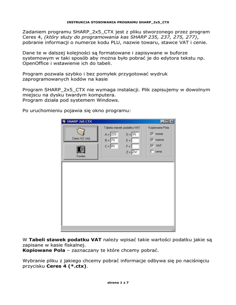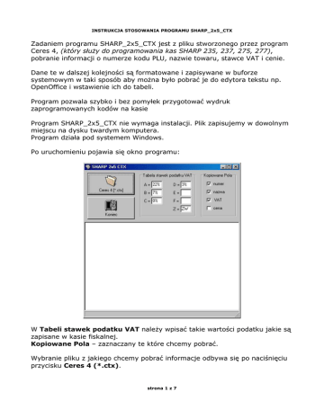 INSTRUKCJA STOSOWANIA PROGRAMU SHARP_2x5_CTX Zadaniem programu SHARP_2x5_CTX jest z pliku stworzonego przez program Ceres 4, (który służy do programowania kas SHARP 235, 237, 275, 277), pobranie informacji o numerze kodu PLU, nazwie towaru, stawce VAT i cenie. Dane te w dalszej kolejności są formatowane i zapisywane w buforze systemowym w taki sposób aby można było pobrać je do edytora tekstu np. OpenOffice i wstawienie ich do tabeli. Program pozwala szybko i bez pomyłek przygotować wydruk zaprogramowanych kodów na kasie Program SHARP_2x5_CTX nie wymaga instalacji. Plik zapisujemy w dowolnym miejscu na dysku twardym komputera. Program działa pod systemem Windows. Po uruchomieniu pojawia się okno programu: W Tabeli stawek podatku VAT należy wpisać takie wartości podatku jakie są zapisane w kasie fiskalnej. Kopiowane Pola – zaznaczany te które chcemy pobrać. Wybranie pliku z jakiego chcemy pobrać informacje odbywa się po naciśnięciu przycisku Ceres 4 (*.ctx). strona 1 z 7 INSTRUKCJA STOSOWANIA PROGRAMU SHARP_2x5_CTX Otworzy się okno wyboru pliku: Zaznaczyć plik i nacisnąć przycisk Otwórz. Program pobiera informacje. Zakończenie procesu pobierania i formatowania danych sygnalizowane jest komunikatem: Wybrane informacje są teraz w schowku systemowym. strona 2 z 7 INSTRUKCJA STOSOWANIA PROGRAMU SHARP_2x5_CTX Uruchomić edytor tekstu np. darmowy OpenOffice.org 1.1.2. Ustawić liczbę kolumn, odstępy między kolumnami, rozmiar marginesów. Najpierw marginesy – Format->Strona: Na zakładce Strona można zmienić wielkość marginesów. Następnie wybrać zakładkę Kolumny. strona 3 z 7 INSTRUKCJA STOSOWANIA PROGRAMU SHARP_2x5_CTX Wybrać liczbę Kolumn oraz odstęp między nimi: Aby zaakceptować zmiany kliknąć pole OK. Jeżeli chcemy można jeszcze zmienić rozmiar i typ czcionki. Można teraz przekopiować dane przygotowane przez program SHARP_2x5_CTX do edytora naciskając Ctrl+V lub przez wybór z menu: Edycja->Wklej. strona 4 z 7 INSTRUKCJA STOSOWANIA PROGRAMU SHARP_2x5_CTX Dalszy etap prac to zaznaczenie całego tekstu: Ctrl+A i wybranie z menu: Narzędzia->Tekst<->Tabela Narzędzie to wpisze zaznaczony tekst do kolumn i wierszy tabeli strona 5 z 7 INSTRUKCJA STOSOWANIA PROGRAMU SHARP_2x5_CTX W okienku Konwertuj teks na tabelę jako Separator w tekście należy zaznaczyć Tabulator – tak zostały przygotowane dane przez program SHARP_2x5_CTX. W opcjach pole Nagłówek powinno być odznaczone. Kliknąć OK. Zostało tylko pozmieniać wedle własnych wymagań: szerokość kolumn, wyrównanie tekstu, odstępy między wierszami. strona 6 z 7 INSTRUKCJA STOSOWANIA PROGRAMU SHARP_2x5_CTX Gotowa tabela może wyglądać tak: strona 7 z 7