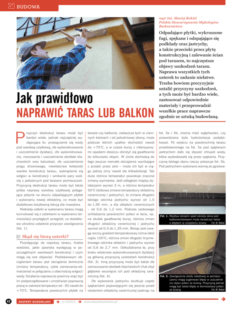 BUDOWA mgr inż. Maciej Rokiel Polskie Stowarzyszenie Mykologów Budownictwa Fot. Atlas Jak prawidłowo NAPRAWIĆ TARAS LUB BALKON P rzyczyn destrukcji tarasu może być tarasie czy balkonie, zwłaszcza tych w ciem- fot. 5a i 5b, można mieć wątpliwości, czy bardzo wiele, jednak najczęściej wy- nych kolorach i od południowej strony, może przewidziana była hydroizolacja podpłyt- stępujące to: przesączanie się wody podczas letnich upałów dochodzić nawet kowa). Po wejściu na powierzchnię tarasu pod warstwę użytkową, złe wykonstruowanie do +70°C, a w czasie burzy z intensywny- przedstawionego na fot. 5a pod spękanym i uszczelnienie dylatacji, złe wykonstruowa- mi opadami deszczu obniżyć się gwałtownie jastrychem dało się słyszeć chlupot wody, nie, mocowanie i uszczelnienie obróbek bla- do kilkunastu stopni. W zimie dochodzą do która wydostawała się przez spękania. Przy- charskich oraz balustrad, złe uszczelnienie tego jeszcze niemałe obciążenia wynikające czynę takiego stanu rzeczy pokazuje fot. 5b. progu drzwiowego, niewłaściwa kolejność z przejść przez zero – może ich być w cią- Pod jastrychem wykonano wannę ze zgrzewa- warstw konstrukcji tarasu, wykraplanie się gu jednej zimy nawet sto kilkadziesiąt. Tak wilgoci w konstrukcji i wnikanie pary wod- duża różnica temperatur powoduje znaczne nej z położonych pod tarasem pomieszczeń. zmiany wymiarów. Jeśli odległość między dy- Przyczyną destrukcji tarasu może być także latacjami wynosi 3 m, a różnica temperatur próba naprawy warstwy użytkowej polega- 50°C (dobowa zmiana temperatury okładziny jąca jedynie na skuciu odpadających płytek ceramicznej i jastrychu), to zmiana długości i wykonaniu nowej okładziny, co może być takiego odcinka jastrychu wynosi od 1,5 dodatkowo kosztowną lekcją dla inwestora. do 1,95 mm, a dla okładzin ceramicznych Niekiedy usterki w wykonaniu tarasu mogą – od 0,6 do 1,2 mm. Podczas szokowego kumulować się z usterkami w wykonaniu ter- schładzania powierzchni połaci w lecie, np. moizolacji przyległych przegród, co dodatko- na skutek gwałtownej burzy, różnica zmian wo utrudnia ustalenie przyczyn zawilgocenia długości okładziny ceramicznej i jastrychu (fot. 1). wynosi od 0,3 do 1,35 mm. Biorąc pod uwa- Skąd się biorą usterki? 42 Odpadające płytki, wykruszone fugi, spękane i odspajające się podkłady oraz jastrychy, a także przecieki przez płytę konstrukcyjną i zalewanie ścian pod tarasem, to najczęstsze objawy uszkodzeń tarasu. Naprawa wszystkich tych usterek to zadanie niełatwe. Trzeba bowiem precyzyjnie ustalić przyczyny uszkodzeń, a tych może być bardzo wiele, zastosować odpowiednie materiały i przeprowadzić wszelkie prace naprawcze zgodnie ze sztuką budowlaną. gę roczny gradient temperaturowy (zima-lato) rzędu 100°C, różnica zmian długości trzyme- Przystępując do naprawy tarasu, trzeba trowego odcinka okładzin i jastrychu wynosi wiedzieć, jakie zjawiska występują w po- od 0,6 do 2,7 mm. Odkształcenia te, przy szczególnych warstwach konstrukcji i czym braku właściwie wykonstruowanych dylatacji mogą się one objawiać. Podstawowym ob- są gtówną przyczyną uszkodzeń konstrukcji ciążeniem tarasu jest obciążenie termiczne (fot. 3). Inną przyczyną może być także złe (zmiany temperatury, cykle zamarzania-od- zamocowanie obróbek blacharskich i/lub zbyt marzania) w połączeniu z obecnością wilgoci/ głębokie wsunięcie ich pod okładzinę cera- wody. Działania naprawcze powinny więc być miczną (fot. 4). im podporządkowane i umożliwiać poprawną Złe wykonanie jastrychu skutkuje często pracę w zakresie temperatur od –30 nawet do spękaniami pojawiającymi się jeszcze przed +70°C. Temperatura powierzchni płytek na ułożeniem okładziny ceramicznej (patrząc na EKSPERT BUDOWLANY nr 4/2015 Fot. 1. Wypływ skroplin spod ościeży okna pod balkonem/tarasem może świadczyć także o błędach w ociepleniu ściany Fot. M. Rokiel www.ekspertbudowlany.pl Fot. 2. Zawilgocenia strefy cokołowej w pomieszczeniu mogą sugerować błędy w uszczelnieniu styku połaci ze ścianą. Przyczyną jednak mogą być także błędy w termoizolacji połaci ze ścianą Fot. M. Rokiel BUDOWA nej membrany dachowej, którą wyciągnięto Taras nad pomieszczeniem ogrzewanym (np. typu PCC) możemy to zrobić już po kilku ponad powierzchnię i zamocowano w ścia- z warstwą użytkową z płytek powinien mieć dniach, ale jeśli zastosowany został beton lub nach, ale w taki sposób, że uszczelnienie tego dwie hydroizolacje i paroizolację. Izolacja zaprawa cementowa, trzeba odczekać około miejsca jest w zasadzie niemożliwe. Jedyna podpłytkowa z elastycznego szlamu zapo- 3–3,5 tygodnia. Warstwa ta musi być moco- możliwa naprawa tego tarasu to zerwanie biega wnikaniu wody w jastrych dociskowy, wana do konstrukcyjnej części ściany (jeżeli wszystkich warstw do płyty konstrukcyjnej natomiast druga hydroizolacja (tzw. między- ściana jest docieplona to pod termoizolacją i ponowne wykonanie całej konstrukcji, ale warstwowa), w razie uszkodzenia uszczel- cokołu). zgodnie z zasadami sztuki budowlanej. nienia podpłytkowego, zabezpiecza przed Na paroizolacji układa się termoizolację po- wnikaniem wody w głębsze warstwy i w kon- łaci. Może to być styropian klasy EPS 200 lub sekwencji przed przeciekami. Jeżeli hydroizo- wyższej lub polistyren ekstrudowany (XPS), Etapy prac naprawczych krok po kroku lacja międzywarstwowa nie jest wykonywana zwany potocznie styrodurem. Płyty powinny Jak więc postępować, kiedy można po- jako osobna warstwa, to paroizolacja pod mieć frezowane obrzeża, w innym przypad- zostawić część warstw konstrukcji tarasu, dociepleniem musi pełnić funkcję hydroizola- ku należy je układać w dwóch warstwach, a kiedy konieczne jest wykonanie go od cji. W takim przypadku zamiast hydroizolacji z przesunięciem szczelin. Szczególnie