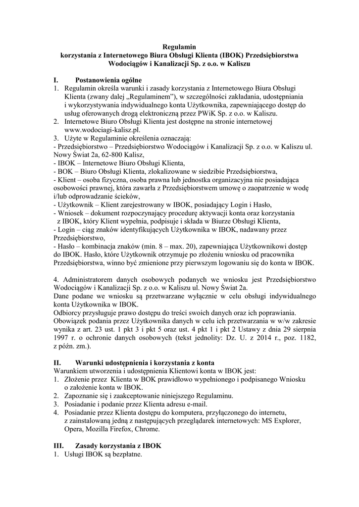 Regulamin korzystania z Internetowego Biura Obsługi Klienta (IBOK) Przedsiębiorstwa Wodociągów i Kanalizacji Sp. z o.o. w Kaliszu I. Postanowienia ogólne 1. Regulamin określa warunki i zasady korzystania z Internetowego Biura Obsługi Klienta (zwany dalej „Regulaminem”), w szczególności zakładania, udostępniania i wykorzystywania indywidualnego konta Użytkownika, zapewniającego dostęp do usług oferowanych drogą elektroniczną przez PWiK Sp. z o.o. w Kaliszu. 2. Internetowe Biuro Obsługi Klienta jest dostępne na stronie internetowej www.wodociagi-kalisz.pl. 3. Użyte w Regulaminie określenia oznaczają: - Przedsiębiorstwo – Przedsiębiorstwo Wodociągów i Kanalizacji Sp. z o.o. w Kaliszu ul. Nowy Świat 2a, 62-800 Kalisz, - IBOK – Internetowe Biuro Obsługi Klienta, - BOK – Biuro Obsługi Klienta, zlokalizowane w siedzibie Przedsiębiorstwa, - Klient – osoba fizyczna, osoba prawna lub jednostka organizacyjna nie posiadająca osobowości prawnej, która zawarła z Przedsiębiorstwem umowę o zaopatrzenie w wodę i/lub odprowadzanie ścieków, - Użytkownik – Klient zarejestrowany w IBOK, posiadający Login i Hasło, - Wniosek – dokument rozpoczynający procedurę aktywacji konta oraz korzystania z IBOK, który Klient wypełnia, podpisuje i składa w Biurze Obsługi Klienta, - Login – ciąg znaków identyfikujących Użytkownika w IBOK, nadawany przez Przedsiębiorstwo, - Hasło – kombinacja znaków (min. 8 – max. 20), zapewniająca Użytkownikowi dostęp do IBOK. Hasło, które Użytkownik otrzymuje po złożeniu wniosku od pracownika Przedsiębiorstwa, winno być zmienione przy pierwszym logowaniu się do konta w IBOK. 4. Administratorem danych osobowych podanych we wniosku jest Przedsiębiorstwo Wodociągów i Kanalizacji Sp. z o.o. w Kaliszu ul. Nowy Świat 2a. Dane podane we wniosku są przetwarzane wyłącznie w celu obsługi indywidualnego konta Użytkownika w IBOK. Odbiorcy przysługuje prawo dostępu do treści swoich danych oraz ich poprawiania. Obowiązek podania przez Użytkownika danych w celu ich przetwarzania w w/w zakresie wynika z art. 23 ust. 1 pkt 3 i pkt 5 oraz ust. 4 pkt 1 i pkt 2 Ustawy z dnia 29 sierpnia 1997 r. o ochronie danych osobowych (tekst jednolity: Dz. U. z 2014 r., poz. 1182, z późn. zm.). II. Warunki udostępnienia i korzystania z konta Warunkiem utworzenia i udostępnienia Klientowi konta w IBOK jest: 1. Złożenie przez Klienta w BOK prawidłowo wypełnionego i podpisanego Wniosku o założenie konta w IBOK. 2. Zapoznanie się i zaakceptowanie niniejszego Regulaminu. 3. Posiadanie i podanie przez Klienta adresu e-mail. 4. Posiadanie przez Klienta dostępu do komputera, przyłączonego do internetu, z zainstalowaną jedną z następujących przeglądarek internetowych: MS Explorer, Opera, Mozilla Firefox, Chrome. III. Zasady korzystania z IBOK 1. Usługi IBOK są bezpłatne. 2. Użytkownik ma dostęp do następujących modułów swojego konta IBOK: - Faktury – przeglądanie i wydruk faktur Użytkownika, wystawionych przez Przedsiębiorstwo, - Odczyty – historia odczytów wodomierzy, - Rozrachunki – przeglądanie rozrachunków Użytkownika, - Analizy – analiza zużycia wody i płatności, - Dane Klienta – informacje o Użytkowniku, - Wodomierze – dane wodomierzy Użytkownika, - Zgłoszenia – przekazywanie informacji do odpowiedniego działu Przedsiębiorstwa, - Zgłoszenia odczytu – możliwość przekazania wskazań wodomierza Użytkownika, - Ustawienia – informacje podstawowe: hasło, adres e-mail, nr telefonu Użytkownika, - Korespondencja – komunikaty i wiadomości dla Klientów Przedsiębiorstwa. IV. Dodatkowe informacje 1. Przedsiębiorstwo nie gwarantuje nieprzerwanego i niezakłóconego dostępu do IBOK, w przypadku wystąpienia przyczyn niezależnych od Przedsiębiorstwa. 2. Przedsiębiorstwo nie ponosi odpowiedzialności za konsekwencje przekazania przez Użytkownika logina i hasła do swojego konta w IBOK osobom trzecim. 3. Przedsiębiorstwo podejmie wszelkie możliwe działania, aby zapewnić poprawne działanie IBOK, w zakresie możliwości wynikających z dostępnego poziomu technicznego. 4. Przedsiębiorstwo ma prawo zablokować dostęp do konta, w przypadku stwierdzenia naruszenia przez Użytkownika postanowień niniejszego regulaminu lub przepisów prawa. 5. Przedsiębiorstwo nie odpowiada za rzetelność danych przekazanych do IBOK przez Użytkownika. 6. Przedsiębiorstwo nie ponosi odpowiedzialności za konsekwencje wynikające z naruszenia przez Użytkownika postanowień niniejszego Regulaminu oraz za działania lub zaniechania dostawcy elektronicznych kanałów komunikacyjnych. 7. Użytkownik zgłasza wszelkie nieprawidłowości lub reklamacje, dotyczące funkcjonowania IBOK, w formie pisemnej w BOK Przedsiębiorstwa, na adres siedziby lub email: [email protected]. 8. Przedsiębiorstwo zastrzega sobie prawo do zmian zasad funkcjonowania IBOK. O ewentualnych zmianach, Użytkownicy zostaną powiadomieni drogą elektroniczną. Zmiany zostaną również opublikowane na stronie Przedsiębiorstwa www.wodociagikalisz.pl. O braku akceptacji zmian niniejszego Regulaminu, Użytkownik informuje pisemnie Przedsiębiorstwo w ciągu 14 dni. V. Obowiązki i prawa Użytkownika 1. Użytkownik jest zobowiązany do korzystania z IBOK zgodnie z obowiązującymi przepisami prawa oraz zapisami niniejszego Regulaminu, w szczególności do: - niepodejmowania działań zmierzających do odczytania haseł innych użytkowników, - wylogowania się niezwłocznie po zakończeniu sesji. 2. Użytkownik jest zobowiązany do bieżącego kontrolowania informacji przekazywanych przez Przedsiębiorstwo za pomocą IBOK. 3. Użytkownik ma prawo do rezygnacji z korzystania z IBOK w każdym czasie, w szczególności gdy nie akceptuje zmian wprowadzonych do Regulaminu. Rezygnacja winna być zgłoszona w formie pisemnej. Konto w IBOK zostanie usunięte w ciągu 7 dni od daty złożenia dyspozycji rezygnacji przez U