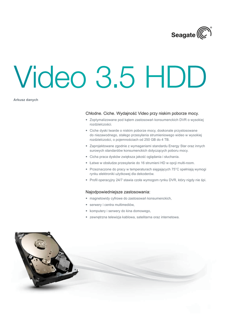 Video 3.5 HDD Arkusz danych Chłodne. Ciche. Wydajność Video przy niskim poborze mocy. • Zoptymalizowane pod kątem zastosowań konsumenckich DVR o wysokiej rozdzielczości. • Ciche dyski twarde o niskim poborze mocy, doskonale przystosowane do niezawodnego, stałego przesyłania strumieniowego wideo w wysokiej rozdzielczości, o pojemnościach od 250 GB do 4 TB. • Zaprojektowane zgodnie z wymaganiami standardu Energy Star oraz innych surowych standardów konsumenckich dotyczących poboru mocy. • Cicha praca dysków zwiększa jakość oglądania i słuchania. • Łatwe w obsłudze przesyłanie do 16 strumieni HD w opcji multi-room. • Przeznaczone do pracy w temperaturach sięgających 75°C spełniają wymogi rynku elektroniki użytkowej dla dekoderów. • Profil operacyjny 24/7 stawia czoła wymogom rynku DVR, który nigdy nie śpi. Najodpowiedniejsze zastosowania: • magnetowidy cyfrowe do zastosowań konsumenckich, • serwery i centra multimediów, • komputery i serwery do kina domowego, • zewnętrzna telewizja kablowa, satelitarna oraz internetowa. Video 3.5 HDD Specyfikacja 4 TB1 3 TB1 2 TB1 1 TB1 500 GB1 320 GB1 250 GB1 Numer modelu ST4000VM000 ST3000VM002 ST2000VM003 ST1000VM002 ST3500312CS ST3320311CS ST3250312CS Nazwa modelu Video 3.5 HDD Video 3.5 HDD SATA 6 Gb/s z technologią NCQ SATA 6 Gb/s z technologią NCQ przedtem Pipeline HD™ SATA 6 Gb/s z technologią NCQ przedtem Pipeline HD SATA 6 Gb/s z technologią NCQ przedtem Pipeline HD SATA 3 Gb/s z technologią NCQ przedtem Pipeline HD SATA 3 Gb/s z technologią NCQ przedtem Pipeline HD SATA 3 Gb/s z technologią NCQ 64 6,0/3,0/1,5 64 6,0/3,0/1,5 64 6,0/3,0/1,5 64 6,0/3,0/1,5 8 3/1,5 8 3/1,5 8 3/1,5 20 20 20 20 10 10 10 16 16 16 16 10 10 10 <17 <17 <17 <17 <17 <17 <6 <6 <12 <12 <12 <12 <12 <12 5 V ±5% 12 V ±10% 5 V ±5% 12 V ±10% 5 V ±5% 12 V ±10% 5 V ±5% 12 V ±10% 5 V ±5% 12 V ±10% 5 V ±5% 12 V ±10% 5 V ±5% 12 V ±10% Tak Tak Tak Tak Tak Tak Tak 0 75 -40 70 0 75 -40 70 0 75 -40 70 0 75 -40 70 0 75 -40 70 0 75 -40 70 0 75 -40 70 20/30 20/30 20/30 20/30 20/30 20/30 20/30 5 do 90/5 do 95 5 do 90/5 do 95 5 do 95/5 do 95 5 do 95/5 do 95 5 do 95/5 do 95 5 do 95/5 do 95 5 do 95/5 do 95 30/40 30/40 37,7/40 37,7/40 37,7/40 37,7/40 37,7/40 80 (10 ms) 300 80 (10 ms) 300 80 (2 ms) 300 80 (2 ms) 350 70 (2 ms) 350 70 (2 ms) 350 70 (2 ms) 350 0,25 0,5 0,25 0,25 0,5 0,25 0,25 0,5 0,25 0,25 0,5 0,25 0,5 0,5 0,25 0,5 0,5 0,25 0,5 0,5 0,25 3 3 3 3 3 3 3 3 5 1 5 1 5 1 2 7,5 5 0,75 2 7,5 5 0,75 2 5,05 3,74 0,819 2 3,7 2,5 0,8 2 3,4 3 0,7 2 3,4 3 0,6 2 3,4 3 0,7 2,3/2,5 2,3/2,5 2,3/2,4 1,9/2,1 1,9/2 1,9/2 1,9/2 Interfejs Wydajność Pamięć podręczna, wielosegmentowa (MB) Obsługiwane prędkości transferu danych SATA (Gb/s) Jednoczesne strumienie SDTV (przy założeniu, że bufor hosta każdego strumienia ma rozmiar 256 KB) Jednoczesne strumienie HDTV (Przy założeniu, że bufor hosta każdego strumienia ma rozmiar 2 MB) Czas gotowości od rozruchu (s, typowo) Czas gotowości od oczekiwania (s, typowo) Napięcie Tolerancja napięcia (w tym szumów) Środowisko pracy Nie zawiera halogenu Temperatura otoczenia (°C) Podczas pracy (otoczenie, min.) Podczas pracy (obudowa dysku, maks.) W stanie spoczynku (otoczenie, min.) W stanie spoczynku (otoczenie, maks.) Temperatura (°C), podczas pracy/w stanie spoczynku (°C na godzinę maks.) Wilgotność względna, podczas pracy/w stanie spoczynku, bez kondensacji (bez kondensacji, %) Temperatura termometru wilgotnego, podczas pracy/w stanie spoczynku (°C) Odporność na wstrząsy Podczas pracy (G, maks.) W stanie spoczynku: 2 ms (G, maks.) Drgania, podczas pracy 5 do 22 Hz (ograniczone przemieszczanie) (G) 22 do 350 Hz (G) 350 do 500 Hz (G) Drgania, w stanie spoczynku 5 do 350 Hz (G) 350 do 500 Hz (G) Zarządzanie energią Prąd rozruchowy (typowo 12 V, A) Profil użytkowej pamięci masowej (W) W stanie spoczynku, średnio (W) W stanie gotowości/uśpienia (typowo, W) Akustyka Profil osobistego magnetowidu cyfrowego (typowo/maks., bele) Niezawodność Liczba cykli parkowania/powrotu ze strefy parkowania (25°C, wilgotność 50%) Nieodwracalne błędy odczytu na liczbę odczytanych bitów Współczynnik AFR (%) Godziny pracy Wymiary Wysokość (mm) Szerokość (mm) Głębokość (mm) Waga (g) Ilość jednostek w kartonie Ilość kartonów na palecie Ilość kartonów w warstwie 1 300 000 300 000 300 000 300 000 — — — 1 sektor na 1015 0,55 8760 1 sektor na 1015 0,55 8760 1 sektor na 1015 0,55 8760 1 sektor na 1015 0,55 8760 1 sektor na 1015 0,55 8760 1 sektor na 1015 0,55 8760 1 sektor na 1015 0,55 8760 26,11 101,6 146,99 610 20 40 8 26,11 101,6 146,99 610 20 40 8 26,1 101,6 147 535 20 40 8 20,2 101,6 147 415 25 40 8 20,2 101,85 146,99 415 25 40 8 20,2 101,85 146,99 415 25 40 8 20,2 101,85 146,99 415 25 40 8 W przypadku oznaczania pojemności dysków, jeden gigabajt (oznaczany także jako „GB”) jest równy jednemu miliardowi bajtów, a jeden terabajt (oznaczany także jako „TB”) jest równy jednemu bilionowi bajtów. www.seagate.com AMERYKA PŁN. I PŁD. AZJA/PACYFIK EUROPA, BLISKI WSCHÓD I AFRYKA Seagate Technology LLC 10200 South De Anza Boulevard, Cupertino, California 95014, USA, +1 408 658 1000 Seagate Singapore International Headquarters Pte. Ltd. 7000 Ang Mo Kio Avenue 5, Singapur 569877, +65 6485 3888 Seagate Technology SAS 16-18 rue du Dôme, 92100 Boulogne-Billancourt, Francja, +33 1 41 86 1000 © 2013 Seagate Technology LLC. Wszelkie prawa zastrzeżone. Wydrukowano w USA. Seagate, Seagate Technology i logo Wave są zastrzeżonymi znakami towarowymi firmy Seagate Technology LLC w Stanach Zjednoczonych i/lub innych krajach. Wszystkie pozostałe znaki towarowe i zastrzeżone znaki towarowe należą do odpowiednich właścicieli. W przypadku oznaczania pojemności dysków, jeden gigabajt (oznaczany także jako „GB”) jest równy jednemu miliardowi bajtów, a jeden terabajt (oznaczany także jako „TB”) jest równy jednemu bilionowi bajtów. W s