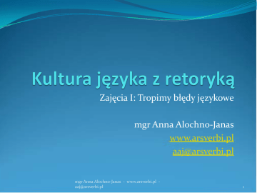 Zajęcia I: Tropimy błędy językowe mgr Anna Alochno-Janas www.arsverbi.pl [email protected] mgr Anna Alochno-Janas - www.arsverbi.pl [email protected] 1 Czym jest kultura języka? Piękne słowo jest elementem pięknego życia. – Gaston Bachelard Kultura języka a kultura umysłowa to właściwie synonimy. – Witold Doroszewski Język można uważać za autoteliczną wartość kultury porównywalną ze sztuką czy też nauką. – Jadwiga Puzynina Kultura języka zaczyna się tam, gdzie zaczyna się świadomość językowa, gdzie ludzie nie tylko mówią, lecz zastanawiają się nad tym, jak mówią. – Stanisław Szober mgr Anna Alochno-Janas - www.arsverbi.pl [email protected] 2 Czym jest kultura języka? Kultura języka – jeden z elementów kultury osobistej. Świadomość językowa, znajomość mechanizmów językowych i sprawność w posługiwaniu się normą językową. Dbałość o język: pełna szacunku postawa dla języka. Elementy kultury języka to: 1. poprawność językowa; 2. sprawność językowa (kompetencja); 3. etyka słowa (w reklamie, polityce); 4. estetyka słowa (w literaturze, poezji); 5. retoryka; 6. erystyka. mgr Anna Alochno-Janas - www.arsverbi.pl [email protected] 3 Do czego służy ta wiedza? Człowiek świadomy znaczenia języka i siły jego oddziaływania, będzie potrafił z nich korzystać do własnych celów w różnych sferach życia. Znajomość mechanizmów językowych pozwala zdemaskować nieetyczne techniki stosowane przez innych użytkowników języka i obronić się przed nimi. Brak ogłady językowej dyskredytuje człowieka, wskazuje bowiem na braki w jego wykształceniu i kulturze osobistej. mgr Anna Alochno-Janas - www.arsverbi.pl [email protected] 4 Historia i współczesność 1440 r. – Traktat o ortografii Jakuba Parkoszowica – początek dziejów kultury języka w Polsce i pierwszy wzorzec ogólnopolskiego języka kulturalnego. 1562 r. – w zbiorze epigramatów Źwierzyniec Mikołaj Rej zawarł swój słynny dwuwiersz: A niechaj narodowie wżdy postronni znają, / Polacy nie gęsi, iż swój język mają. Współczesną normę językową ustalają: Rada Języka Polskiego, Komisja Kultury Języka i Towarzystwo Miłośników Języka Polskiego. mgr Anna Alochno-Janas - www.arsverbi.pl [email protected] 5 Schemat komunikacji R. Jakobsona Roman Jakobson (1896-1982), rosyjski strukturalista w swoim słynnym tekście Poetyka w świetle językoznawstwa (1960 r.) sformułował uniwersalny model komunikacji (akt mowy) oparty na sześciu elementach: 1. nadawca, 2. odbiorca, 3. komunikat, 4. kod, 5. kontekst, 6. kontakt. mgr Anna Alochno-Janas - www.arsverbi.pl [email protected] 6 Schemat komunikacji R. Jakobsona Każdy z tych elementów determinuje odpowiednią funkcję komunikatu językowego, a funkcja nakierowuje na ten element. Jedna z funkcji jest zawsze dominująca nad innymi. 1. funkcja ekspresywna (emotywna), 2. funkcja impresywna (konatywna), 3. funkcja poznawcza (referencyjna), 4. funkcja metajęzykowa, 5. funkcja fatyczna, 6. funkcja poetycka. mgr Anna Alochno-Janas - www.arsverbi.pl [email protected] 7 Schemat komunikacji R. Jakobsona mgr Anna Alochno-Janas - www.arsverbi.pl [email protected] 8 Norma, uzus i błąd językowy Norma językowa – zwyczaj językowy właściwy dla środowiska kulturalnego; oficjalnie przyjęte standardy poprawności językowe skodyfikowane w słownikach i uznane za powszechnie obowiązujące. Uzus językowy – (łac. korzystanie, praktyka) przyjęte w danym społeczeństwie i realnie używane zwyczaje językowe; wyraz normy językowej i jedno z kryteriów rozstrzygających o poprawności językowej. Uzus może (ale nie musi) zostać usankcjonowany przez normę językową. Błąd językowy – niezamierzone odstępstwo od normy językowej. mgr Anna Alochno-Janas - www.arsverbi.pl [email protected] 9 Typy błędów językowych 1. ortograficzny, 2. gramatyczny (np. fleksyjny), 3. interpunkcyjny, 4. składniowy, 5. frazeologiczny, 6. stylistyczny, 7. fonetyczny. mgr Anna Alochno-Janas - www.arsverbi.pl [email protected] 10 Rodzaje słowników - językowe 1. ortograficzny, 2. interpunkcyjny, 3. języka polskiego, 4. poprawnej polszczyzny, 5. wyrazów obcych, 6. etymologiczny, 7. frazeologiczny, 8. synonimów, 9. antonimów, 10. idiomów, 11. gwar, 12. języków obcych. mgr Anna Alochno-Janas - www.arsverbi.pl [email protected] 11 Rodzaje słowników - inne 1. terminologii z danej dziedziny nauki, np. literaturoznawstwa, psychologii, muzyki, historii, religii; 2. pisarzy; 3. epok literackich, historycznych; 4. tematyczne, np. symboli, mitów, motywów, gatunków literackich, gatunków filmowych, erotyzmu; 5. leksykony – także nietypowe, np. Leksykon samobójców, Leksykon śmierci wielkich ludzi. mgr Anna Alochno-Janas - www.arsverbi.pl [email protected] 12 Popularne zjawiska językowe Neologizm – innowacja językowa, wyraz nowo utworzony. Internacjonalizm – wyraz funkcjonujący w wielu językach w podobnej postaci. Zapożyczenie – wyraz przejęty z języka obcego; kalka językowa. Archaizm – wyraz przestarzały, staroświecki, wychodzący z użycia. Regionalizm – wyraz, konstrukcja lub wymowa właściwe dla danego regionu. mgr Anna Alochno-Janas - www.arsverbi.pl [email protected] 13 Popularne zjawiska językowe Homonimy – wyrazy jednakowo brzmiące, lecz różniące się znaczeniem i niekiedy pisownią; rozróżniamy je na podstawie kontekstu. Frazeologizm – utarty zwrot, związek frazeologiczny. Tautologia – występuje, kiedy wyraz określający powtarza znaczenie wyrazu określanego. Pleonazm – wyrażenie składające się z wyrazów znaczących to samo. mgr Anna Alochno-Janas - www.arsverbi.pl [email protected] 14 Kultura korespondencji e-mailowej E-mail i list tradycyjny to ta sama forma wypowiedzi pisemnej przekazywana za pomocą odmiennego medium. Oficjalna korespondencja posiada swoje ustalone reguły. Grzech główny: „Witam” w nagłówku! Inne częste błędy: brak p