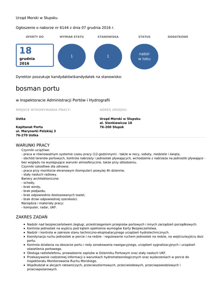 Urząd Morski w Słupsku Ogłoszenie o naborze nr 6144 z dnia 07 grudnia 2016 r. OFERTY DO WYMIAR ETATU STANOWISKA STATUS 1 1 nabór w toku 18 grudnia 2016 DODATKOWE Dyrektor poszukuje kandydatów\kandydatek na stanowisko: bosman portu w Inspektoracie Administracji Portów i Hydrografii MIEJSCE WYKONYWANIA PRACY: ADRES URZĘDU: Ustka Urząd Morski w Słupsku al. Sienkiewicza 18 76-200 Słupsk Kapitanat Portu ul. Marynarki Polskiej 3 76-270 Ustka WARUNKI PRACY Czynniki uciążliwe: - praca w równoważnym systemie czasu pracy (12-godzinnym) - także w nocy, soboty, niedziele i święta, - obchód terenów portowych, kontrola nabrzeży i jednostek pływających, wchodzenie z nabrzeża na jednostki pływające bez względu na występujące warunki atmosferyczne, także przy oblodzeniu. Czynniki szkodliwe dla zdrowia: - praca przy monitorze ekranowym (komputer) powyżej 4h dziennie, - stały nasłuch radiowy. Bariery architektoniczne: - schody, - brak windy, - brak podjazdu, - brak odpowiednio dostosowanych toalet, - brak drzwi odpowiedniej szerokości. Narzędzia i materiały pracy: - komputer, radar, UKF. ZAKRES ZADAŃ Nadzór nad bezpieczeństwem żeglugi, przestrzeganiem przepisów portowych i innych zarządzeń porządkowych. Kontrola jednostek na wyjściu pod kątem spełnienia wymogów Karty Bezpieczeństwa. Nadzór i kontrola w zakresie stanu techniczno-eksploatacyjnego urządzeń hydrotechnicznych. Koordynacja ruchu jednostek w porcie i na redzie - regulowanie ruchem jednostek na redzie, na wejściu/wyjściu do/z portu. Kontrola działania na obszarze portu i redy oznakowania nawigacyjnego, urządzeń sygnalizacyjnych i urządzeń oświetlenia portowego. Obsługa radiotelefonu, prowadzenie zapisów w Dzienniku Portowym oraz stały nasłuch UKF. Przekazywanie codziennej informacji o warunkach hydrometeorologicznych oraz wydarzeniach w porcie do Inspektoratu Monitorowania Ruchu Morskiego. Współudział w akcjach ratowniczych, przeciwsztormowych, przeciwlodowych, przeciwpowodziowych i przeciwpożarowych. WYMAGANIA NIEZBĘDNE Wykształcenie: średnie doświadczenie zawodowe: w obszarze związanym z gospodarką morską Świadectwo przeszkolenia w zakresie wykorzystania radaru i A.R.P.A. na poziomie operacyjnym lub świadectwo operatora radarowego wydane po 24 sierpnia 2000 r. Świadectwo operatora łączności bliskiego zasięgu UKF Ważne świadectwo zdrowia dla marynarzy wydane przez uprawnionego lekarza Znajomość języka angielskiego na poziomie komunikatywnym Znajomość obsługi komputera Posiadanie obywatelstwa polskiego Korzystanie z pełni praw publicznych Nieskazanie prawomocnym wyrokiem za umyślne przestępstwo lub umyśle przestępstwo skarbowe WYMAGANIA DODATKOWE Wykształcenie: średnie - profil morski doświadczenie zawodowe: w pracy w administracji Dyplom na poziomie operacyjnym w dziale pokładowym Dyplom szypra drugiej klasy Umiejętność pracy w zespole Komunikatywność Odpowiedzialność Znajomość przepisów z zakresu administracji morskiej DOKUMENTY I OŚWIADCZENIA NIEZBĘDNE Życiorys/CV i list motywacyjny Kopie dokumentów potwierdzających spełnienie wymagania niezbędnego w zakresie wykształcenia Kopie dokumentów potwierdzających spełnienie wymagania niezbędnego w zakresie doświadczenia zawodowego / stażu pracy Kopia świadectwa przeszkolenia w zakresie wykorzystania radaru i A.R.P.A. na poziomie operacyjnym lub świadectwa operatora radarowego wydanego po 24 sierpnia 2000 r. Kopia świadectwa operatora łączności bliskiego zasięgu UKF Kopia ważnego świadectwa zdrowia dla marynarzy wydanego przez uprawnionego lekarza Oświadczenie o posiadaniu obywatelstwa polskiego albo kopia dokumentu potwierdzającego posiadanie polskiego obywatelstwa Oświadczenie o wyrażeniu zgody na przetwarzanie danych osobowych do celów naboru Oświadczenie o korzystaniu z pełni praw publicznych Oświadczenie o nieskazaniu prawomocnym wyrokiem za umyślne przestępstwo lub umyślne przestępstwo skarbowe DOKUMENTY I OŚWIADCZENIA DODATKOWE Kopie dokumentów potwierdzających spełnienie wymagania dodatkowego w zakresie wykształcenia Kopie dokumentów potwierdzających spełnienie wymagania dodatkowego w zakresie doświadczenia zawodowego / stażu pracy Kopia dyplomu na poziomie operacyjnym w dziale pokładowym Kopia dyplomu szypra drugiej klasy TERMINY I MIEJSCE SKŁADANIA DOKUMENTÓW Dokumenty należy złożyć do: 18 grudnia 2016 r. Decyduje data: stempla pocztowego / osobistego dostarczenia oferty do urzędu Miejsce składania dokumentów: Urząd Morski - sekretariat Sienkiewicza 18 76-200 Słupsk INNE INFORMACJE: W miesiącu poprzedzającym datę upublicznienia ogłoszenia wskaźnik zatrudnienia osób niepełnosprawnych w urzędzie, w rozumieniu przepisów o rehabilitacji zawodowej i społecznej oraz zatrudnianiu osób niepełnosprawnych, wynosi co najmniej 6%. Nasz Urząd jest pracodawcą równych szans i wszystkie aplikacje są rozważane z równą uwagą bez względu na płeć, wiek, niepełnosprawność, rasę, narodowość, przekonania polityczne, przynależność związkową, pochodzenie etniczne, wyznanie, orientację seksualną czy też jakąkolwiek inną cechę prawnie chronioną. W ofercie należy podać dane kontaktowe: adres do korespondencji, numer telefonu, adres e-mailowy oraz wskazać sposób postępowania z dokumentami rekrutacyjnymi po zakończeniu naboru (odbiór osobisty/odesłanie/zniszczenie). Wszystkie oświadczenia (wzory oświadczeń zamieszczone są na stronie internetowej Urzędu) muszą być opatrzone datą sporządzenia i własnoręcznie podpisane. Oferty niekompletne oraz złożone i uzupełniane po terminie nie będą rozpatrywane (decyduje data stempla pocztowego – data wpływu do Urzędu nie później niż trzy dni od daty określającej termin składania dokumentów). Kandydatki/kandydaci spełniające/-y wymagania formalne zostaną zakwalifikowane/-i do dalszego etapu naboru, o czym będą poinformowane/-i e-mailem i/lub tel