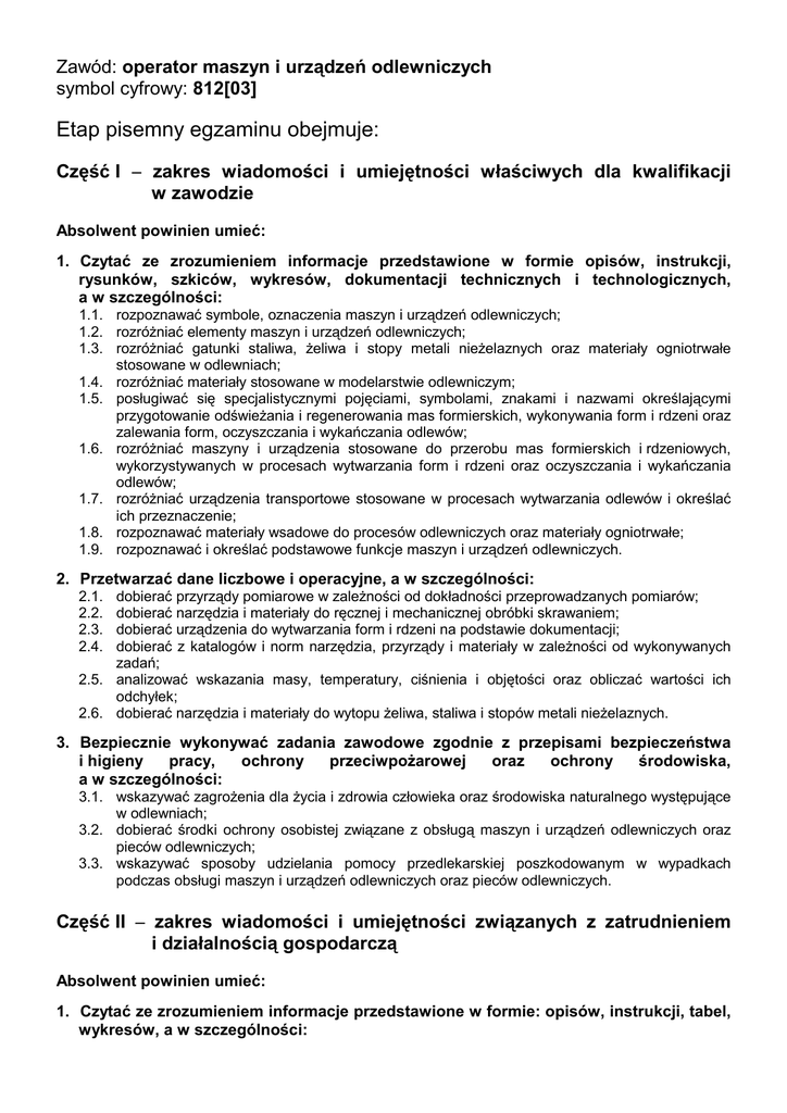 Zawód: operator maszyn i urządzeń odlewniczych symbol cyfrowy: 812[03] Etap pisemny egzaminu obejmuje: Część I − zakres wiadomości i umiejętności właściwych dla kwalifikacji w zawodzie Absolwent powinien umieć: 1. Czytać ze zrozumieniem informacje przedstawione w formie opisów, instrukcji, rysunków, szkiców, wykresów, dokumentacji technicznych i technologicznych, a w szczególności: 1.1. rozpoznawać symbole, oznaczenia maszyn i urządzeń odlewniczych; 1.2. rozróżniać elementy maszyn i urządzeń odlewniczych; 1.3. rozróżniać gatunki staliwa, żeliwa i stopy metali nieżelaznych oraz materiały ogniotrwałe stosowane w odlewniach; 1.4. rozróżniać materiały stosowane w modelarstwie odlewniczym; 1.5. posługiwać się specjalistycznymi pojęciami, symbolami, znakami i nazwami określającymi przygotowanie odświeżania i regenerowania mas formierskich, wykonywania form i rdzeni oraz zalewania form, oczyszczania i wykańczania odlewów; 1.6. rozróżniać maszyny i urządzenia stosowane do przerobu mas formierskich i rdzeniowych, wykorzystywanych w procesach wytwarzania form i rdzeni oraz oczyszczania i wykańczania odlewów; 1.7. rozróżniać urządzenia transportowe stosowane w procesach wytwarzania odlewów i określać ich przeznaczenie; 1.8. rozpoznawać materiały wsadowe do procesów odlewniczych oraz materiały ogniotrwałe; 1.9. rozpoznawać i określać podstawowe funkcje maszyn i urządzeń odlewniczych. 2. Przetwarzać dane liczbowe i operacyjne, a w szczególności: 2.1. 2.2. 2.3. 2.4. dobierać przyrządy pomiarowe w zależności od dokładności przeprowadzanych pomiarów; dobierać narzędzia i materiały do ręcznej i mechanicznej obróbki skrawaniem; dobierać urządzenia do wytwarzania form i rdzeni na podstawie dokumentacji; dobierać z katalogów i norm narzędzia, przyrządy i materiały w zależności od wykonywanych zadań; 2.5. analizować wskazania masy, temperatury, ciśnienia i objętości oraz obliczać wartości ich odchyłek; 2.6. dobierać narzędzia i materiały do wytopu żeliwa, staliwa i stopów metali nieżelaznych. 3. Bezpiecznie wykonywać zadania zawodowe zgodnie z przepisami bezpieczeństwa i higieny pracy, ochrony przeciwpożarowej oraz ochrony środowiska, a w szczególności: 3.1. wskazywać zagrożenia dla życia i zdrowia człowieka oraz środowiska naturalnego występujące w odlewniach; 3.2. dobierać środki ochrony osobistej związane z obsługą maszyn i urządzeń odlewniczych oraz pieców odlewniczych; 3.3. wskazywać sposoby udzielania pomocy przedlekarskiej poszkodowanym w wypadkach podczas obsługi maszyn i urządzeń odlewniczych oraz pieców odlewniczych. Część II − zakres wiadomości i umiejętności związanych z zatrudnieniem i działalnością gospodarczą Absolwent powinien umieć: 1. Czytać ze zrozumieniem informacje przedstawione w formie: opisów, instrukcji, tabel, wykresów, a w szczególności: 812[03] Operator maszyn i urządzeń odlewniczych 1.1. rozróżniać podstawowe pojęcia i terminy z obszaru funkcjonowania gospodarki oraz prawa pracy, prawa podatkowego i przepisów regulujących podejmowanie i wykonywanie działalności gospodarczej; 1.2. rozróżniać dokumenty związane z zatrudnieniem oraz podejmowaniem i wykonywaniem działalności gospodarczej; 1.3. identyfikować i analizować informacje dotyczące wymagań i uprawnień pracownika, pracodawcy, bezrobotnego i klienta. 2. Przetwarzać dane liczbowe i operacyjne, a w szczególności: 2.1. analizować informacje związane z podnoszeniem kwalifikacji, poszukiwaniem pracy i zatrudnieniem oraz podejmowaniem i wykonywaniem działalności gospodarczej; 2.2. sporządzać dokumenty związane z poszukiwaniem pracy i zatrudnieniem oraz podejmowaniem i wykonywaniem działalności gospodarczej; 2.3. rozróżniać skutki wynikające z nawiązania i rozwiązania stosunku pracy. Etap praktyczny egzaminu obejmuje praktyczne umiejętności z zakresu kwalifikacji w zawodzie, objęte tematami: 1. Wykonanie określonych prac związanych z obsługą maszyn do wytwarzania form, rdzeni lub urządzeń do oczyszczania i wykańczania odlewów. 2. Wykonanie określonych prac związanych z przygotowaniem wsadu lub obsługi pieców odlewni metali. Absolwent powinien umieć: 1. Planować czynności związane z wykonaniem zadania: 1.1. sporządzić plan działania; 1.2. sporządzić wykaz niezbędnych surowców, materiałów, sprzętu kontrolno-pomiarowego, narzędzi; 1.3. wykonać niezbędne obliczenia, rysunki lub szkice pomocnicze. 2. Organizować stanowisko pracy: 2.1. zgromadzić i rozmieścić na stanowisku pracy materiały, narzędzia, urządzenia i sprzęt, zgodnie z zasadami bezpieczeństwa i higieny pracy oraz ochrony przeciwpożarowej; 2.2. sprawdzić stan techniczny maszyn, urządzeń i sprzętu; 2.3. dobrać odzież roboczą i środki ochrony indywidualnej. 3. Wykonać zadanie egzaminacyjne z zachowaniem przepisów bezpieczeństwa i higieny pracy, ochrony przeciwpożarowej oraz ochrony środowiska i wykazać się umiejętnościami objętymi tematami: 3.1. Wykonanie określonych prac związanych z obsługą maszyn do wytwarzania form, rdzeni lub urządzeń do oczyszczania i wykańczania odlewów: 3.1.1. wykonać czynności związane z obsługą maszyn do wytwarzania form, rdzeni, urządzeń do oczyszczania i wykańczania odlewów; 3.1.2. sprawdzić działanie maszyn i urządzeń do wytwarzania form, rdzeni, czyszczenia i wykańczania odlewów (test pracy); 3.1.3. uzbroić maszyny i urządzenia w wymagane do wykonania zadania oprzyrządowanie technologiczne; 3.1.4. obsługiwać i sterować pracą maszyn i urządzeń do wytwarzania, czyszczenia lub wykańczania form, rdzeni, odlewów; 3.1.5. kontrolować na bieżąco jakość pracy i usuwać usterki; 3.1.6. utrzymywać ład i porządek na stanowisku pracy; 2 812[03] Operator maszyn i urządzeń odlewniczych 3.1.7. wykonać zadanie w przewidzianym czasie; 3.1.8. uporządkować stanowisko pracy,