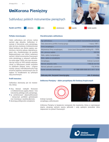 29 lutego 2012 r. str. 1 UniKorona Pieniężny Subfundusz polskich instrumentów pieniężnych Ryzyko portfela: minimalne Polityka inwestycyjna Celem subfunduszu jest ochrona realnej wartości jego aktywów. Subfundusz inwestuje w instrumenty rynku pieniężnego, takie jak bony skarbowe, krótkoterminowe lokaty bankowe oraz dłużne papiery wartościowe o terminie wykupu nieprzekraczającym roku, charakteryzujące się wysokim bezpieczeństwem oraz niskimi wahaniami wartości. Udział instrumentów finansowych rynku pieniężnego w aktywach subfunduszu może sięgać 100%, przy czym nie powinien być niższy niż 70% wartości aktywów. Lokaty są dokonywane przede wszystkim na podstawie bieżącej oceny i prognoz rozwoju sytuacji makroekonomicznej kraju eminenta papierów wartościowych oraz ich wpływu na kształtowanie się rynkowych stóp procentowych. niskie umiarkowane wysokie bardzo wysokie Charakterystyka subfunduszu Typ subfunduszu subfundusz polskich instrumentów pieniężnych Data utworzenia portfela inwestycyjnego Firma zarządzająca Akcjonariusz firmy zarządzającej 1 marca 1997 r. Union Investment TFI S.A. Union Asset Management Holding AG – 100% Min. pierwsza wpłata 100 PLN Maks. opłata manipulacyjna 0% Maks. opłata za zarządzanie 1,5% Zarządzający Andrzej Czarnecki Wartość aktywów netto 1769,56 mln PLN Wartość jednostki uczestnictwa Numer rachunku bankowego Zalecany min. horyzont inwestycyjny: 176,79 PLN 43 1880 0009 0000 0013 0017 5018 min. 6 miesięcy Profil inwestora UniKorona Pieniężny – dobre perspektywy dla funduszy bezpiecznych Subfundusz skierowany jest do inwestorów, którzy: •chcą lokować nadwyżki finansowe w krótkoterminowe papiery dłużne i inne instrumenty polskiego rynku pieniężnego, •są zainteresowani zdywersyfikowanym i elastycznym portfelem gotówkowym oraz inwestycją o wysokiej płynności, •doceniają profesjonalne zarządzanie. Andrzej Czarnecki, zarządzający subfunduszem UniKorona Pieniężny to bezpieczne rozwiązanie dla inwestorów, którzy w najmniejszym stopniu akceptują wahania wyceny jednostek i wolą spokojnie przeczekać okres niepewności na rynkach finansowych. 29 lutego 2012 r. str. 2 UniKorona Pieniężny Subfundusz polskich instrumentów pieniężnych Ryzyko portfela: minimalne niskie umiarkowane wysokie bardzo wysokie Wyniki inwestycyjne subfunduszu i benchmarku* 1m 3m 6m 1 rok 2 lata 5 lat 10 lat UniKorona Pieniężny (%) 1,13 2,84 2,93 5,62 10,91 32,20 75,35 Benchmark (%) 0,41 1,25 2,39 4,55 9,25 26,65 49,43 Różnica 0,72 1,59 0,53 1,07 1,66 5,55 25,92 * Stopy zwrotu subfunduszu i benchmarku obliczane są na podstawie ostatnich dni roboczych miesiąca. Zmiana wartości jednostki w porównaniu z benchmarkiem UniKorona Pieniężny Benchmark UniKorona Pieniężny 134 129 124 119 114 109 104 99 Lut ’06 Lip ’07 Lis ’08 Kwi ’10 Alokacja aktywów Sie ’11 Benchmark1 Bony i obligacje skarbowe Komercyjne instrumenty dłużne 51,34% 48,66% 0 20 40 60 80 100 Średnie oprocentowanie od 1- do 3-miesięcznych depozytów złotowych oferowanych przez banki komercyjne gospodarstwom domowym w Polsce (źródło: NBP) ¹ Wzorcowy portfel, który stanowi punkt odniesienia do dokonywania oceny wyników zarządzania aktywami funduszu. 29 lutego 2012 r. str. 3 UniKorona Pieniężny Subfundusz polskich instrumentów pieniężnych Ryzyko portfela: minimalne niskie umiarkowane Struktura walutowa bardzo wysokie Słowniczek PLN USD EUR 100,93% 0,01% -0,94% 0 20 Współczynniki ryzyka 12 m Beta do WIG 0,03 Duration (w latach)* 1,20 * Dane na dzień 31.10.2011 r. wysokie 40 60 80 100 Beta do WIG – współczynnik ten pokazuje zależność pomiędzy zmianami wartości jednostki funduszu a zmianami indeksu WIG. Wskaźnik beta wynoszący 1 oznacza, że zmiany wartości jednostki funduszu są takie same jak indeksu WIG. Beta o wartości mniejszej niż 1 oznacza, że wzrost (spadek) benchmarku o 1% jest zazwyczaj powiązany ze wzrostem (spadkiem) wartości indeksu WIG o mniej niż 1%. Wartość beta większa niż 1 oznacza, że wzrost (spadek) indeksu WIG o 1% jest zazwyczaj powiązany ze wzrostem (spadkiem) wartości jednostki funduszu o więcej niż 1%. Duration – współczynnik ten pokazuje, jak zmienia się wartość części dłużnej funduszu w reakcji na zmianę stóp procentowych. Im wyższe duration, tym wyższy wpływ zmian stóp procentowych na zmianę wartości jednostki funduszu, czyli tym wyższe ryzyko z nim związane. 29 lutego 2012 r. str. 4 UniKorona Pieniężny Subfundusz polskich instrumentów pieniężnych Ryzyko portfela: minimalne niskie umiarkowane wysokie bardzo wysokie Przedstawiane informacje finansowe dotyczą wskazanego okresu i nie gwarantują podobnych wyników w przyszłości. Brak gwarancji osiągnięcia celów inwestycyjnych subfunduszy; możliwość zmniejszenia wartości zainwestowanych środków. Duża zmienność wartości aktywów netto: UniAkcje Małych i Średnich Spółek, UniAkcje Sektory Wzrostu, UniAkcje: Nowa Europa, UniKorona Akcje, UniKorona Zrównoważony, UniStabilny Wzrost, UniObligacje: Nowa Europa w UniFundusze FIO oraz UniTotal Trend i UniObligacje Aktywny w UniFundusze SFIO. Możliwe lokaty ponad 35% wartości aktywów UniKorona Pieniężny, UniKorona Obligacje, UniBezpieczna Alokacja, UniStabilny Wzrost, UniKorona Zrównoważony, UniLokata w papiery wartościowe emitowane, poręczane lub gwarantowane przez Skarb Państwa albo Narodowy Bank Polski, a w przypadku UniDolar Pieniężny oraz UniObligacje: Nowa Europa także w papiery wartościowe emitowane, poręczane lub gwarantowane przez: Australię, Austrię, Belgię, Bułgarię, Czechy, Cypr, Danię, Estonię, Finlandię, Francję, Grecję, Hiszpanię, Holandię, Irlandię, Islandię, Japonię, Kanadę, Koreę Południową, Litwę, Luksemburg, Łotwę, Maltę, Meksyk, Niemcy, Norwegię, Nową Zelandię, Polskę, Portugalię, Rumunię, Słowację, Słowenię, Stany Zjednoczone, Szwajcarię, Szwecję, Turcję, Węgr