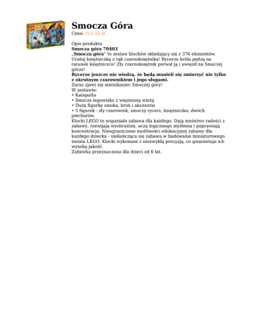 Smocza Góra Cena: 212.52 zł Opis produktu Smocza góra 70403 „Smocza góra” to zestaw klocków składający się z 376 elementów. Uratuj księżniczkę z rąk czarnoksiężnika! Rycerze króla pędzą na ratunek księżniczce! Zły czarnoksiężnik porwał ją i uwięził na Smoczej górze! Rycerze jeszcze nie wiedzą, że będą musieli się zmierzyć nie tylko z okrutnym czarownikiem i jego sługami. Zaraz zjawi się mieszkaniec Smoczej góry! W zestawie: • Katapulta • Smocze legowisko z więzienną wieżą • Dużą figurkę smoka, broń i akcesoria • 5 figurek - zły czarownik, smoczy rycerz, księżniczka, dwóch piechurów. Klocki LEGO to wspaniała zabawa dla każdego. Dają mnóstwo radości z zabawy, rozwijają wyobraźnię, uczą logicznego myślenia i poprawiają koncentrację. Nieograniczone możliwości edukacyjnej zabawy dla każdego dziecka - niekończąca się zabawa w budowanie miniaturowego świata LEGO. Klocki wykonane z niezwykłą precyzją, co gwarantuje ich wysoką jakość. Zabawka przeznaczona dla dzieci od 6 lat.
